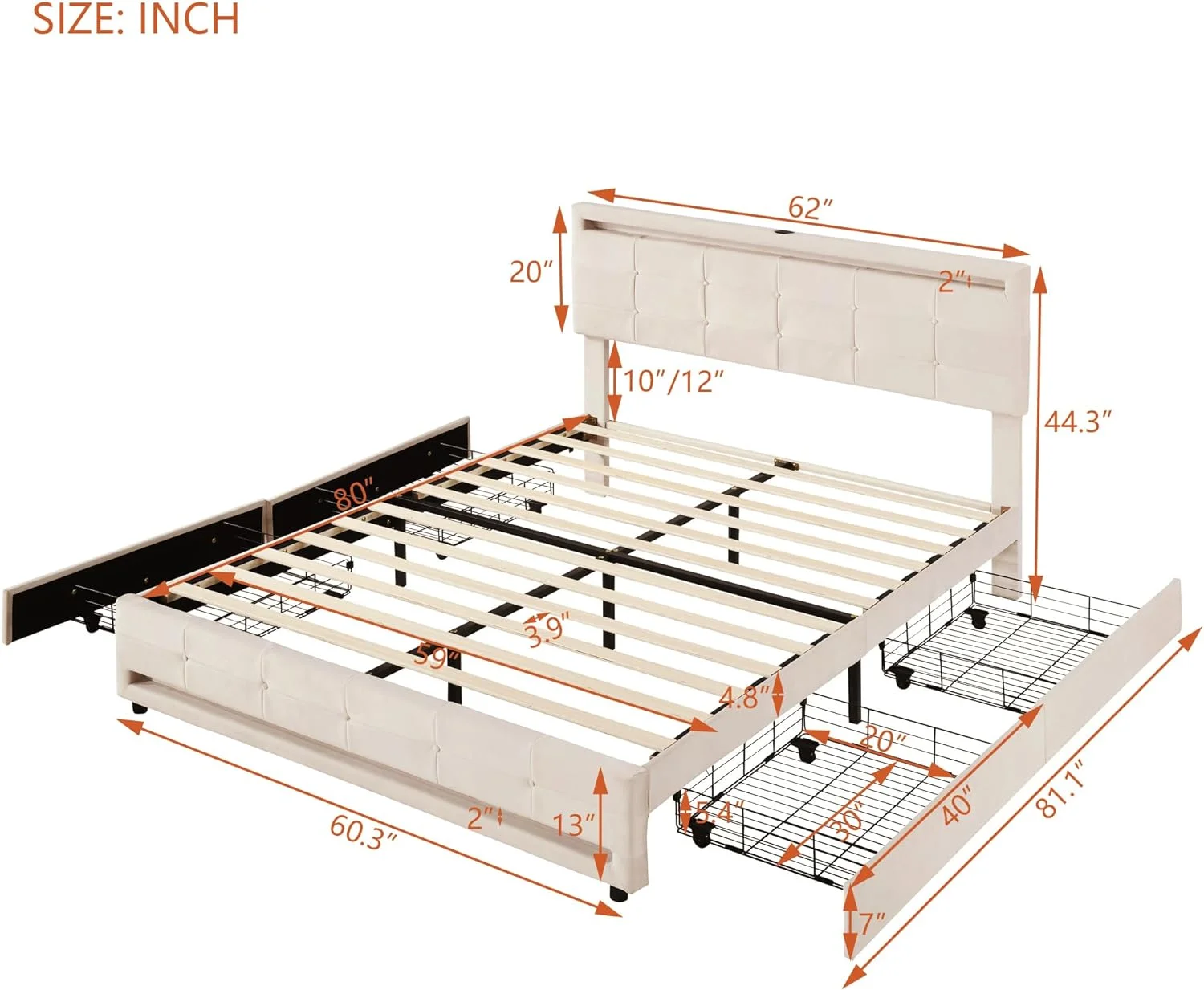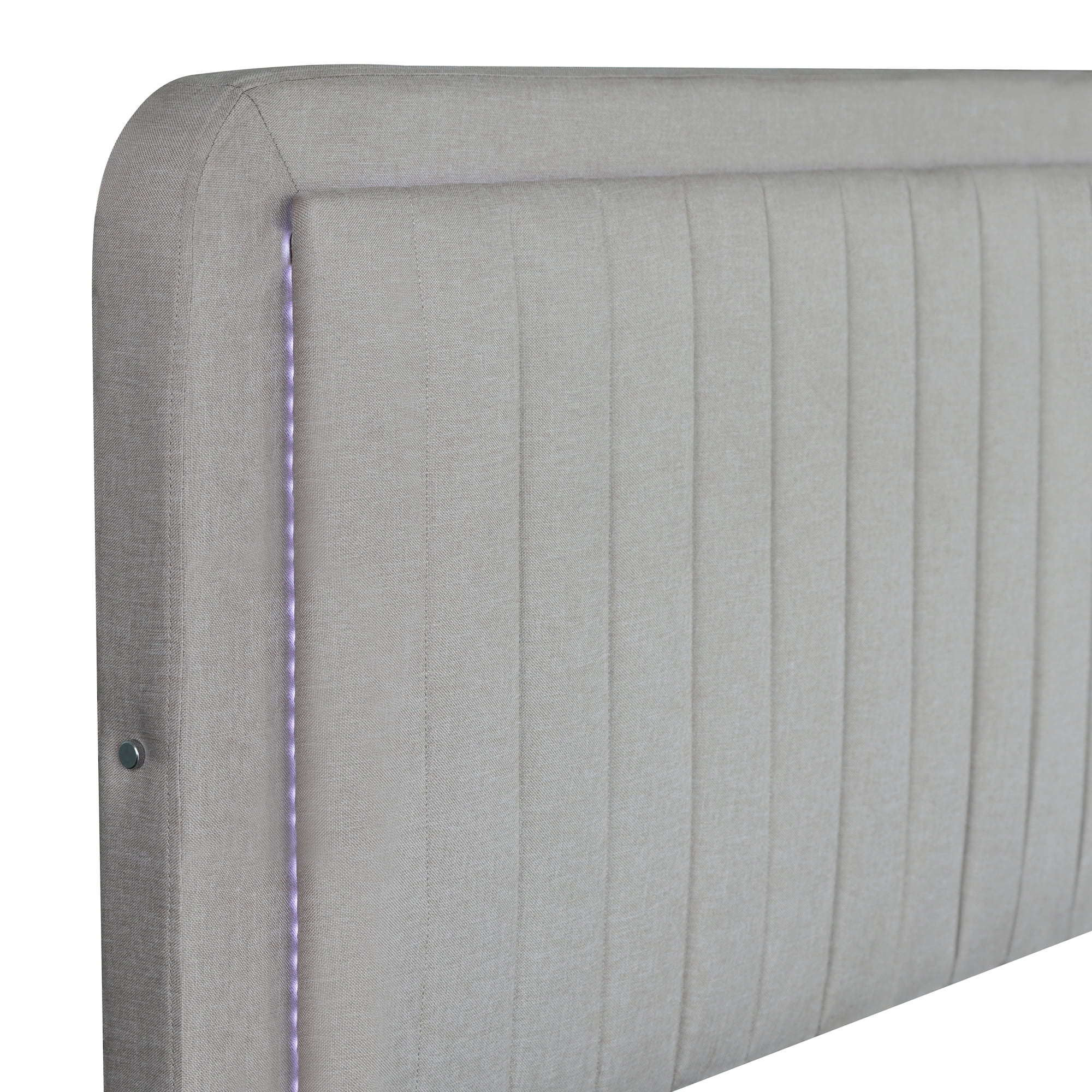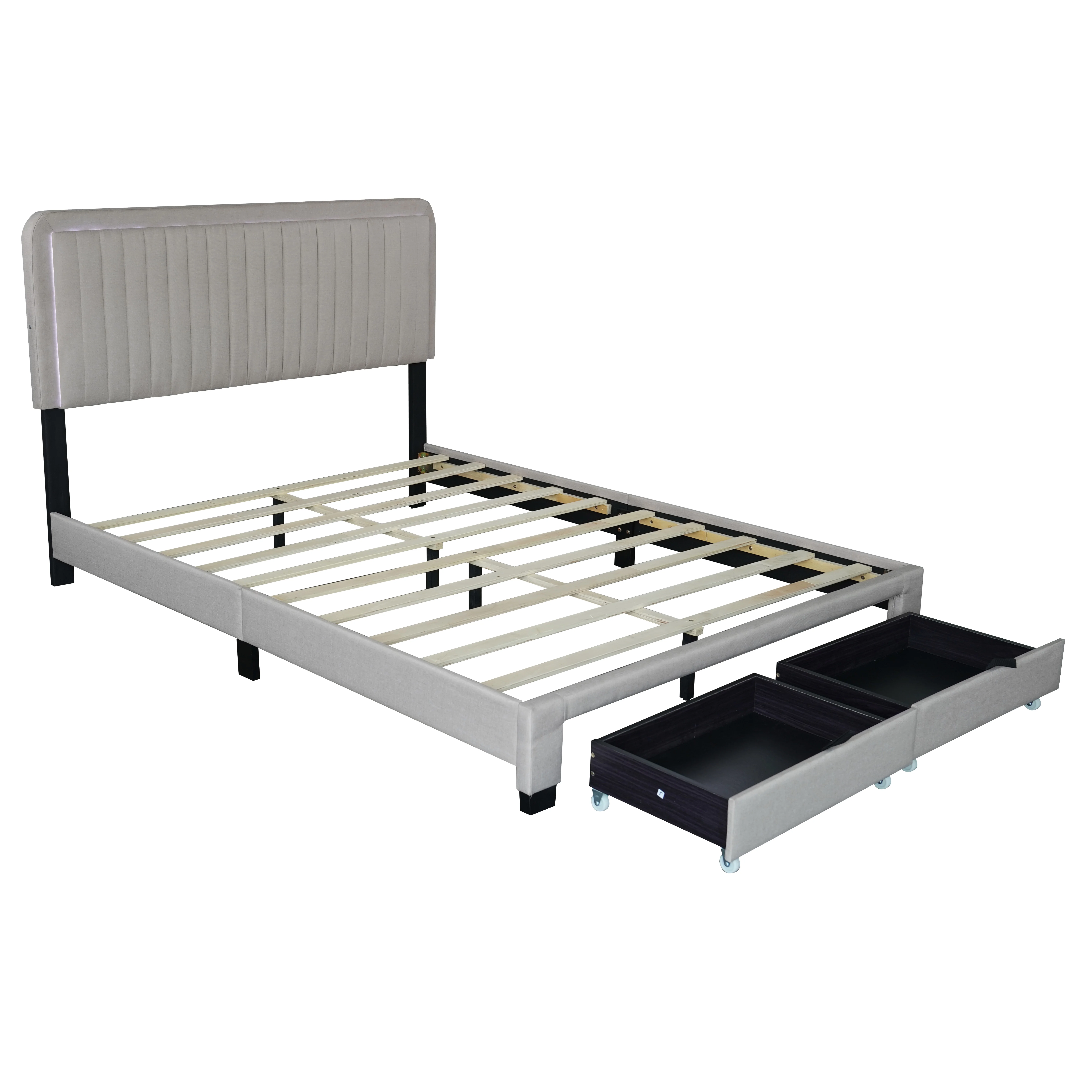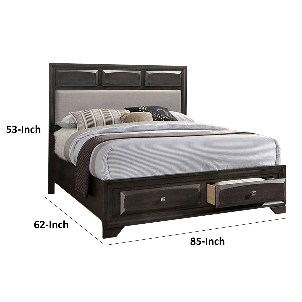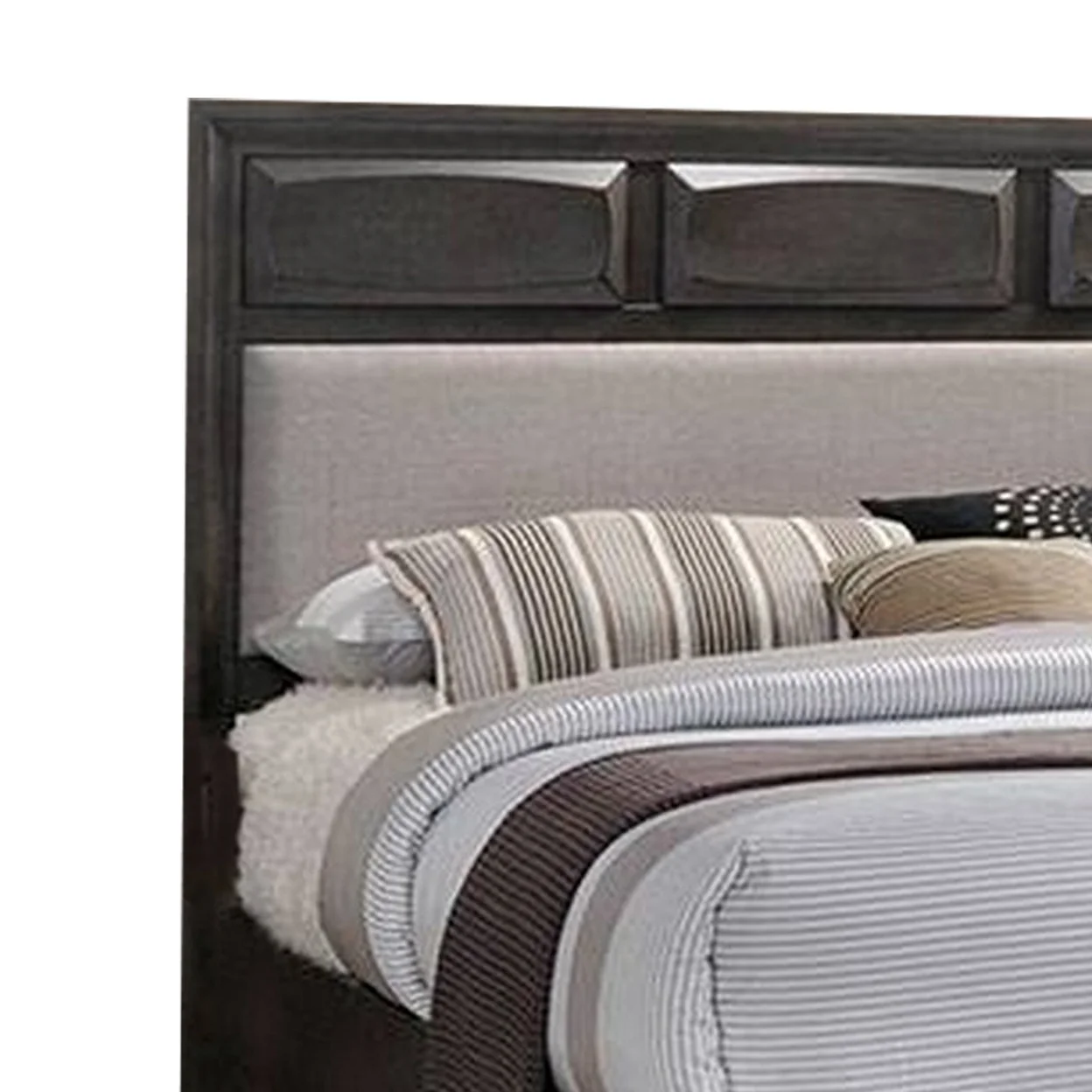 Kevi Queen Size Bed Beige Fabric Upholstered Headboard Storage Oak Gray- Saltoro Sherpi