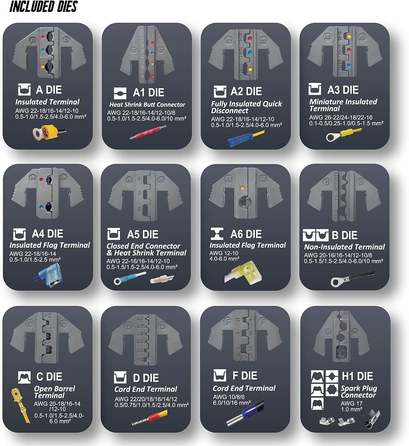Interchangeable Ratcheting Terminal Crimper Set - 12 Sets With Wire Strippers (Insulated, Non-Insulated, Open Barrel)
