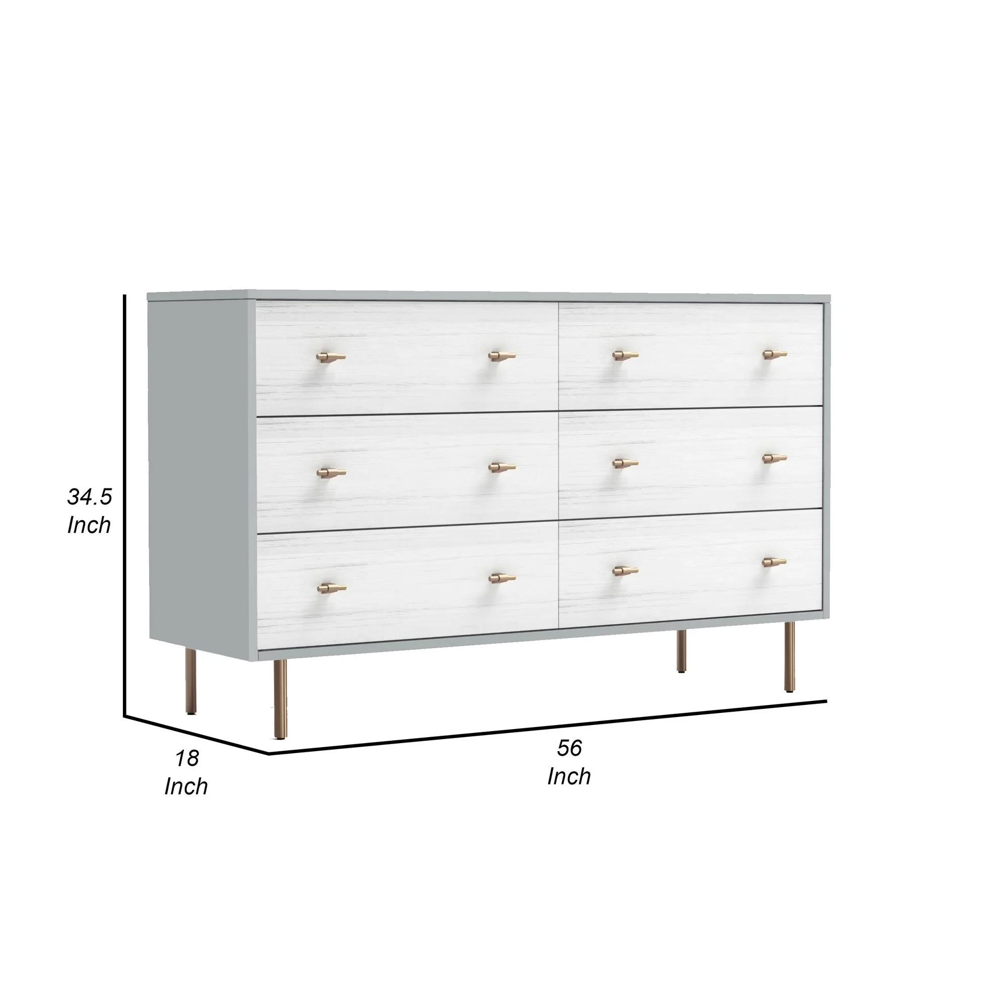 Benjara Dap 56 Inch 6 Drawer Dresser, Sleek Satin Gold Handles, White and Gray
