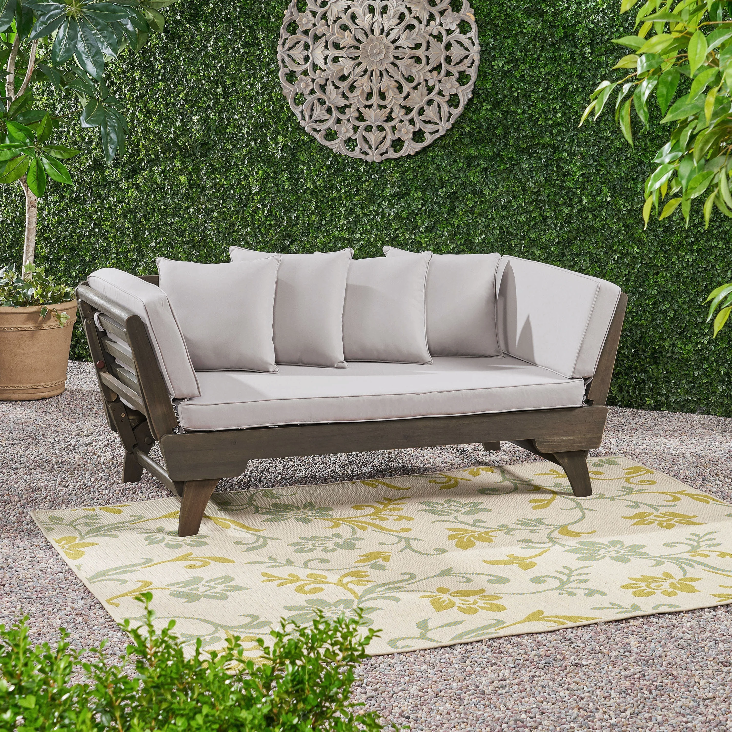 Noble House Lainey Outdoor 3-Seater Acacia Wood Daybed, Teak, Light Gray