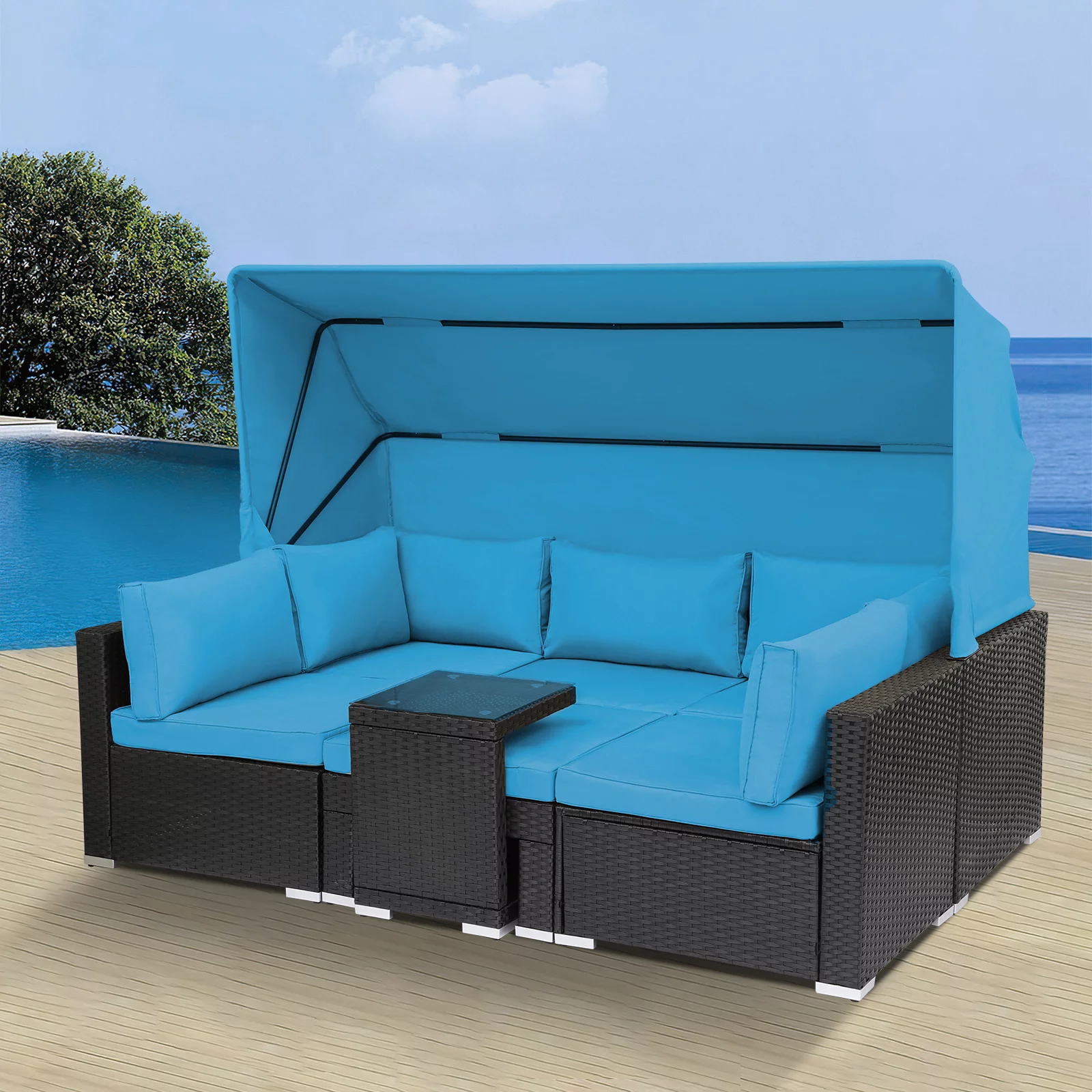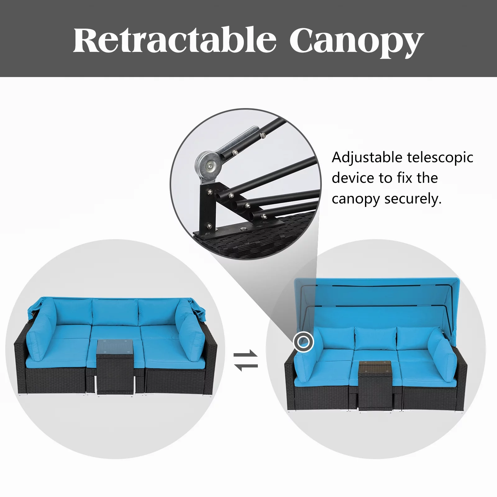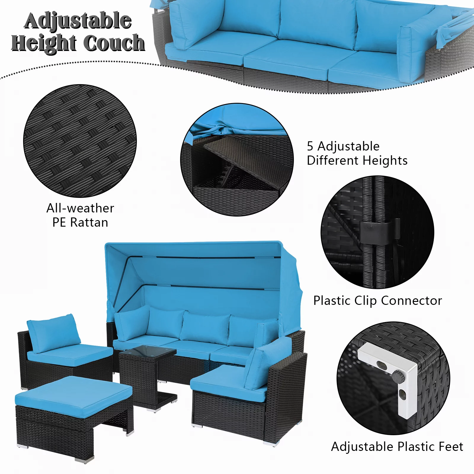 Magic Union 7 Piece Outdoor Sectional Sofa Set Patio Rattan Daybed with Retractable Canopy, Blue