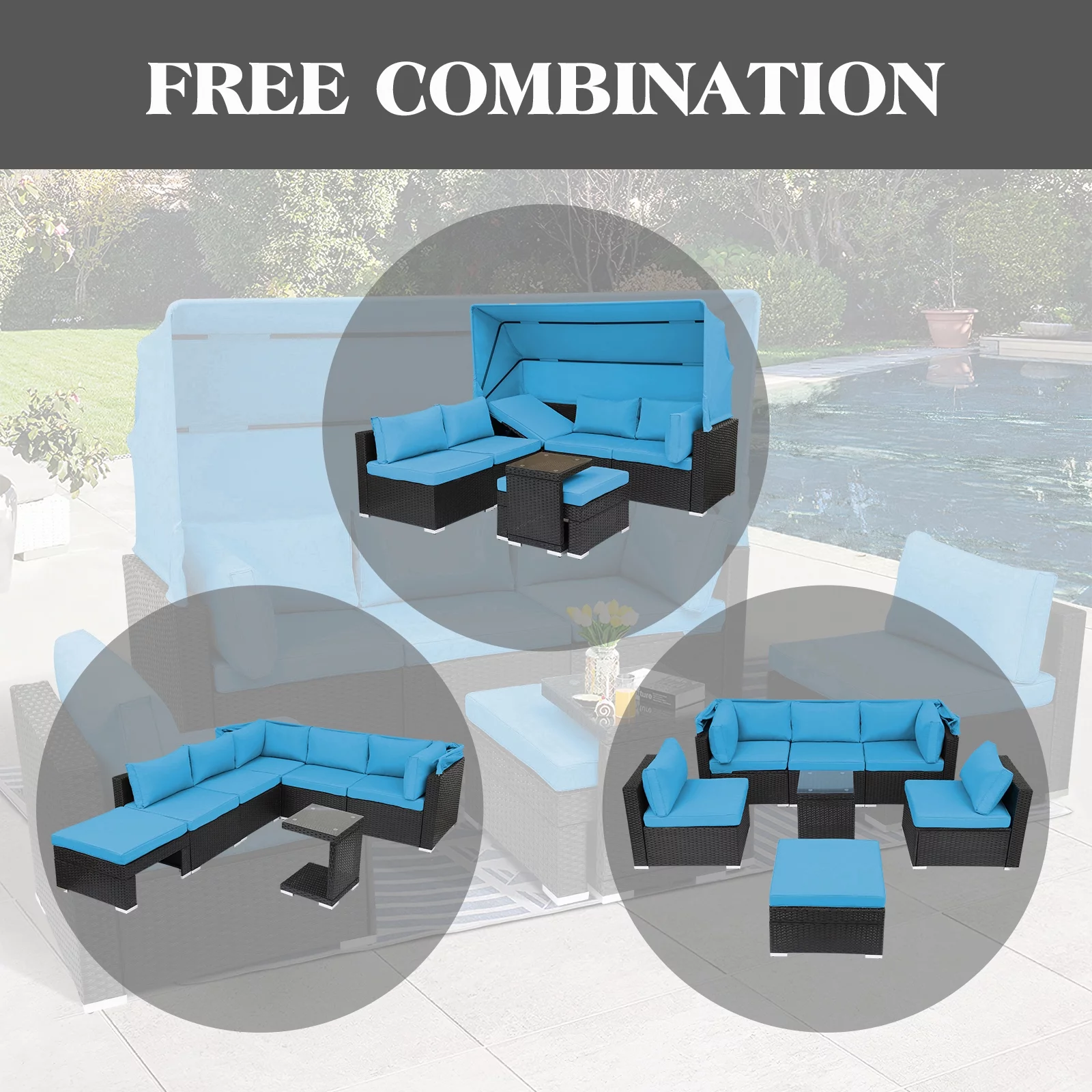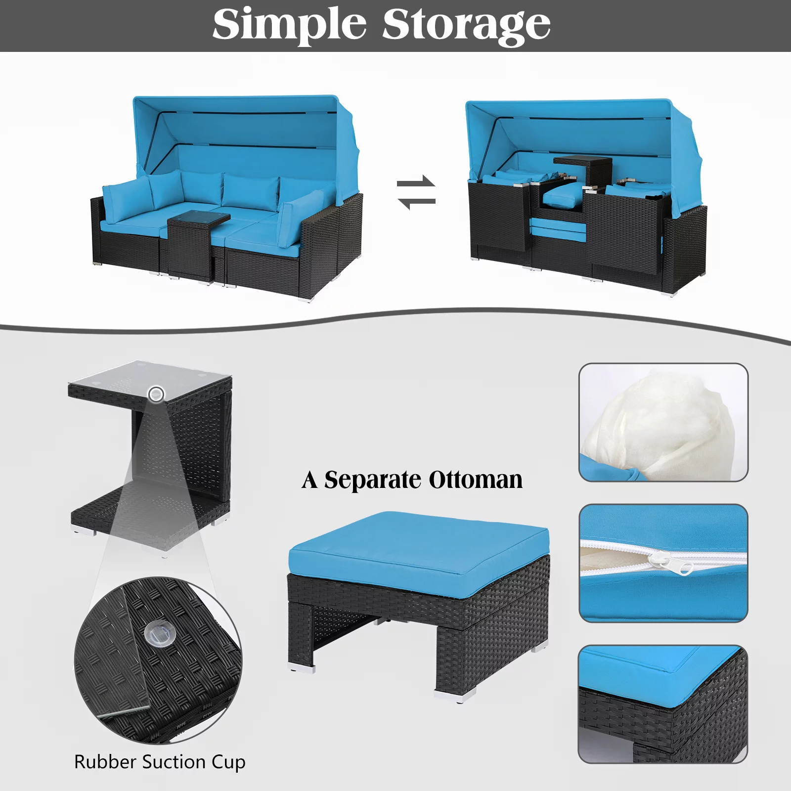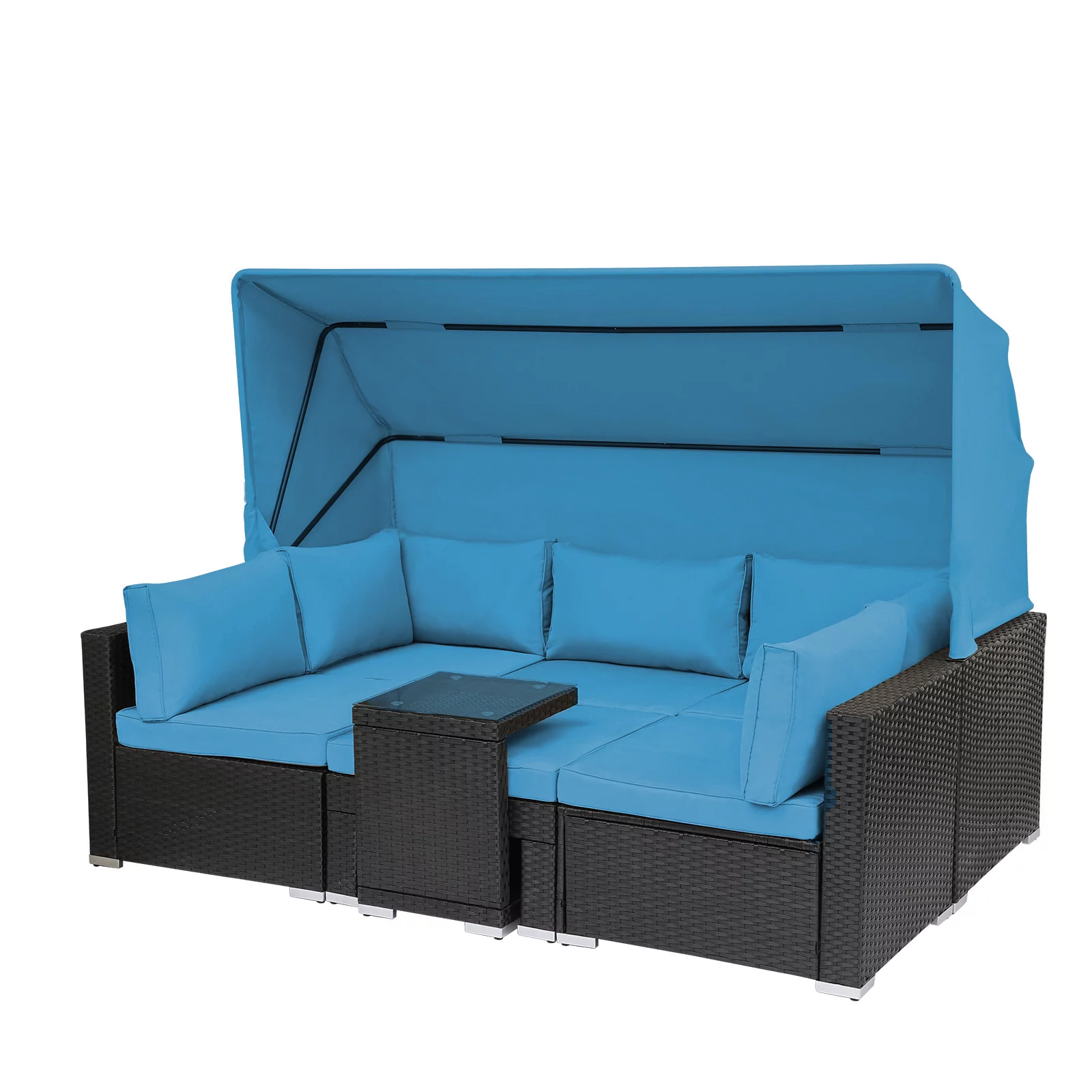 Magic Union 7 Piece Outdoor Sectional Sofa Set Patio Rattan Daybed with Retractable Canopy, Blue