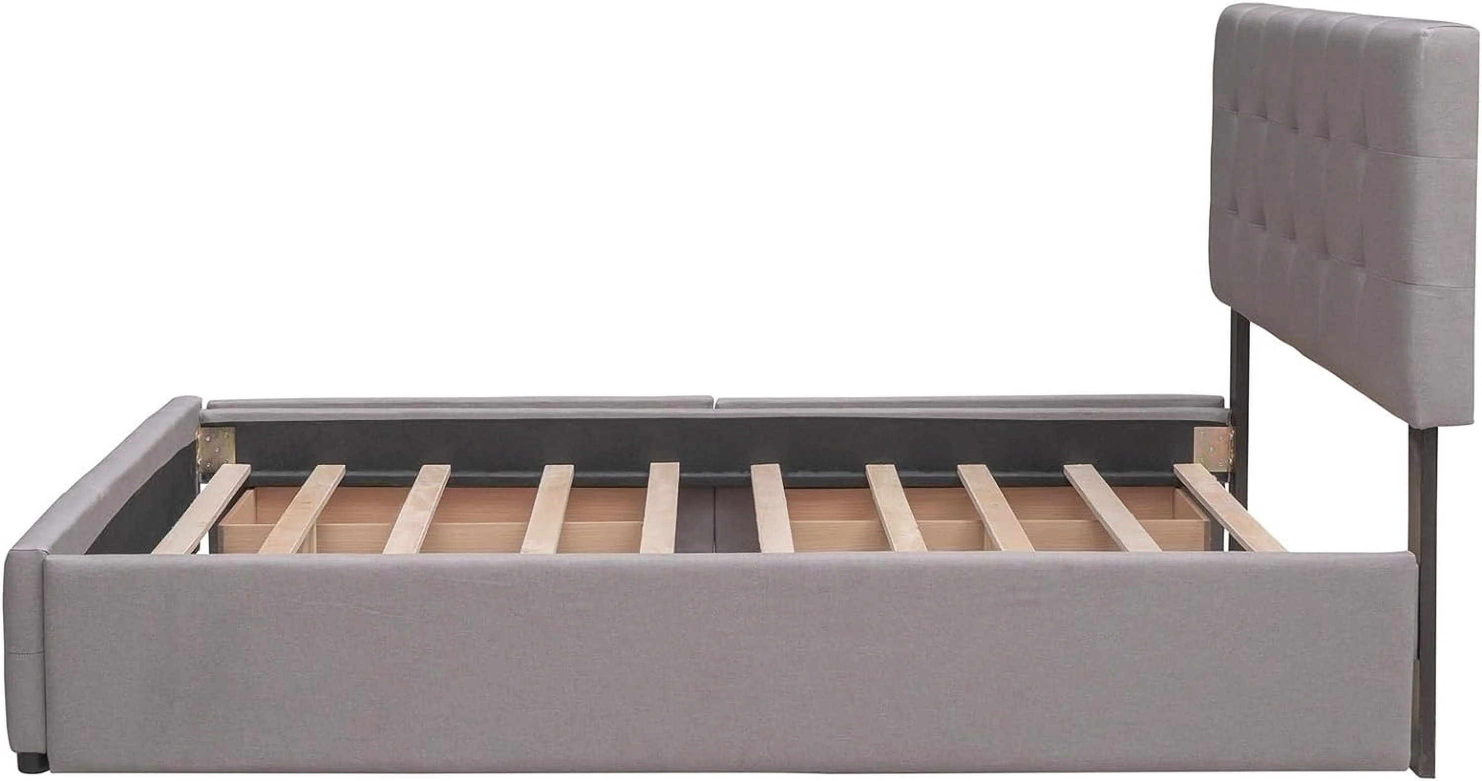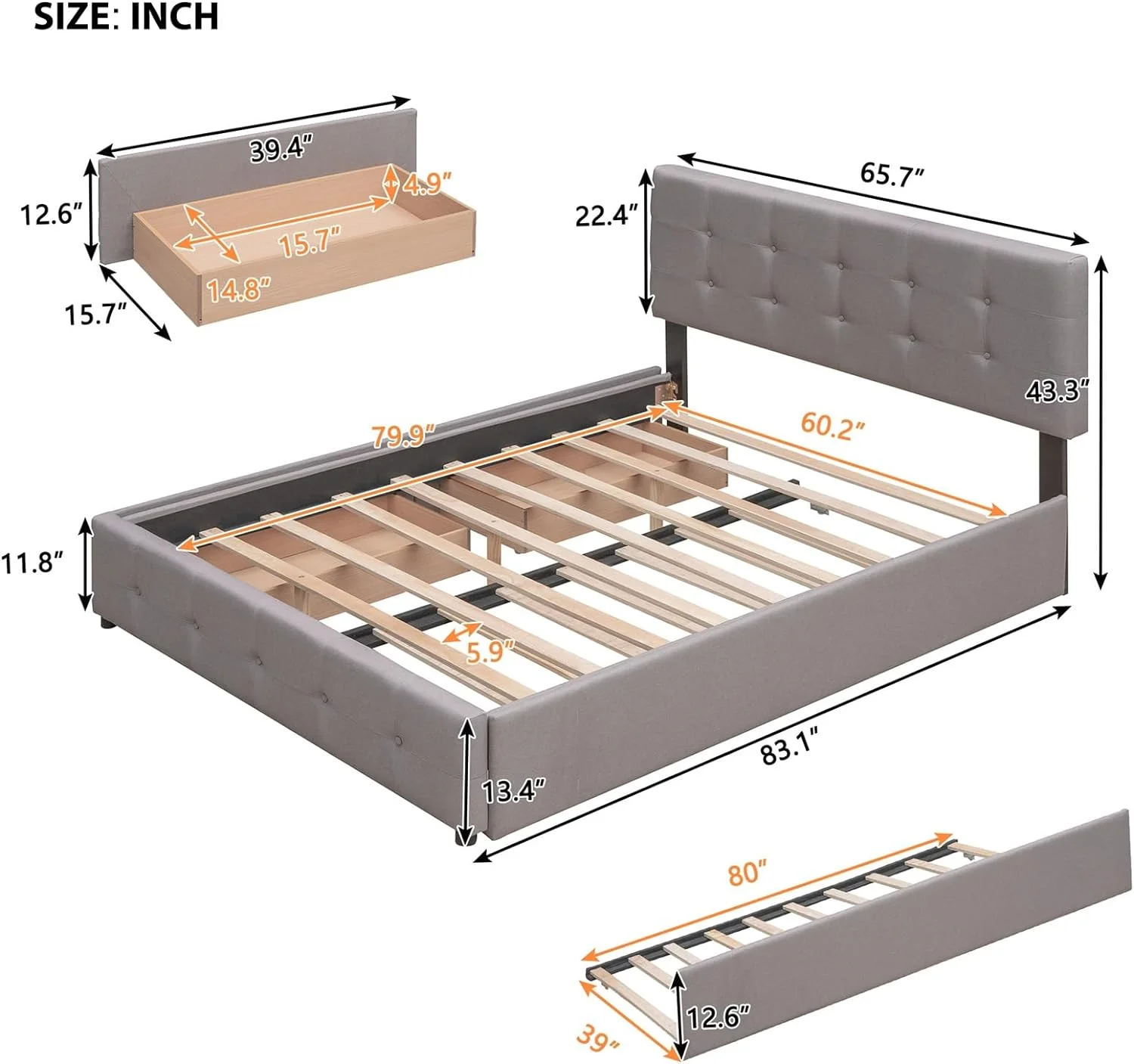 Upholstered Platform Bed with 2 Drawers and 1 Twin XL Trundle, Linen Fabric, Queen Size