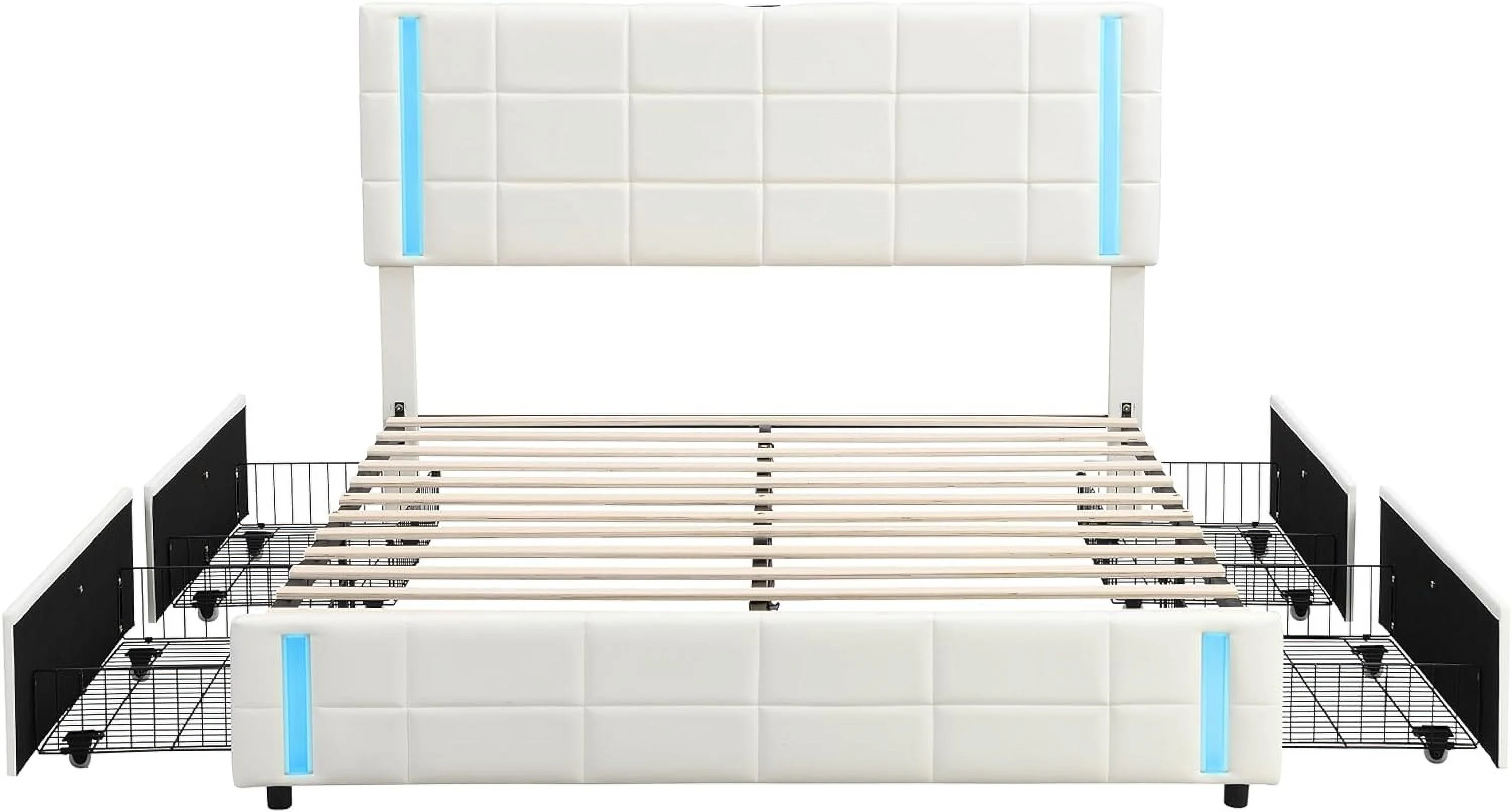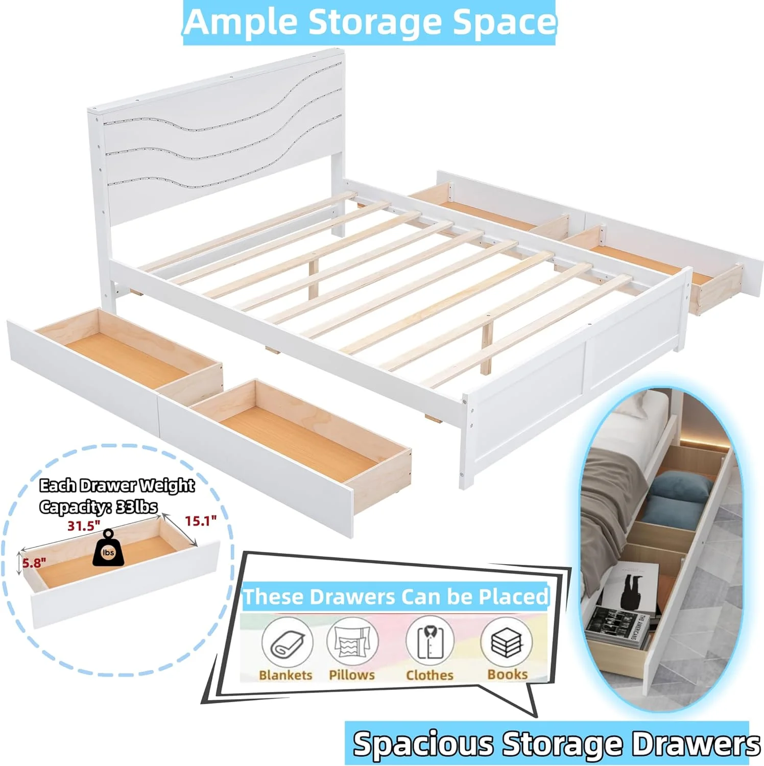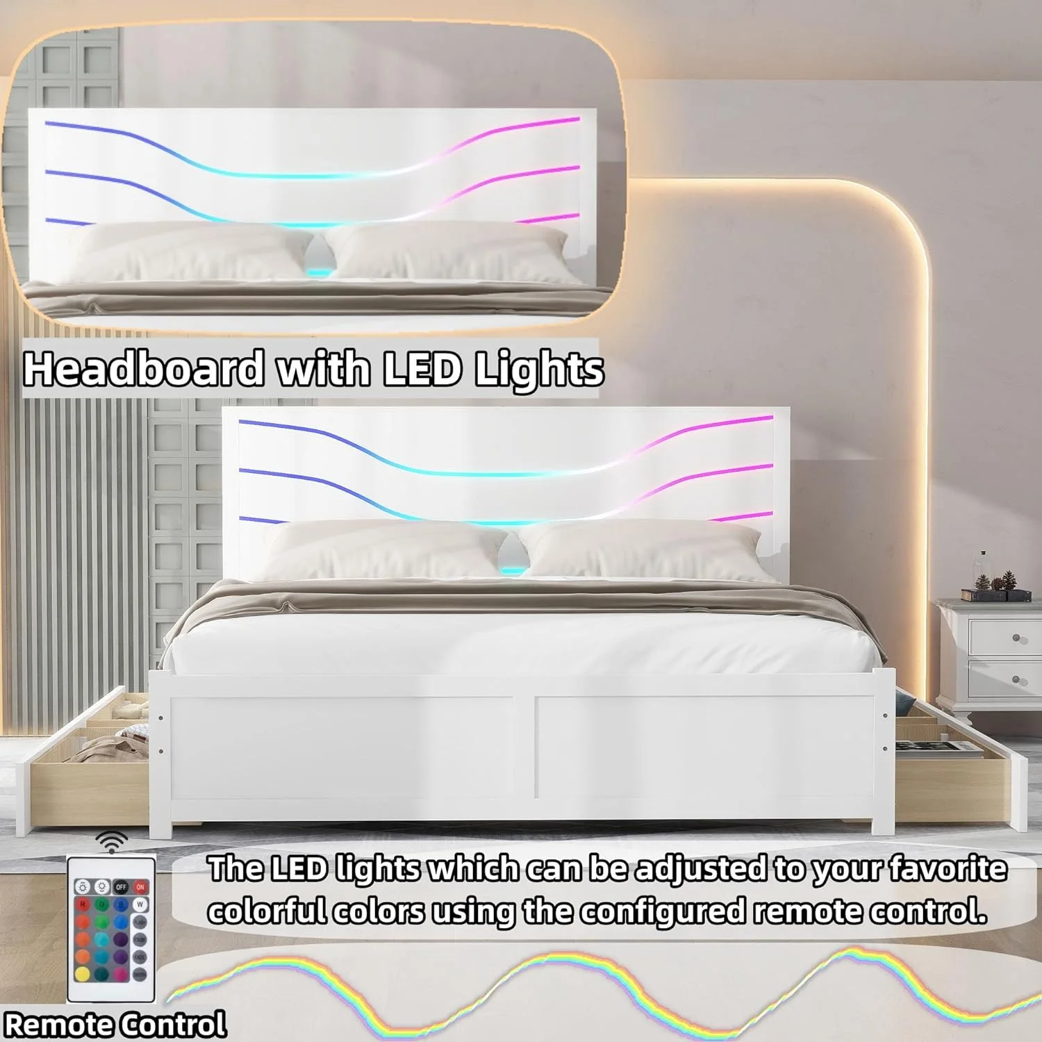 Quee Size Bed Frame With Headboard Ad LED Lights, Wood Platform Bed With 4 Storage Drawers, White