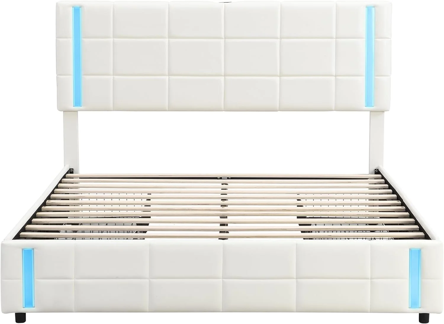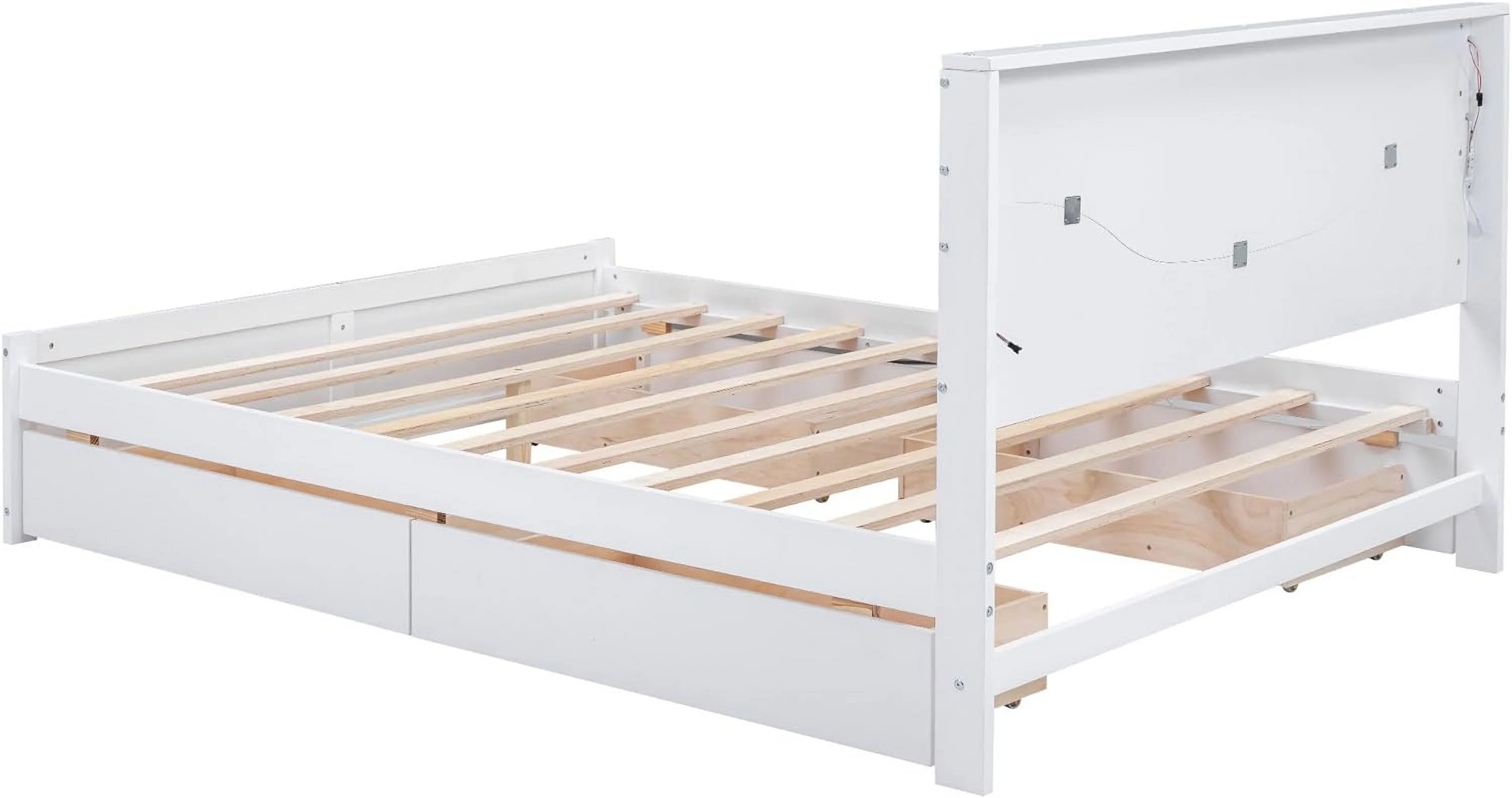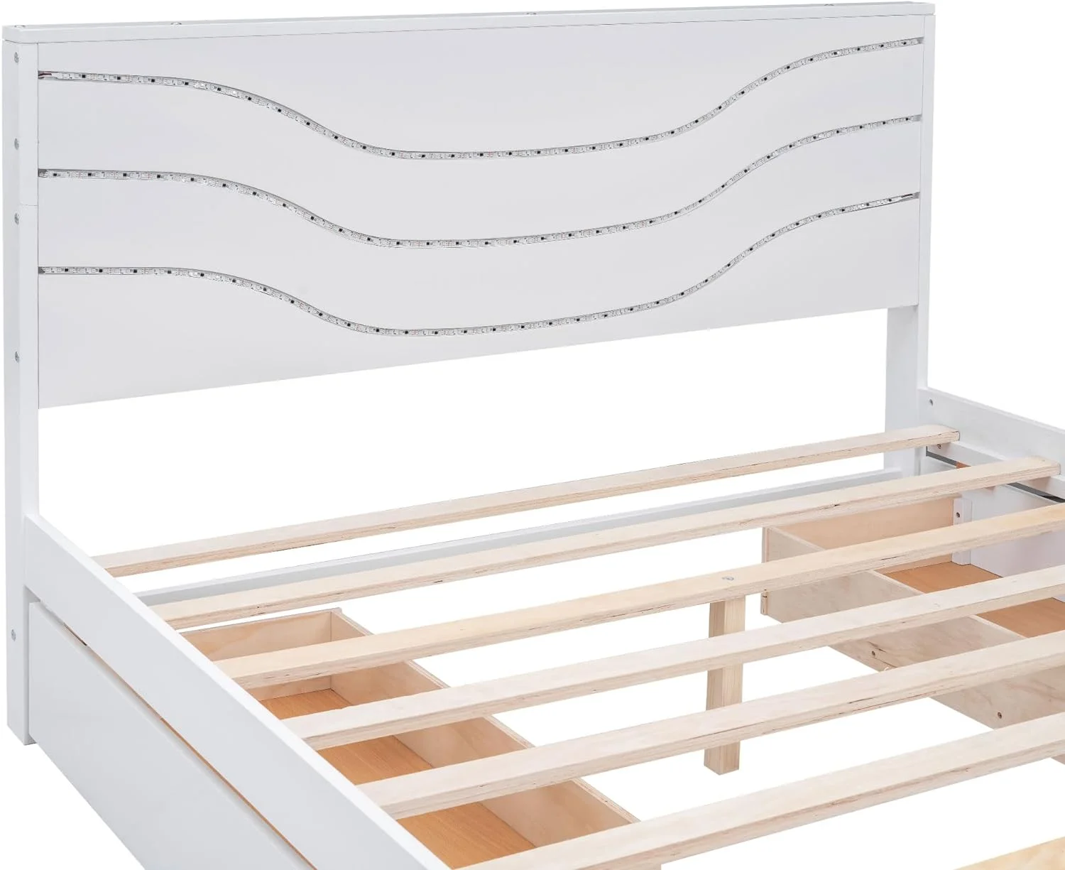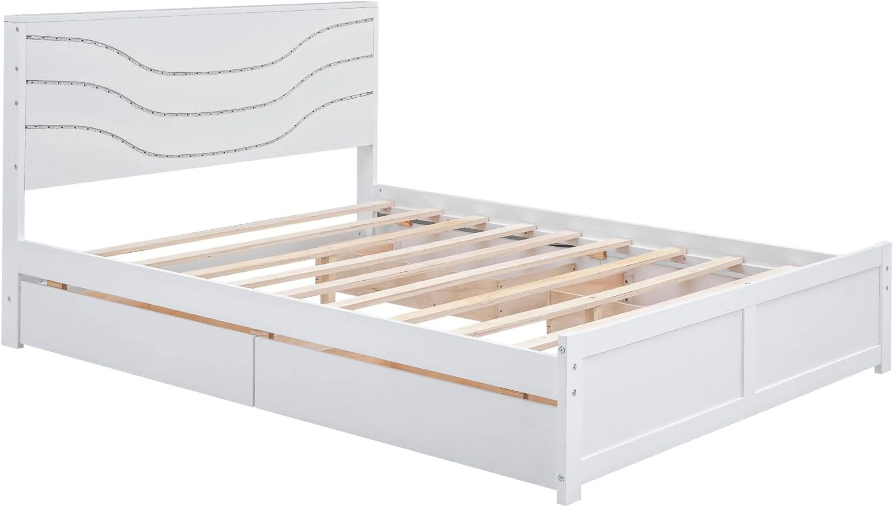 Quee Size Bed Frame With Headboard Ad LED Lights, Wood Platform Bed With 4 Storage Drawers, White