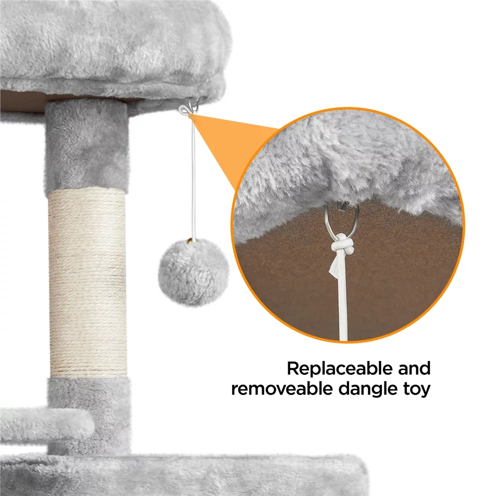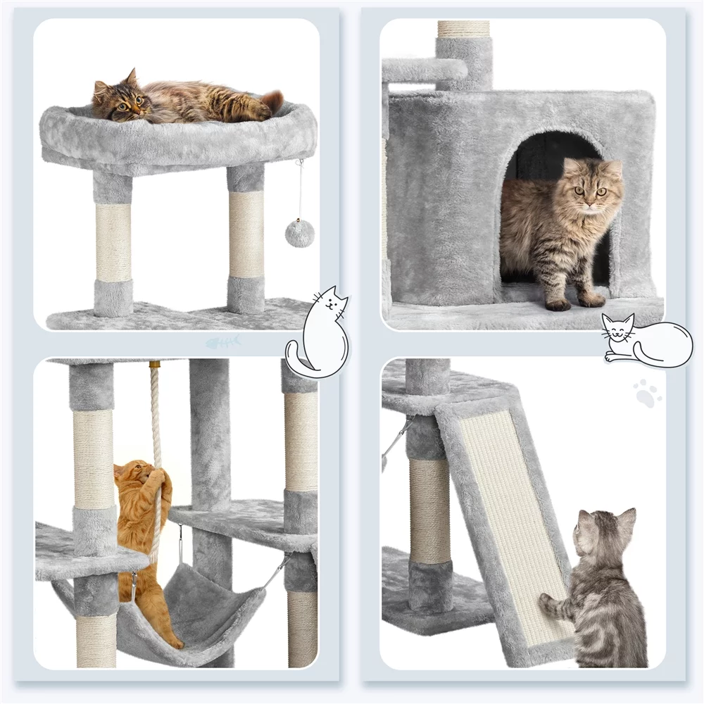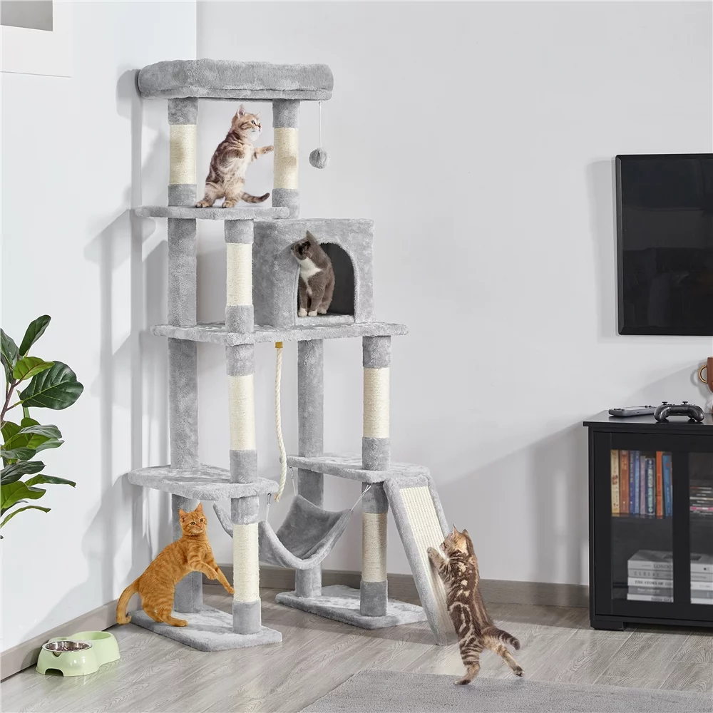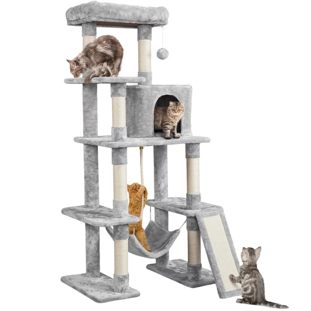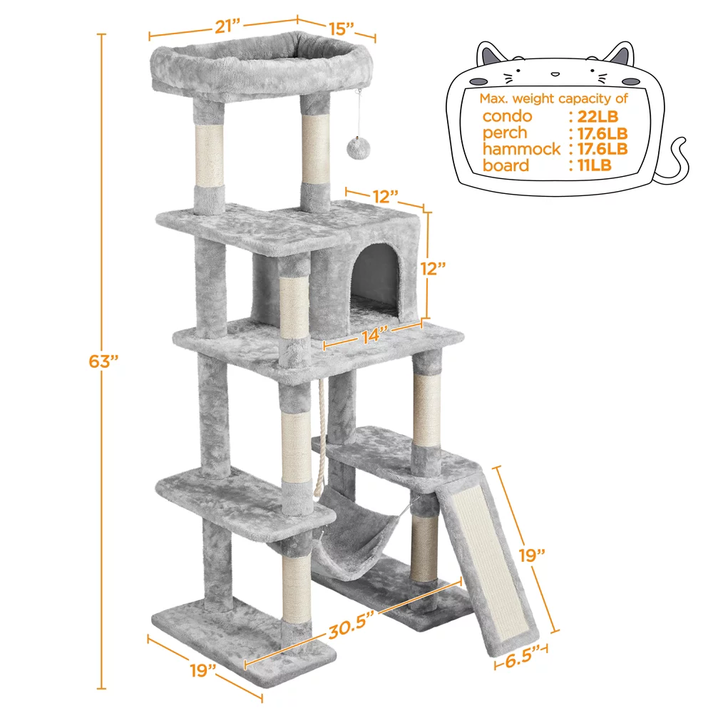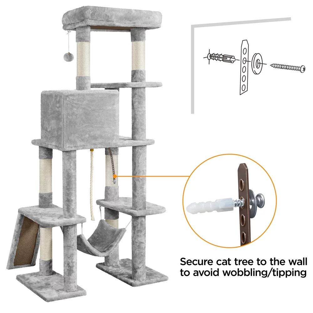Easyfashion 63" Height Large Plush Cat Tree Condos with Hammock, Light Gray