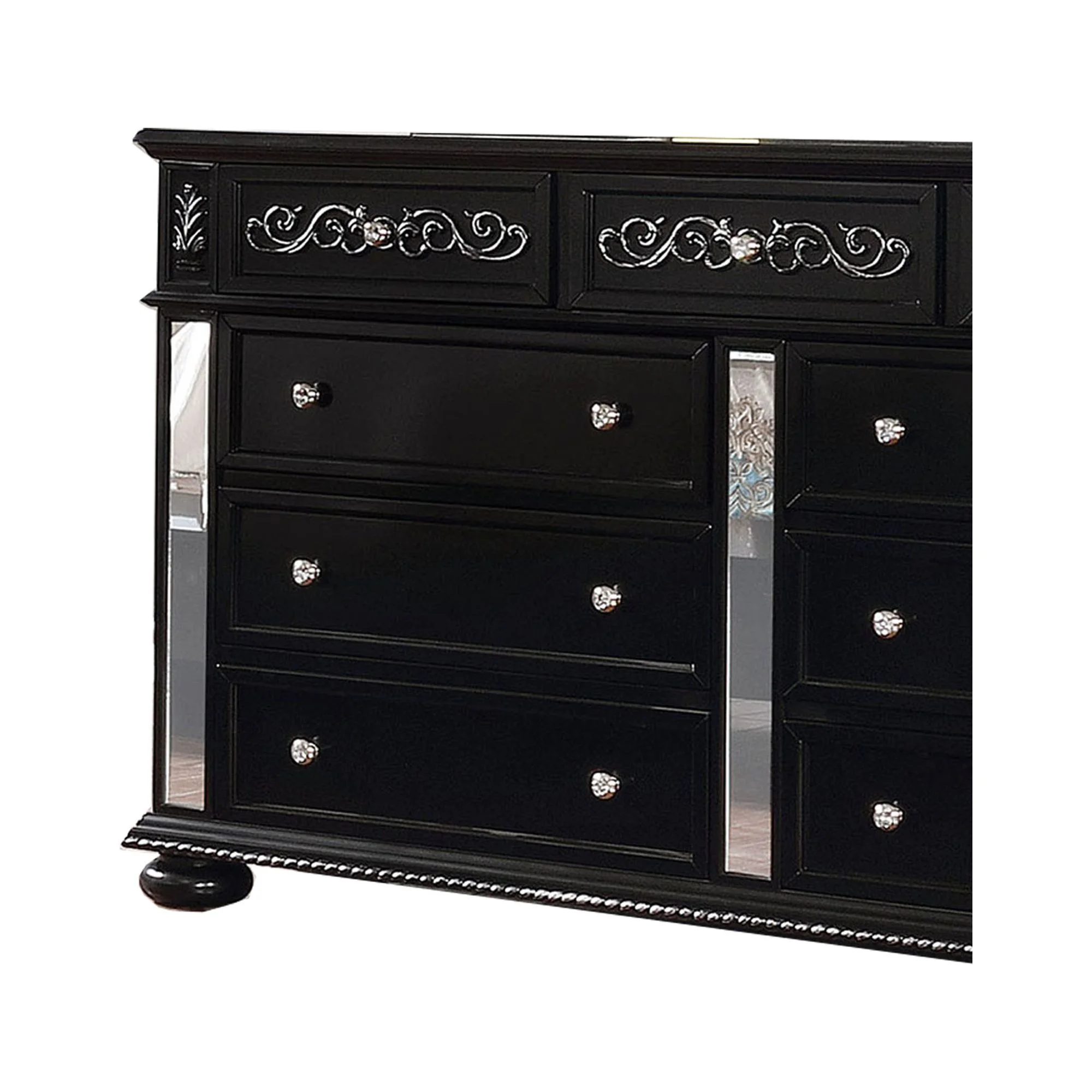 Wooden 9 Drawer Dresser with Mirror Inset and Bun Feet,Black and Clear
