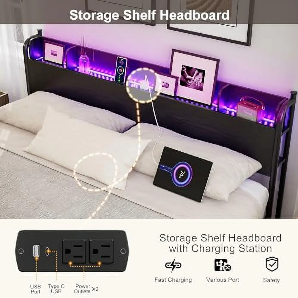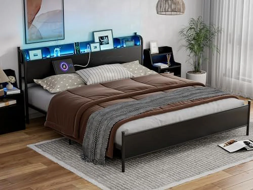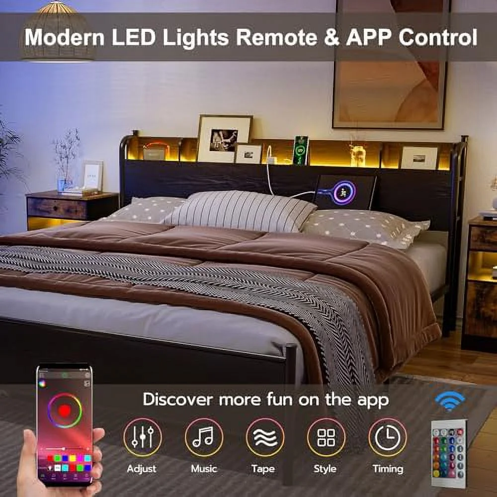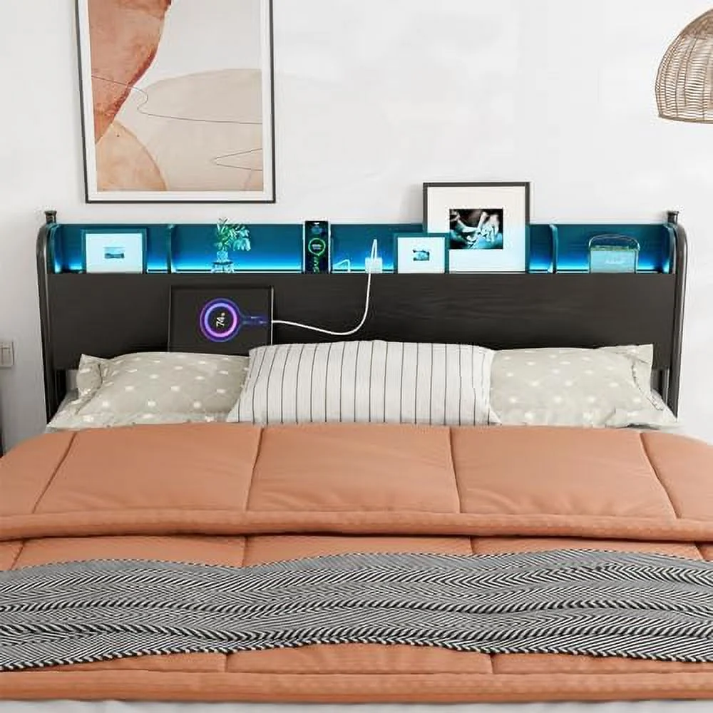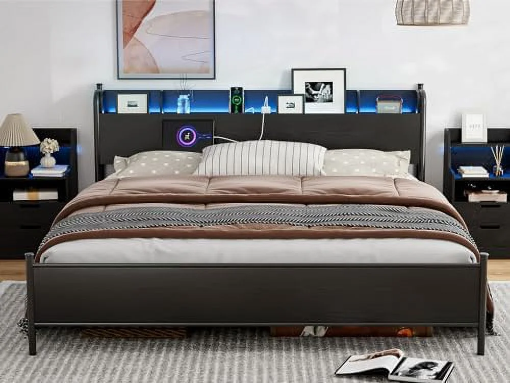 6pc Luxury Dark Gray Queen Bed w/LED Headboard Dresser Mirror Nightstand Chest Bedroom Set