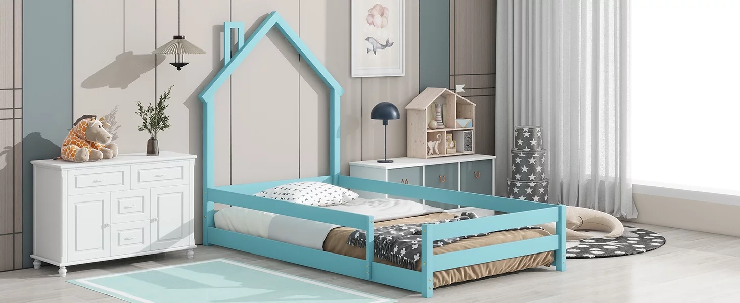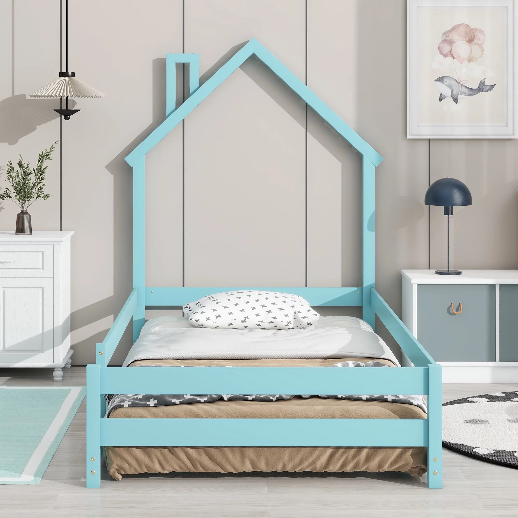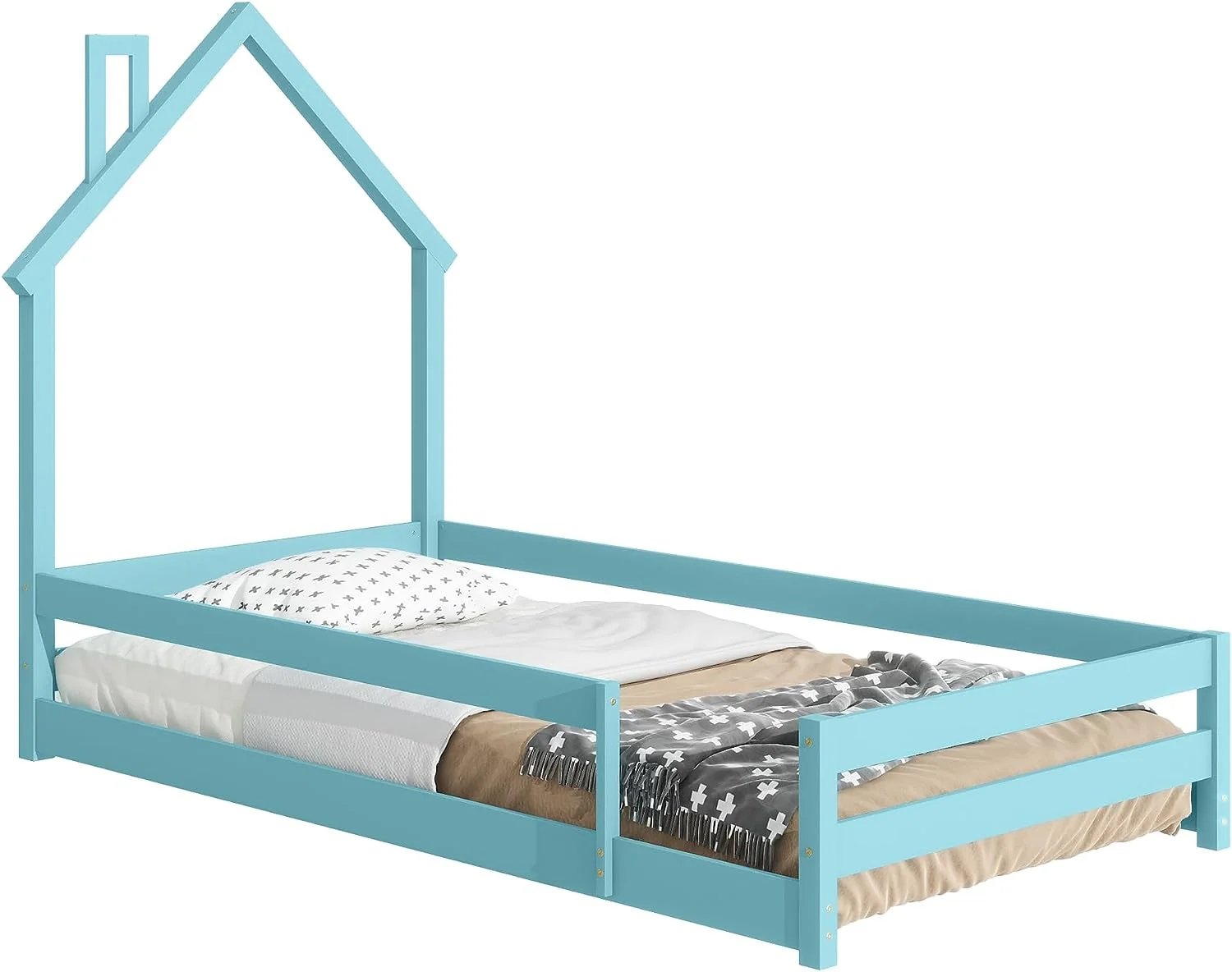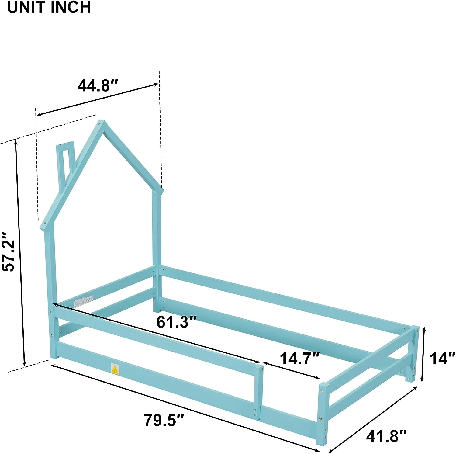 Twin Size Wood bed with House-shaped Headboard Floor bed with Fences,Light Blue