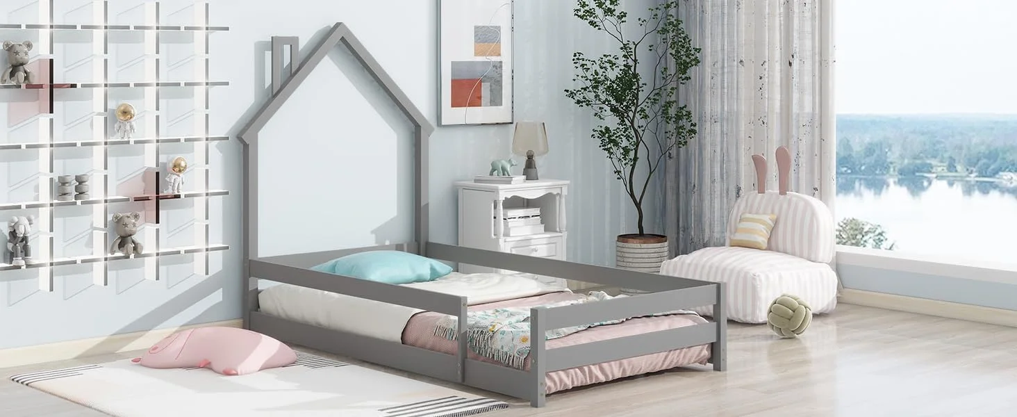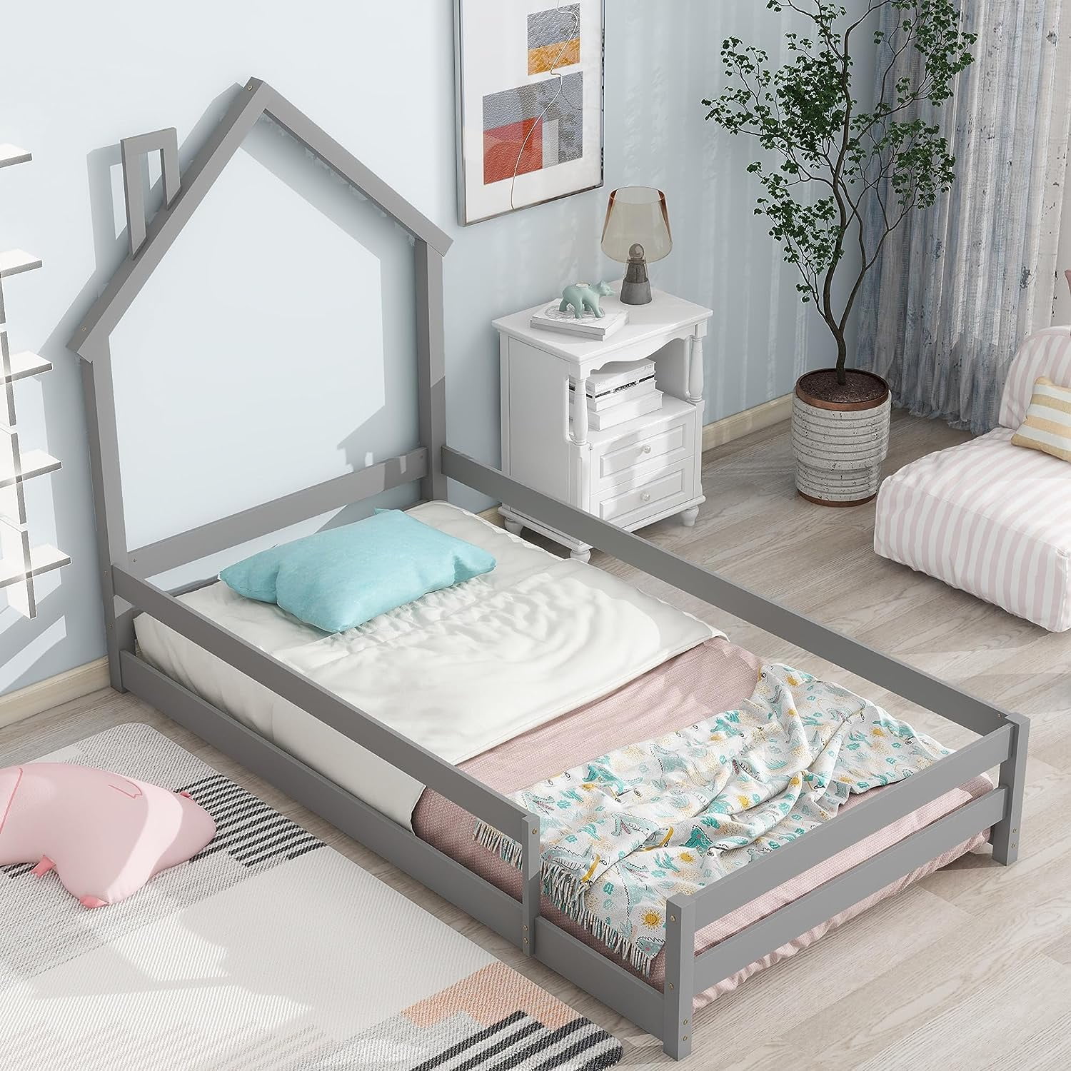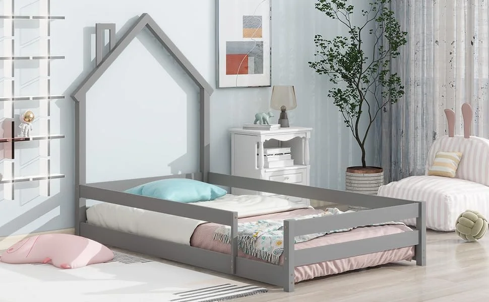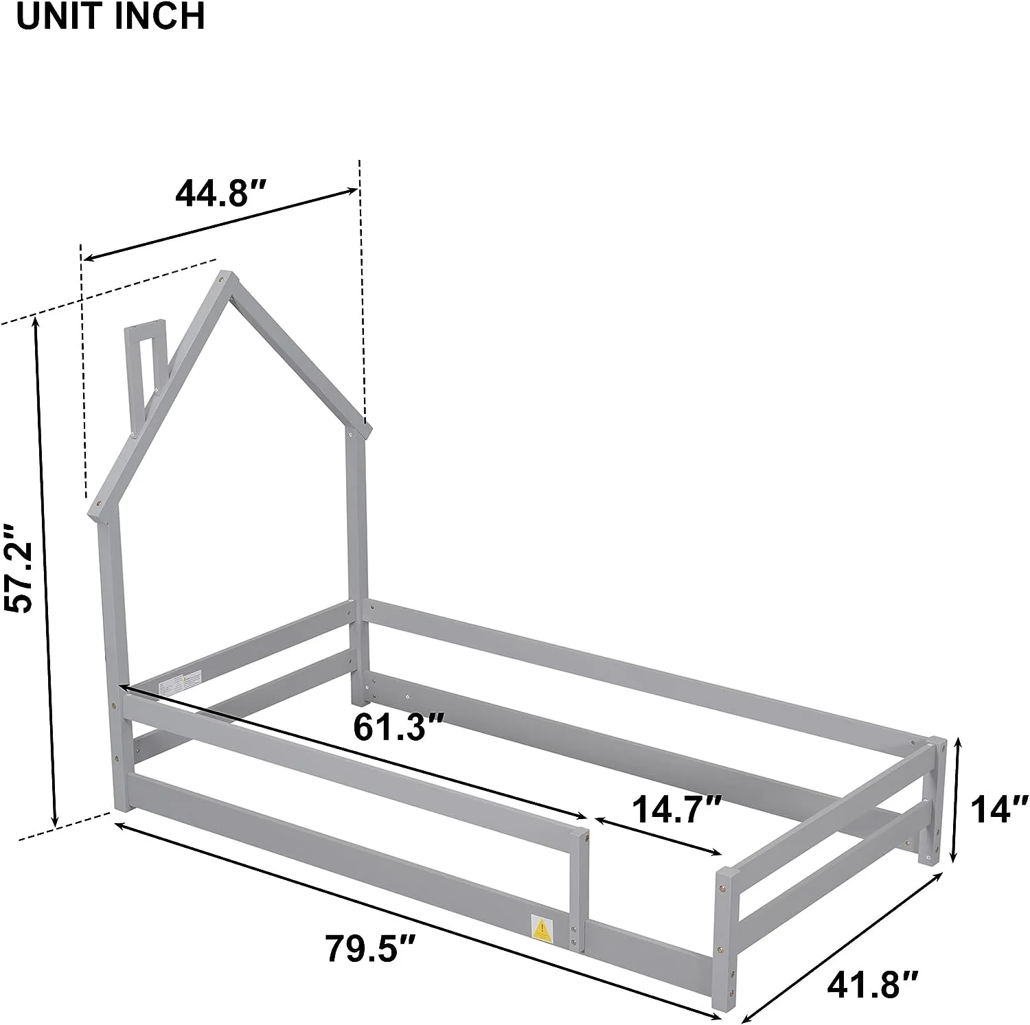 Twin Size Wood bed with House-shaped Headboard Floor bed with Fences,Light Blue