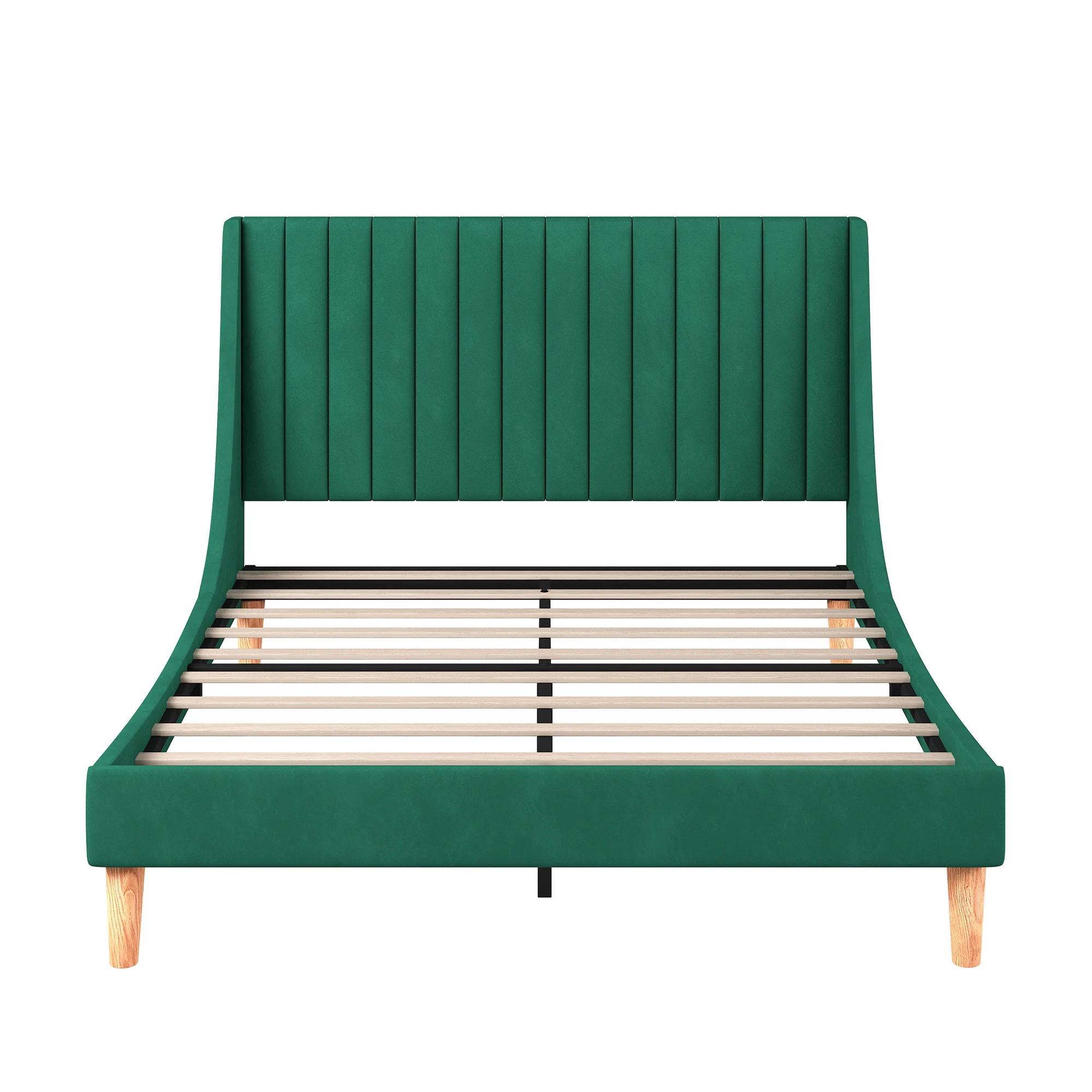 Green Queen Size Platform Bed with Upholstered Headboard, Slat Support, Heavy Duty Mattress Foundation, Easy Assembly