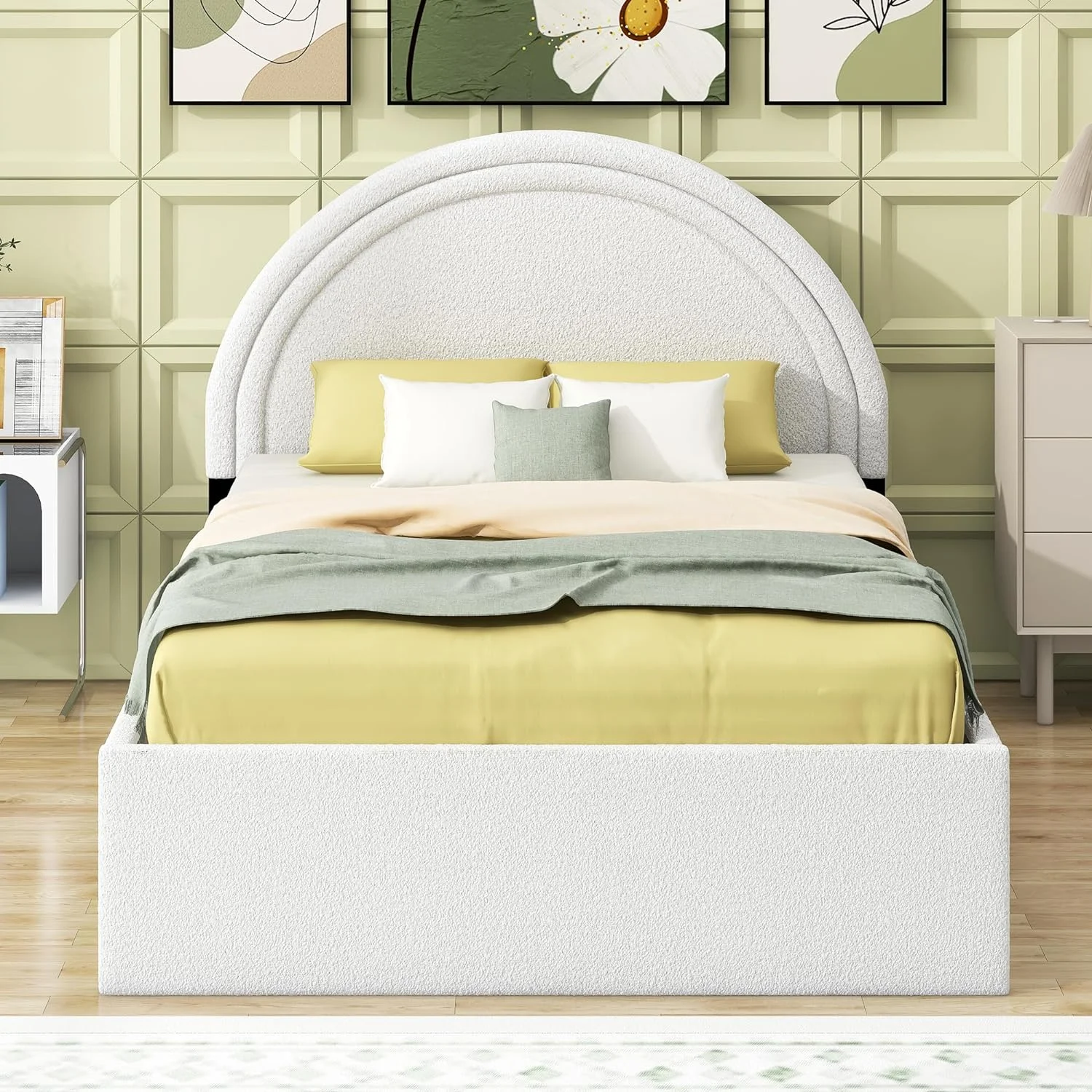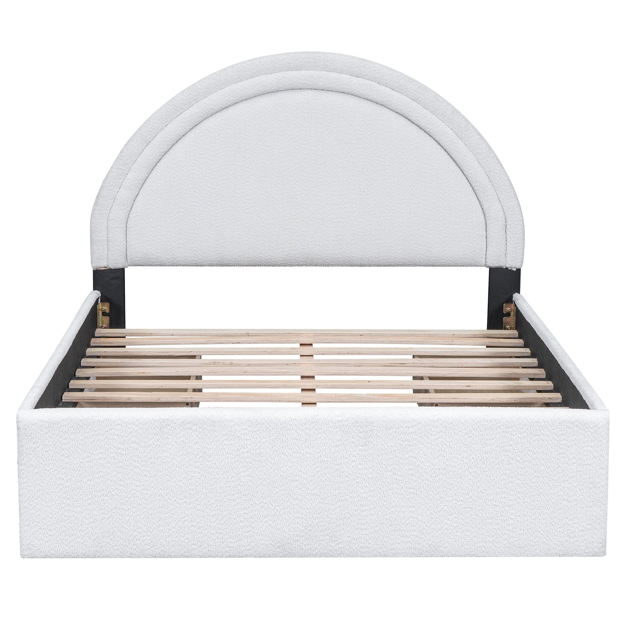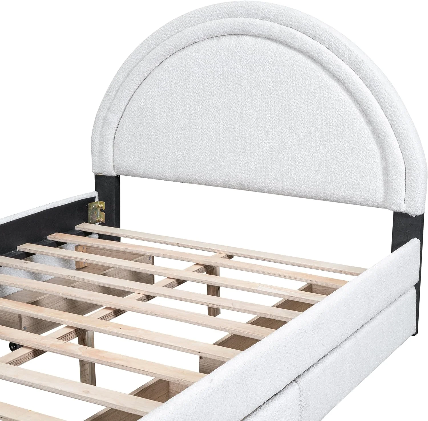 Full Size Teddy Upholstered Platform Bed With Four Drawers Udereath,Full Bed Frame With Curve-Shaped Headboard,White