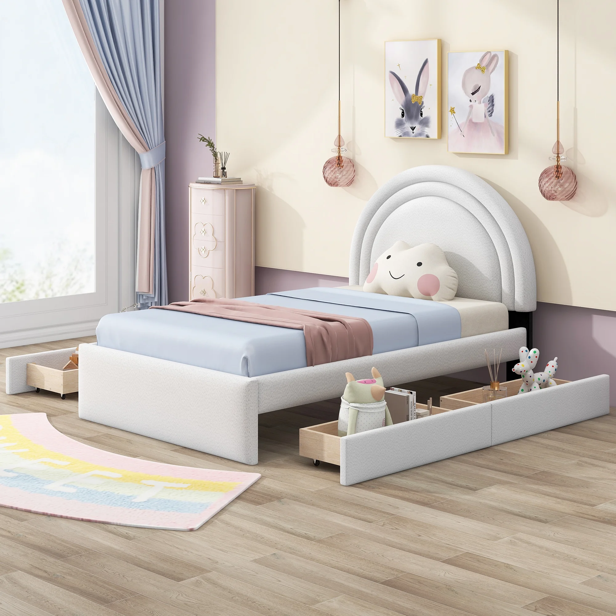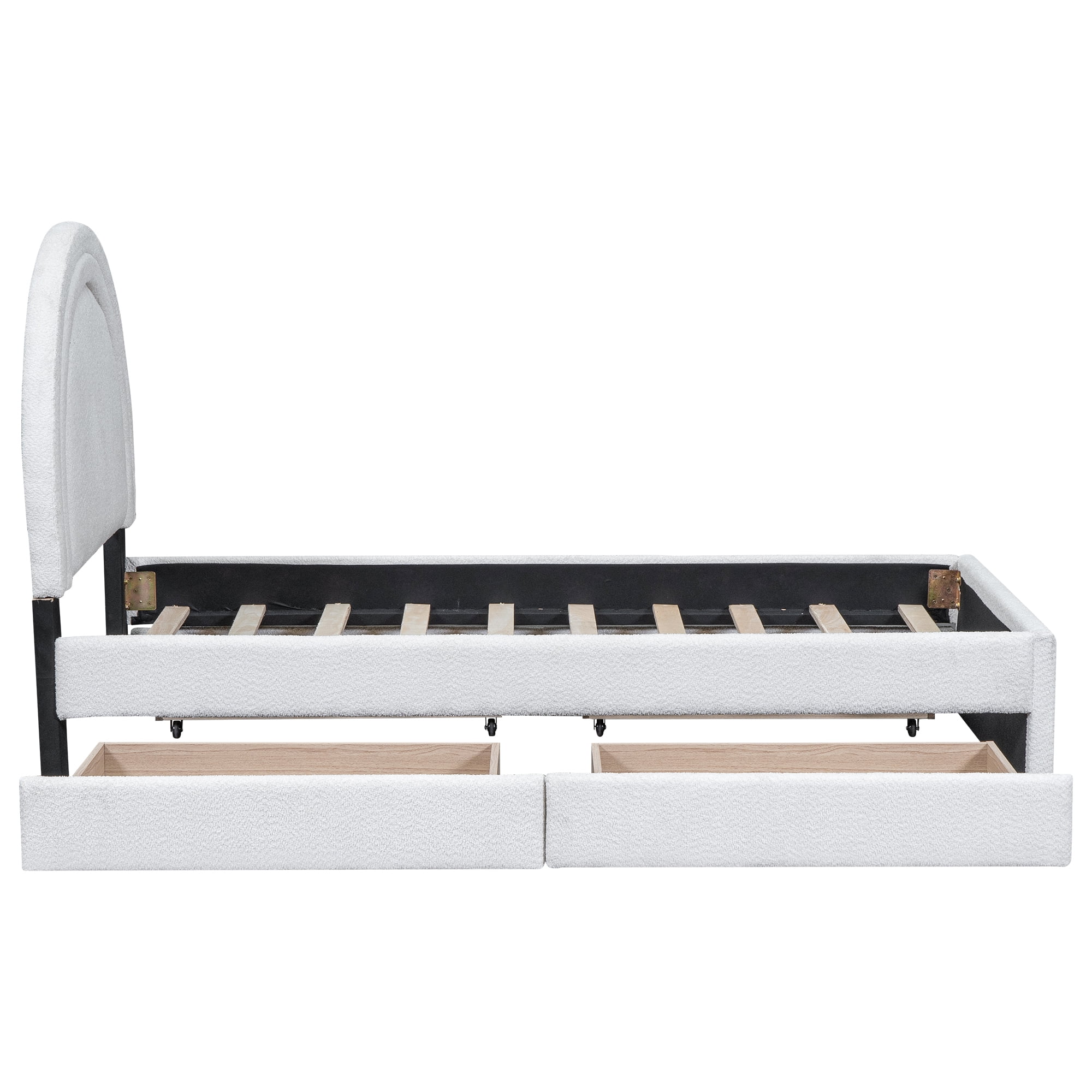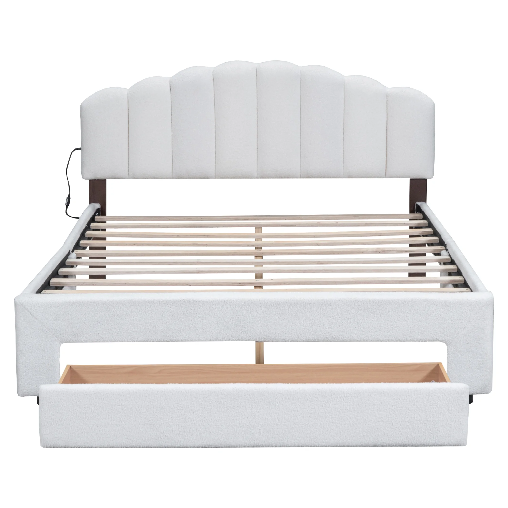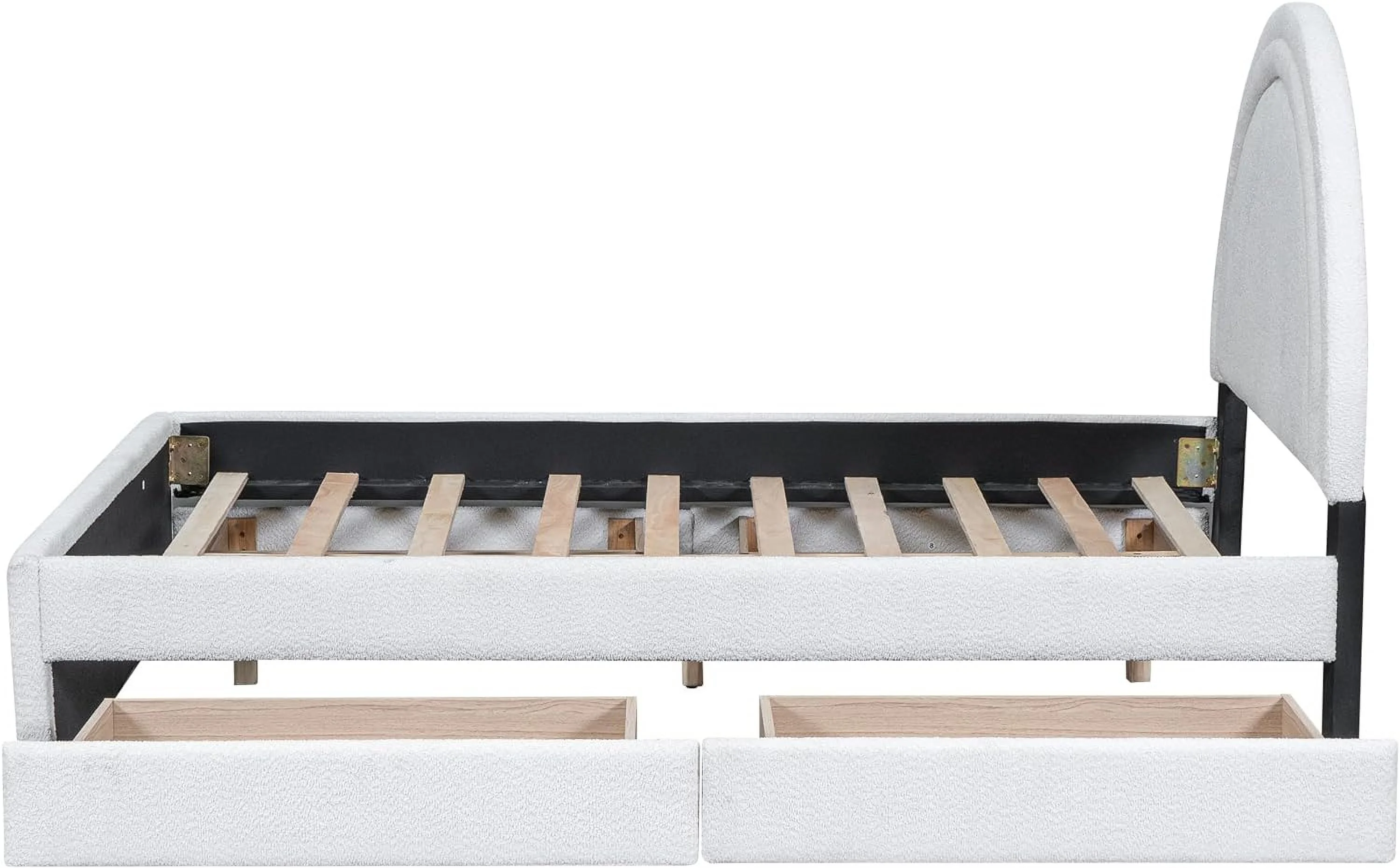 Full Size Teddy Upholstered Platform Bed With Four Drawers Udereath,Full Bed Frame With Curve-Shaped Headboard,White