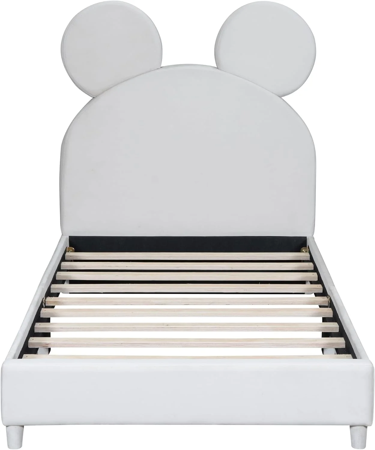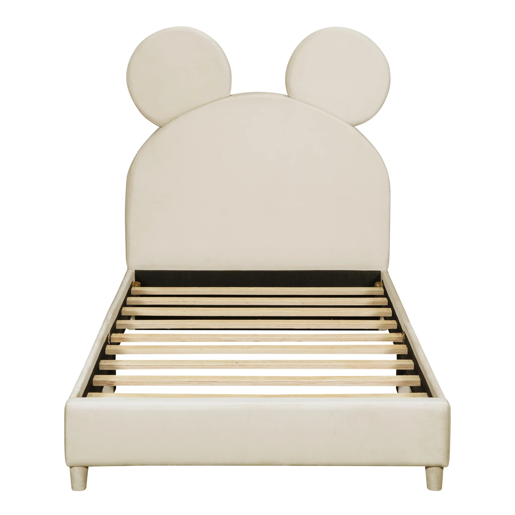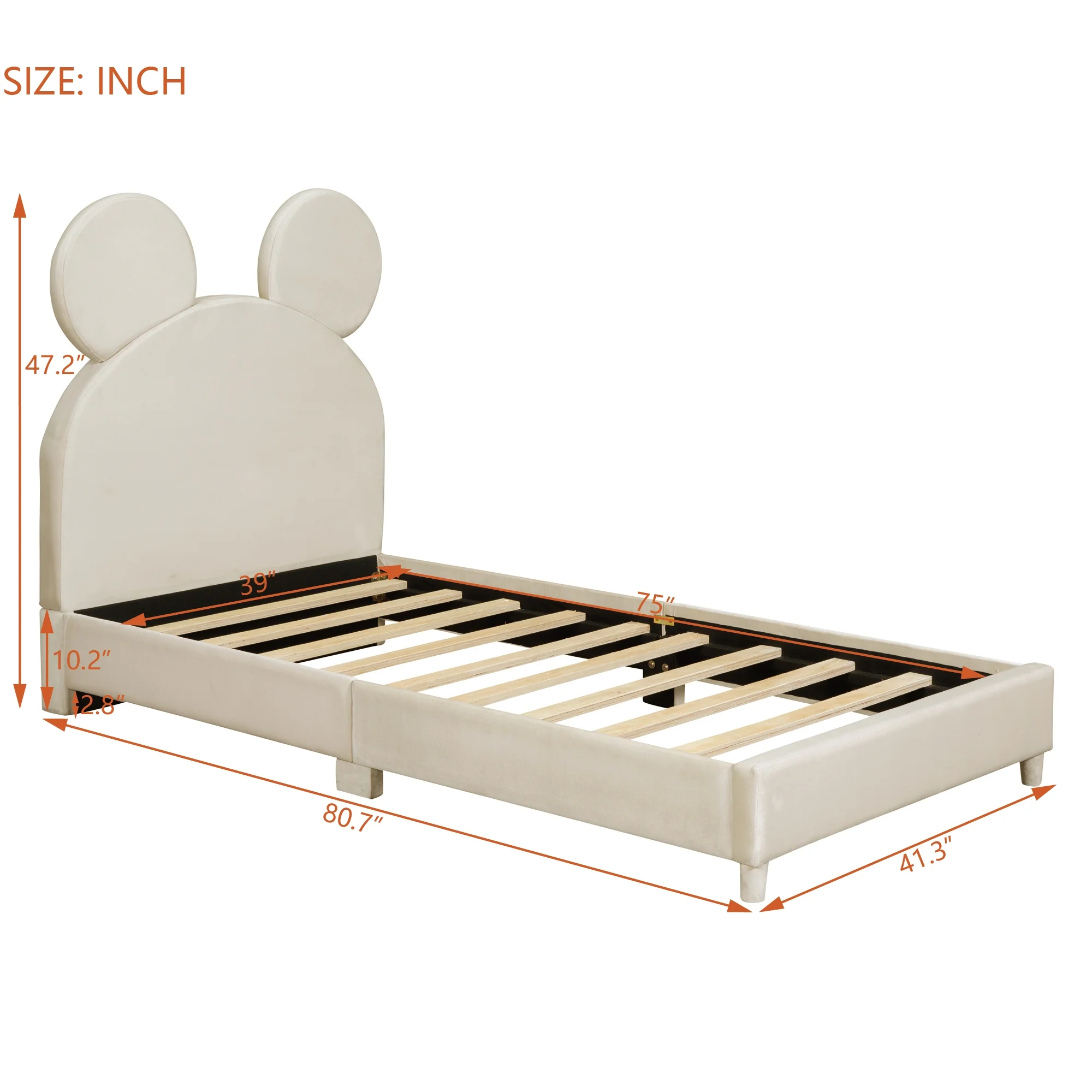 Twin Size Upholstered Bed Frame with Cute Bear Ear Shaped Headboard - Stylish Twin Bed with Headboard for Kids-Beige