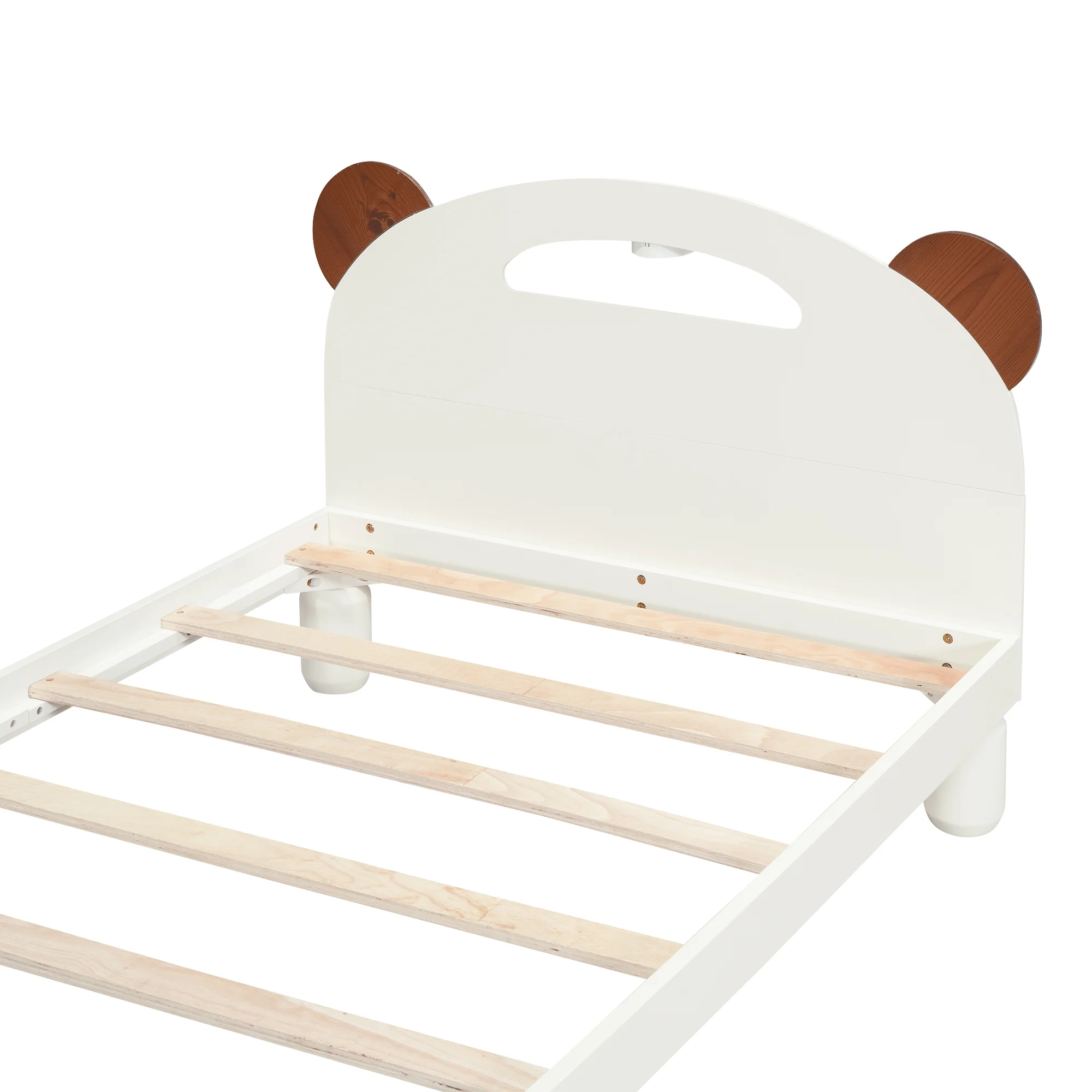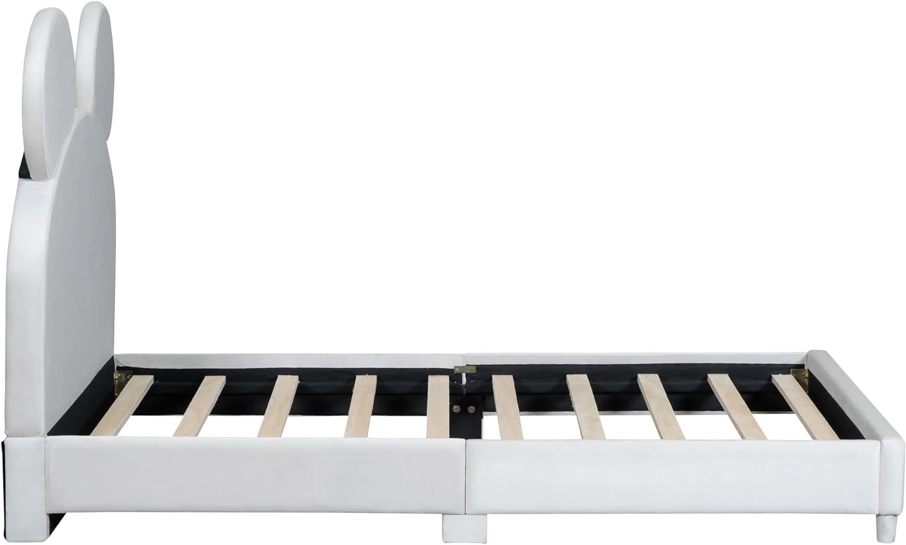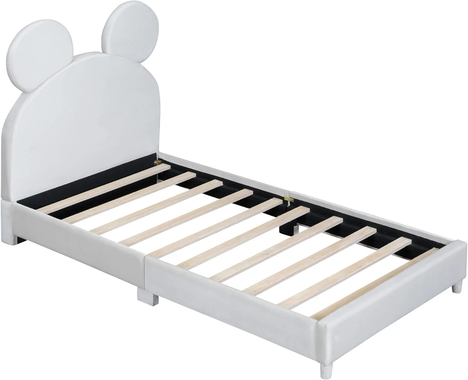 Twin Size Upholstered Bed Frame with Cute Bear Ear Shaped Headboard - Stylish Twin Bed with Headboard for Kids-Beige