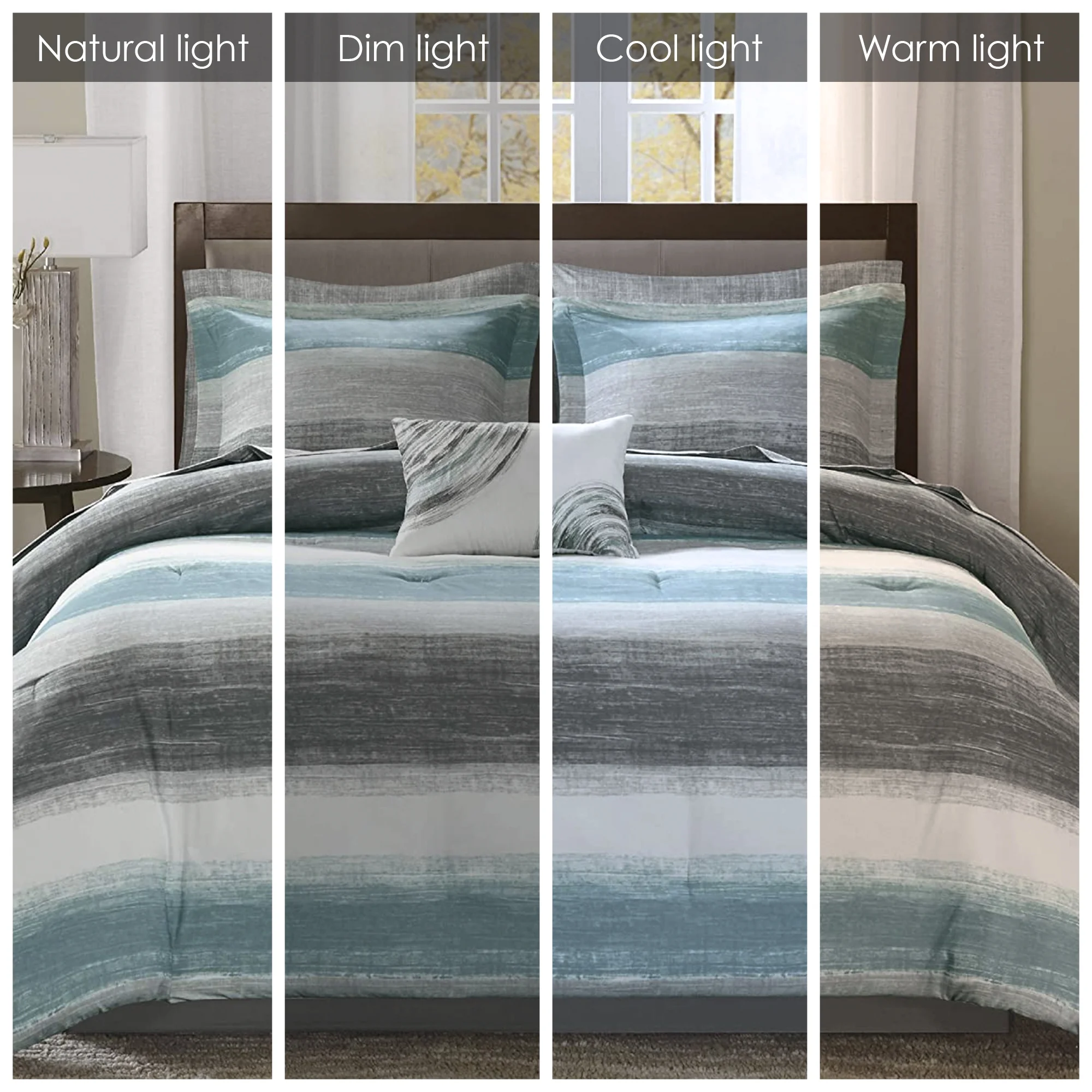 Madison Park Essentials 9-Piece Cal King Complete Comforter Set with Cotton Bed Sheets Aqua Stripe Bed in a Bag