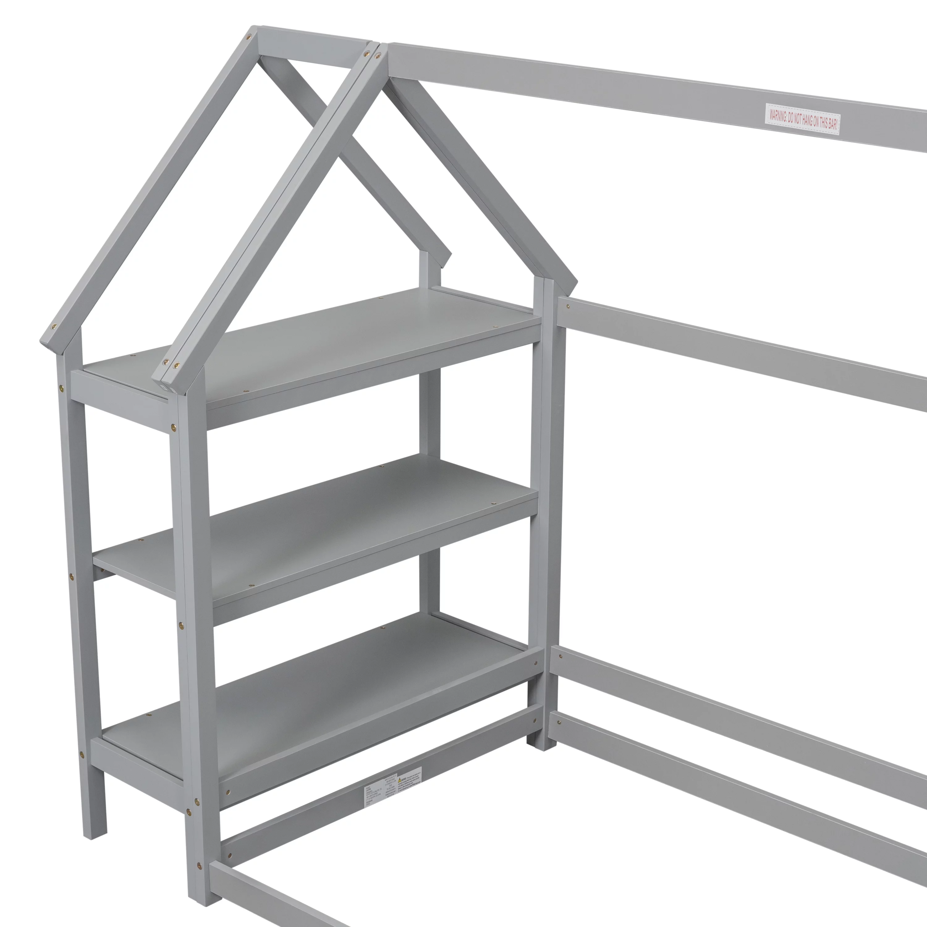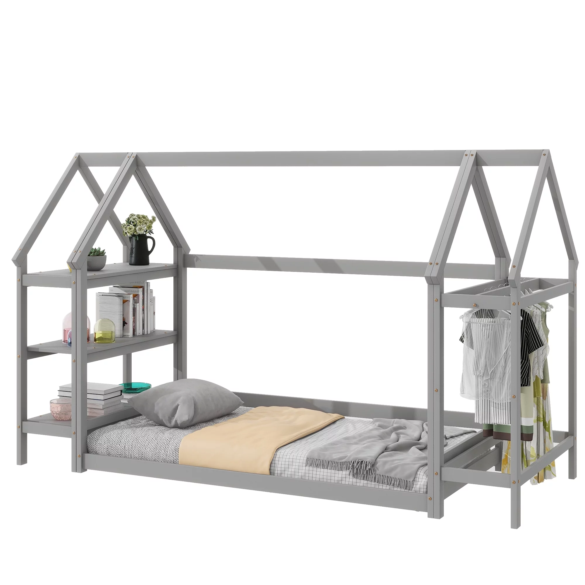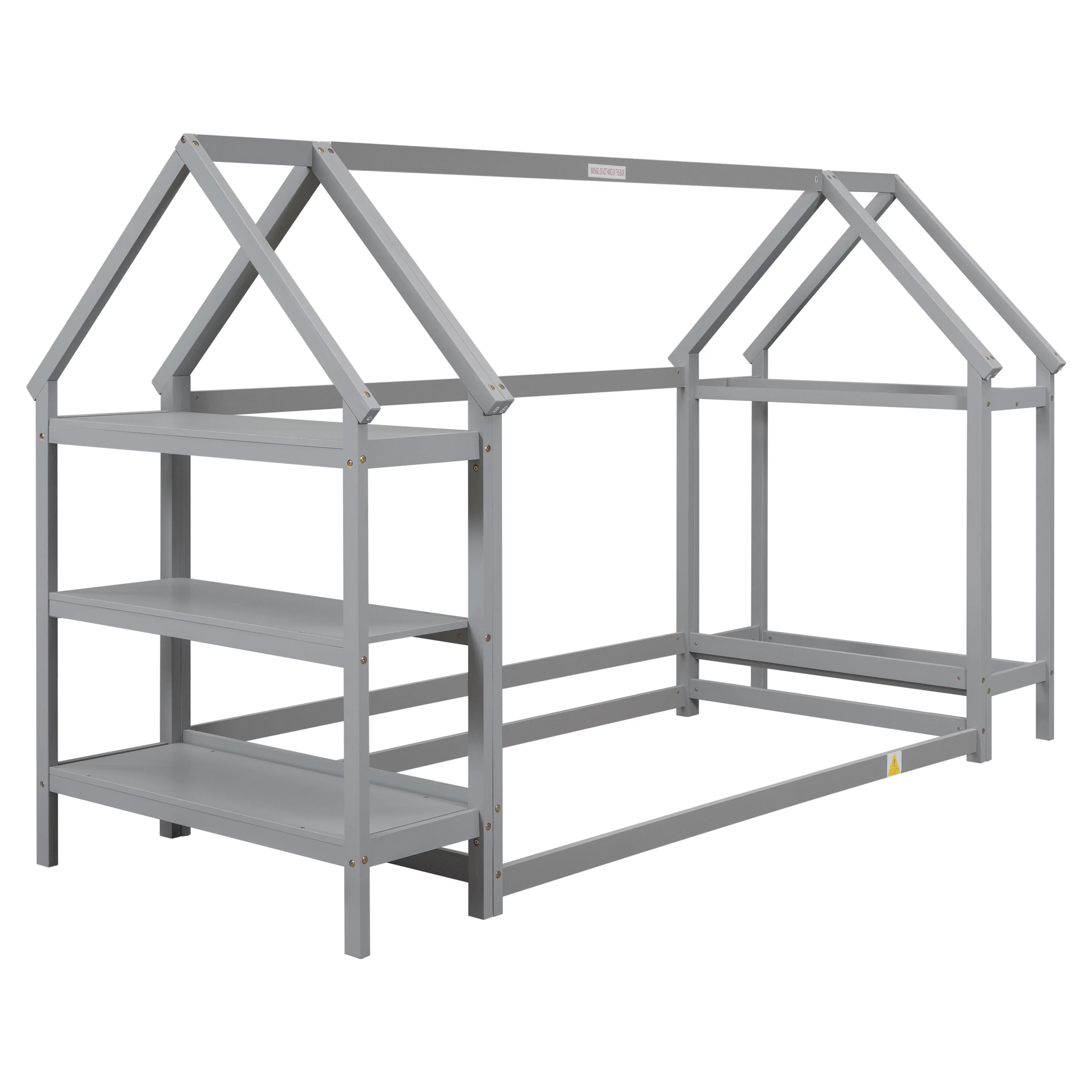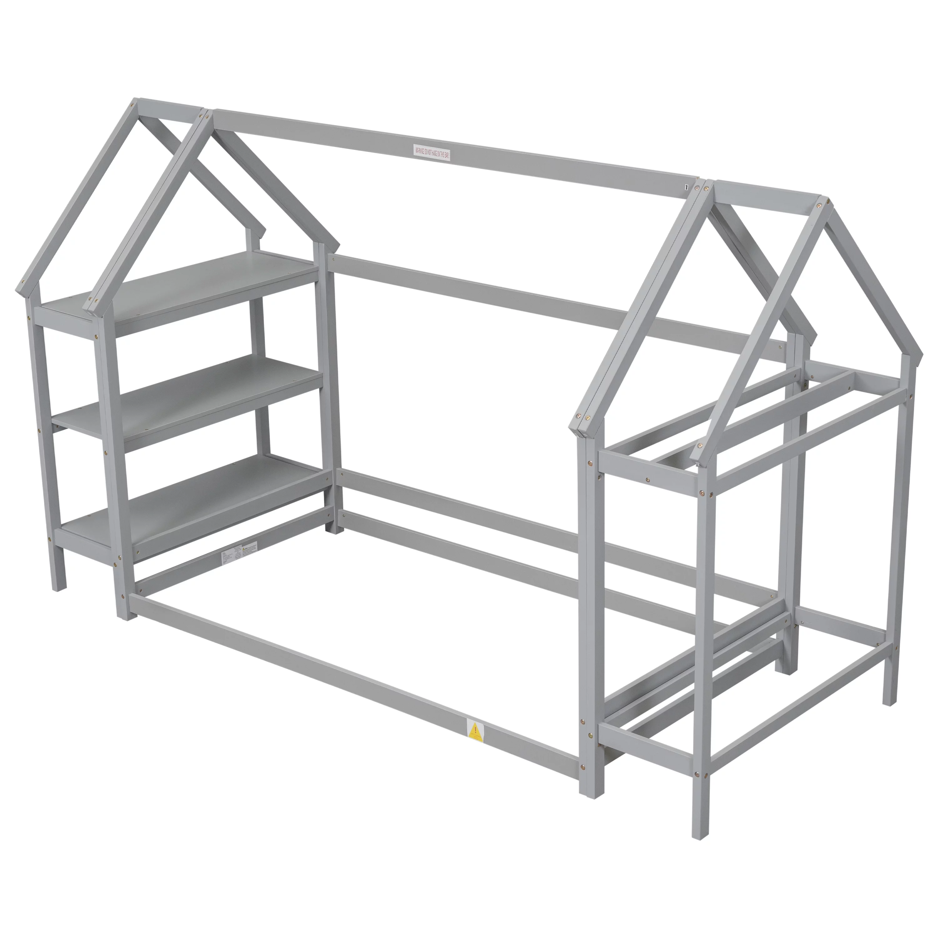 Euroco Wood Twin House-Shaped Floor Bed with Moveable Shelf and Wardrobe for Kids, Gray