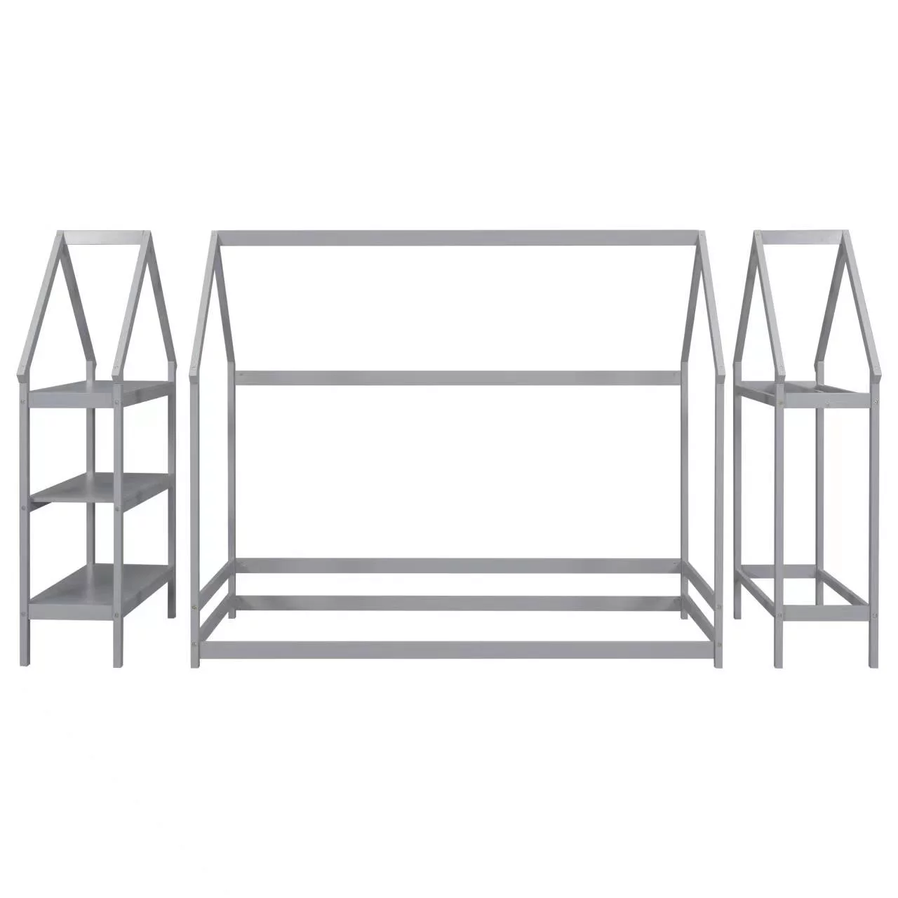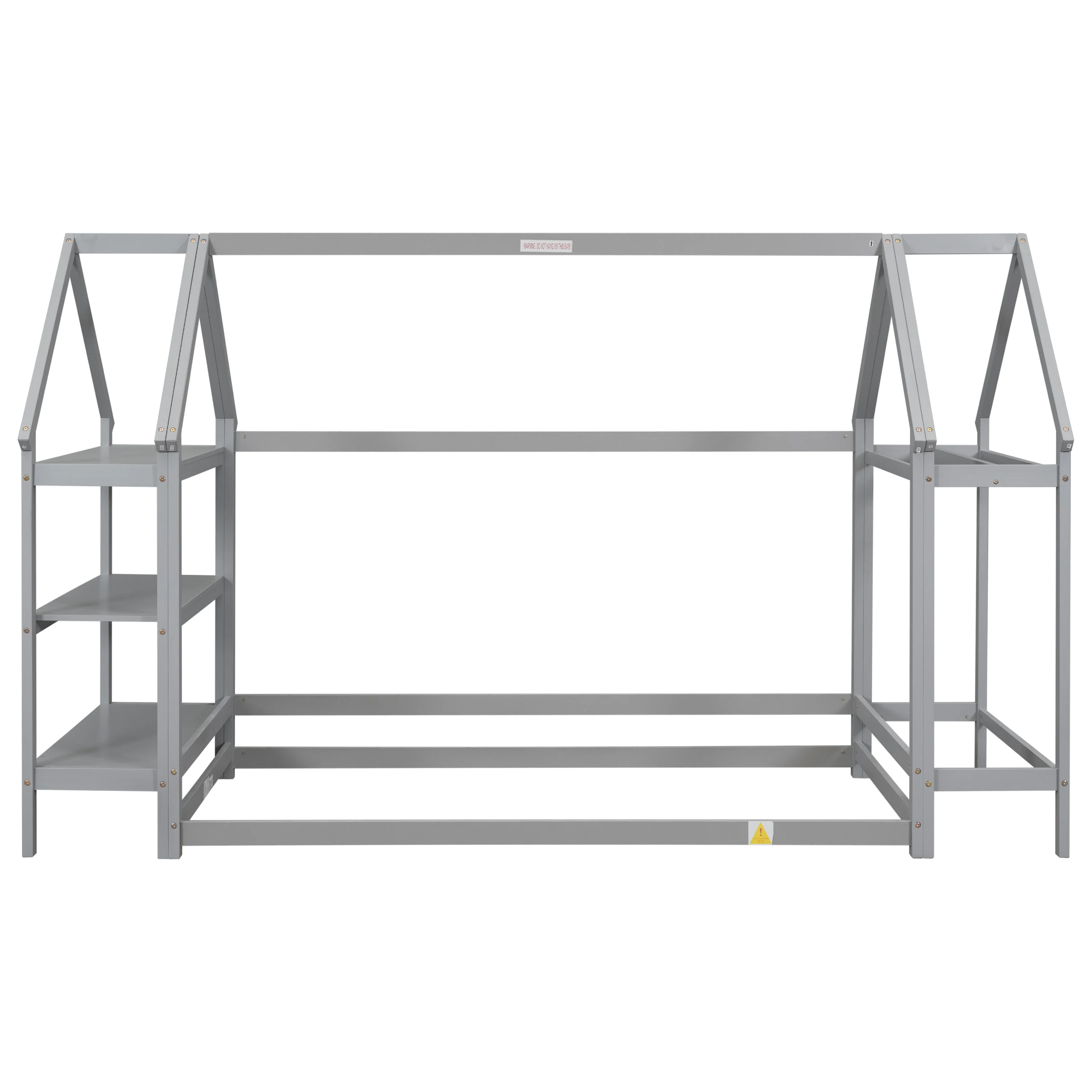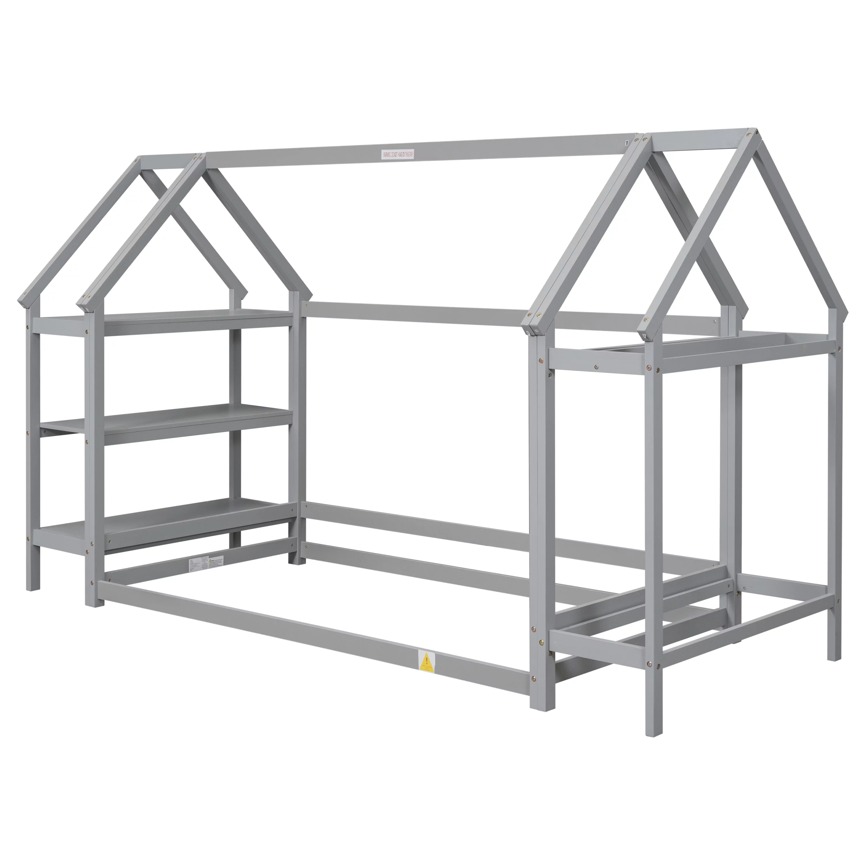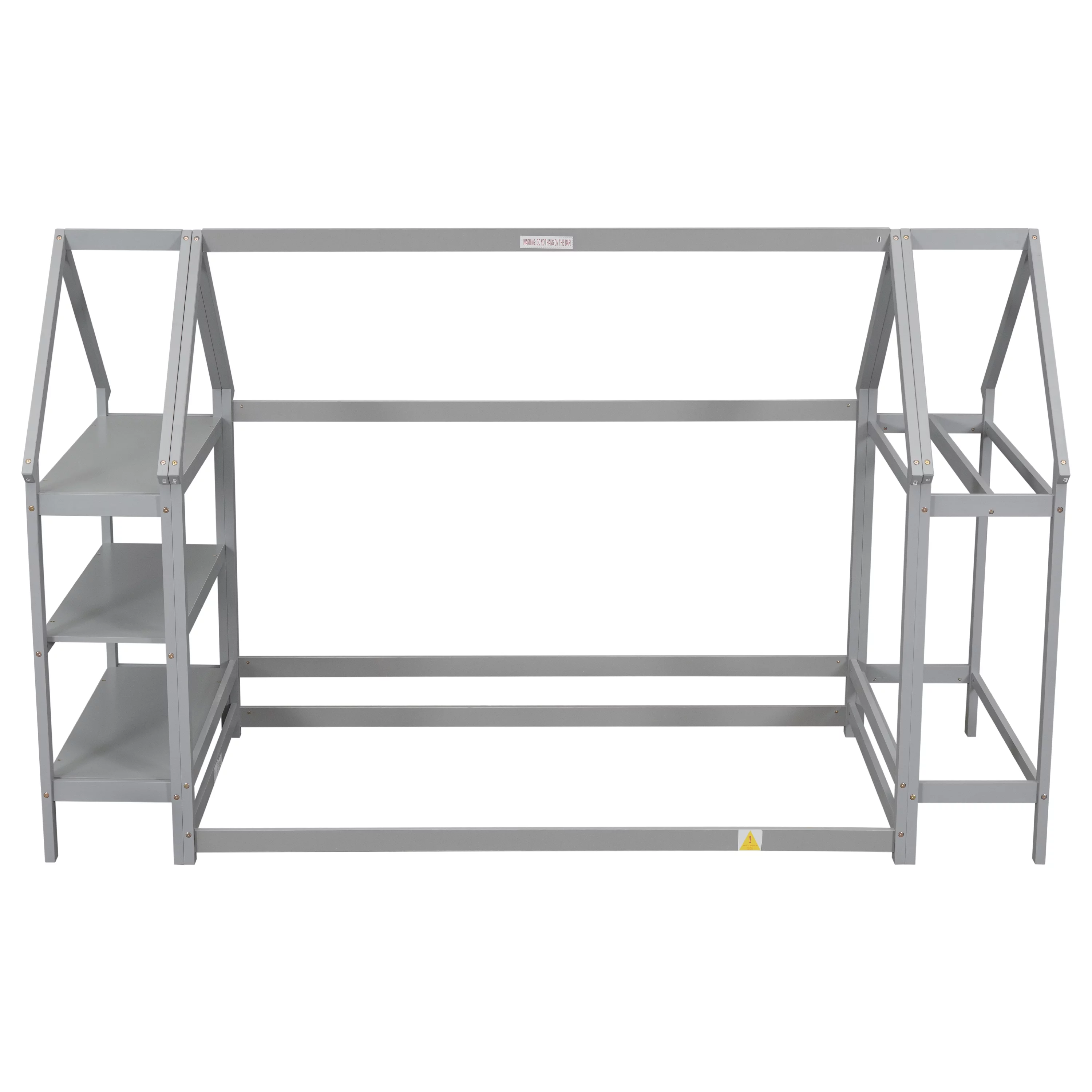 Euroco Wood Twin House-Shaped Floor Bed with Moveable Shelf and Wardrobe for Kids, Gray