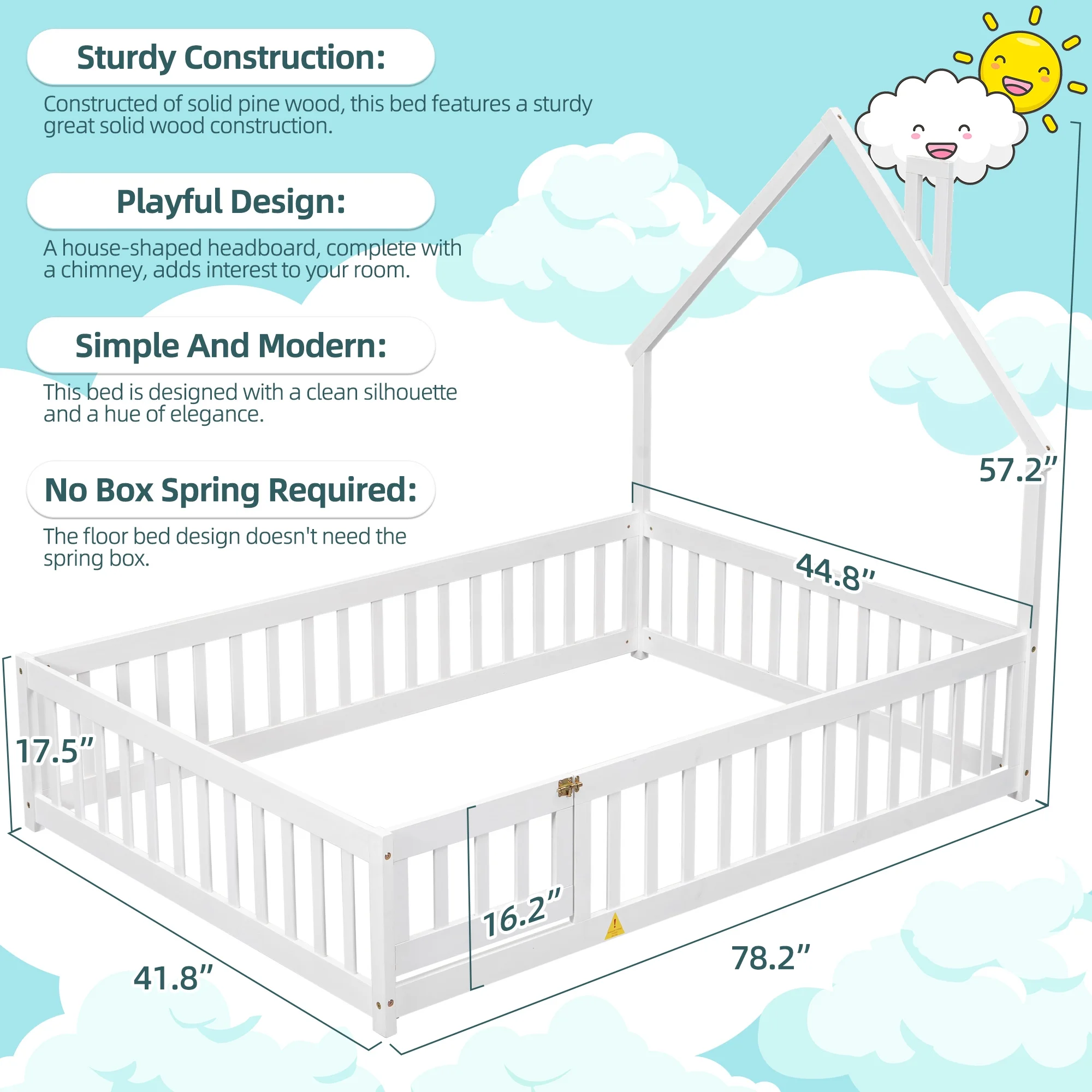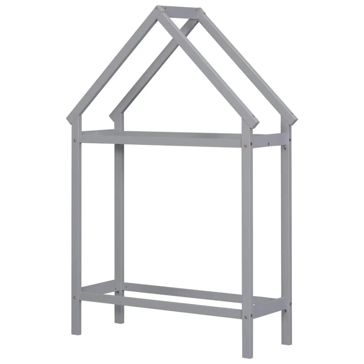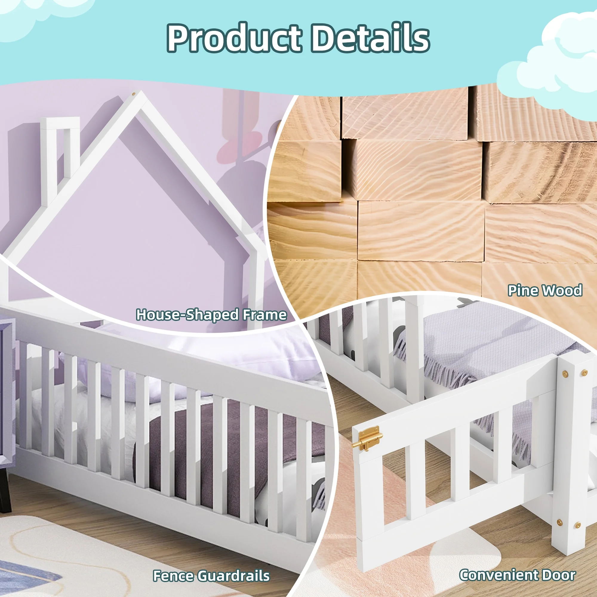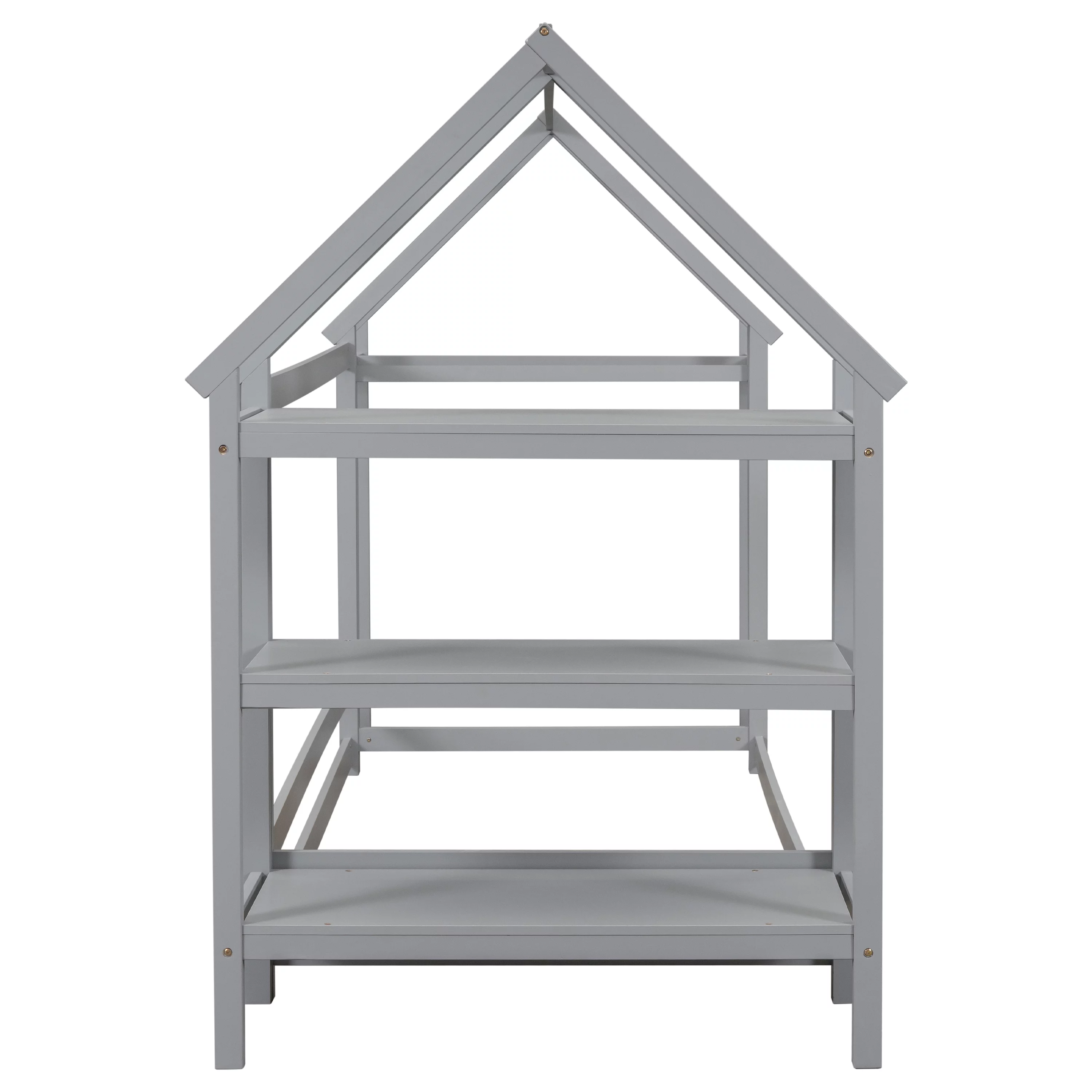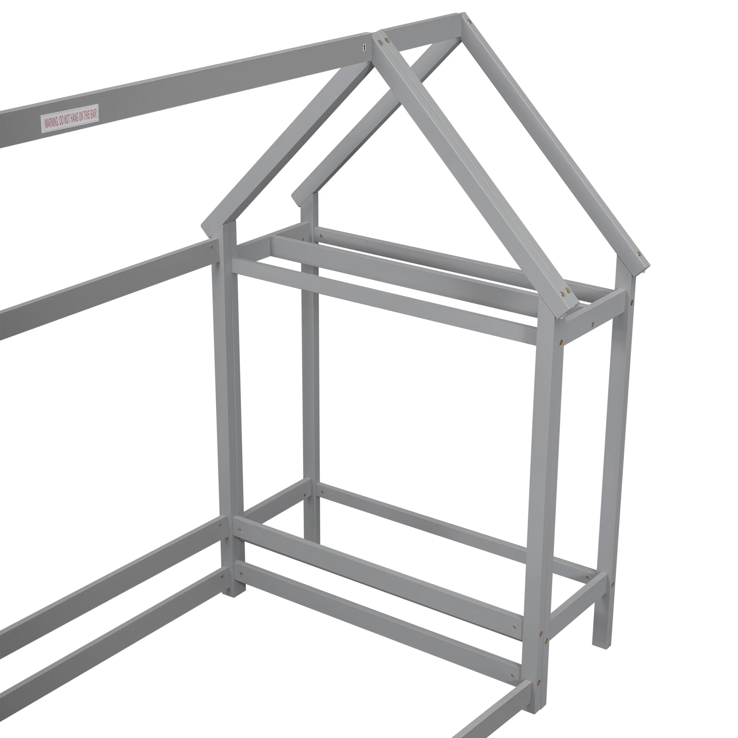 Euroco Wood Twin House-Shaped Floor Bed with Moveable Shelf and Wardrobe for Kids, Gray