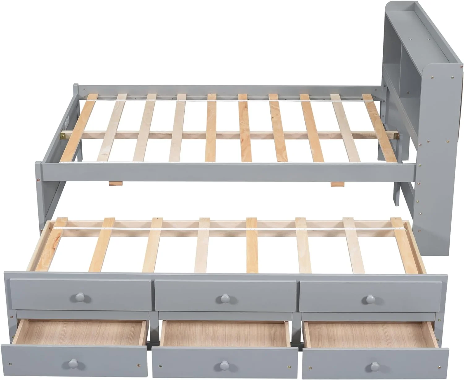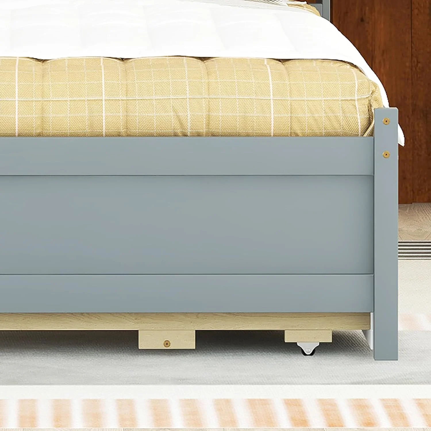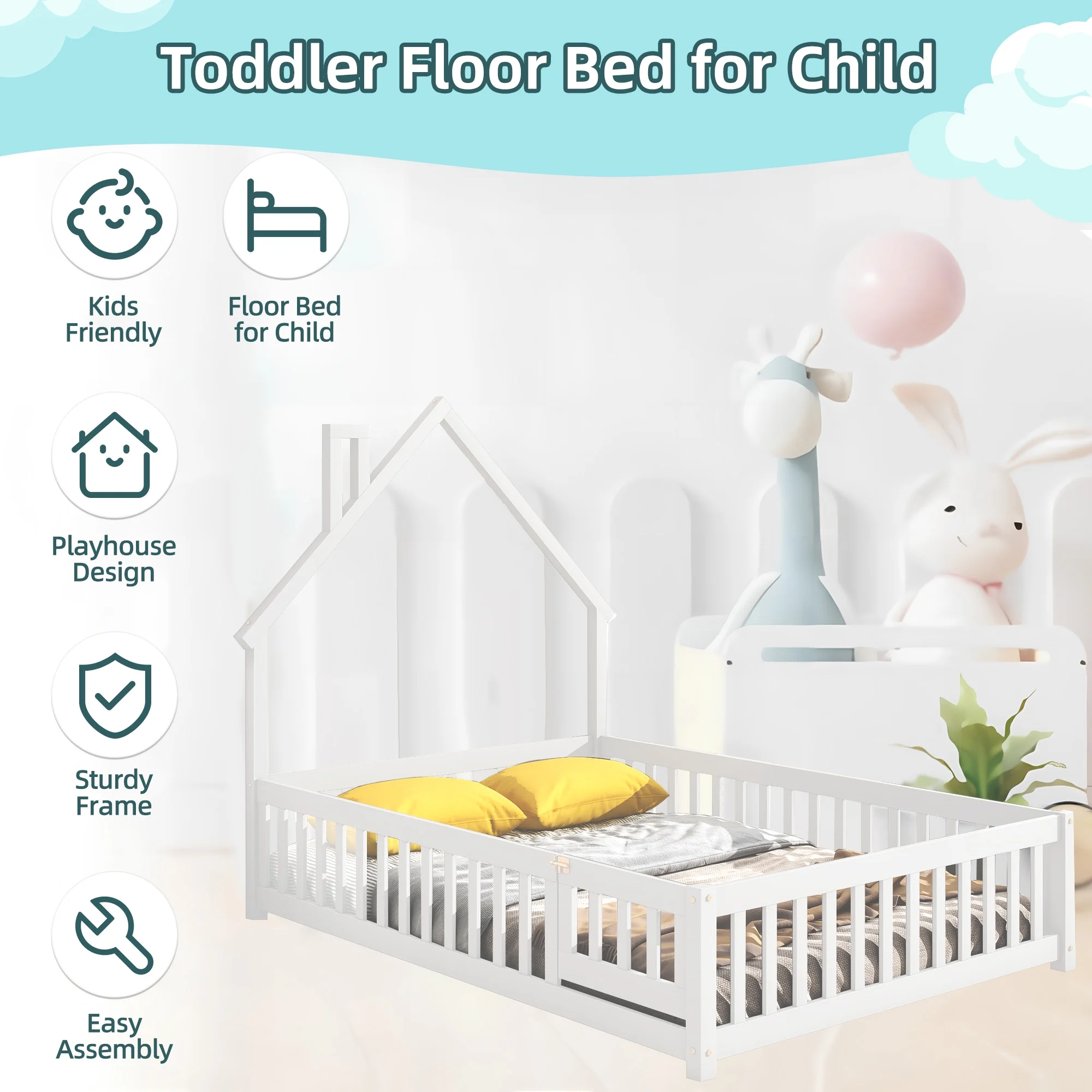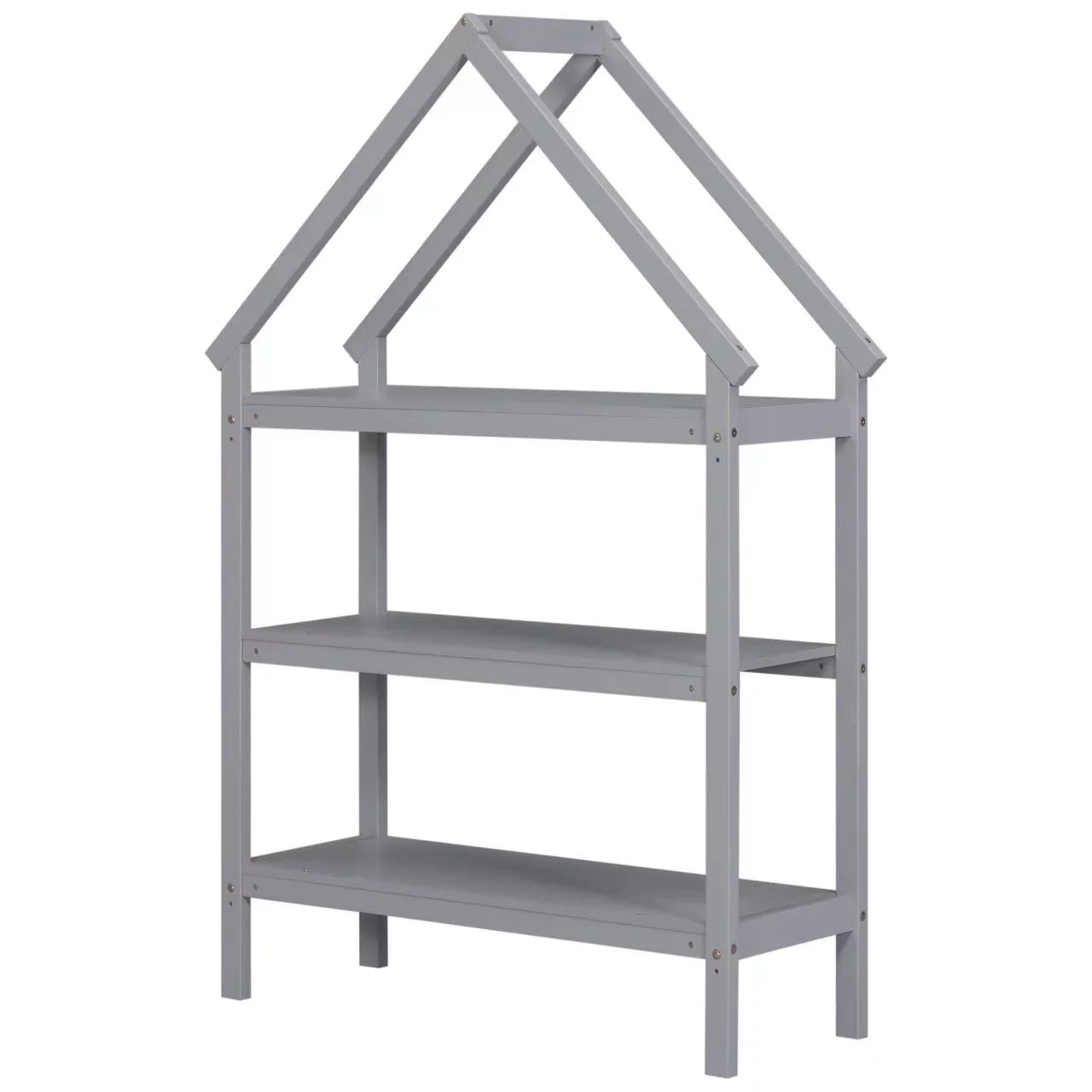 Euroco Wood Twin House-Shaped Floor Bed with Moveable Shelf and Wardrobe for Kids, Gray
