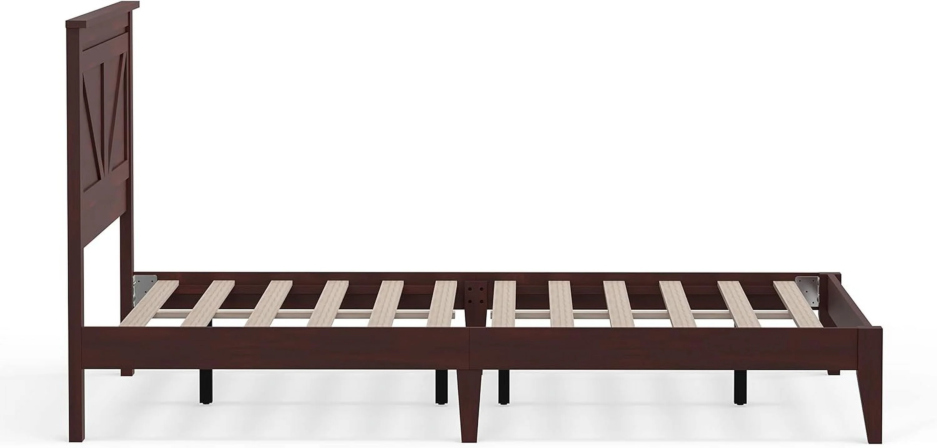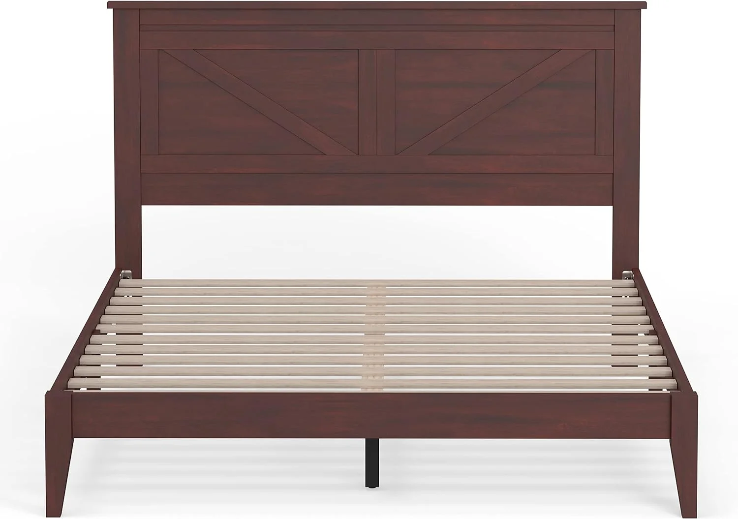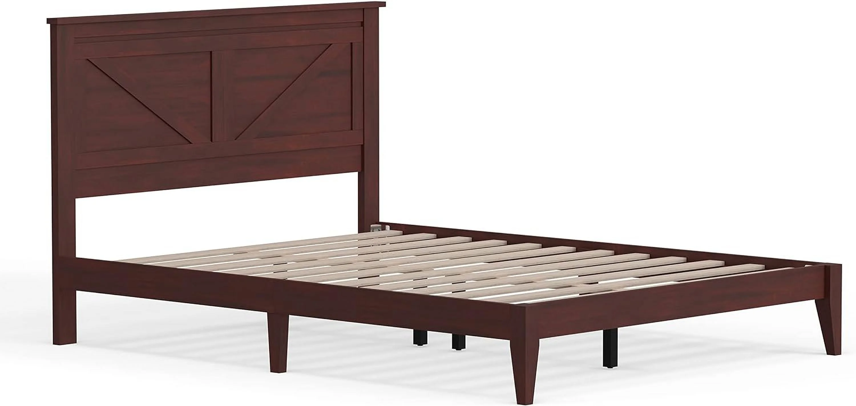 Queen size Solid Pine Wood Platform Bed Frame with Headboard in Cherry