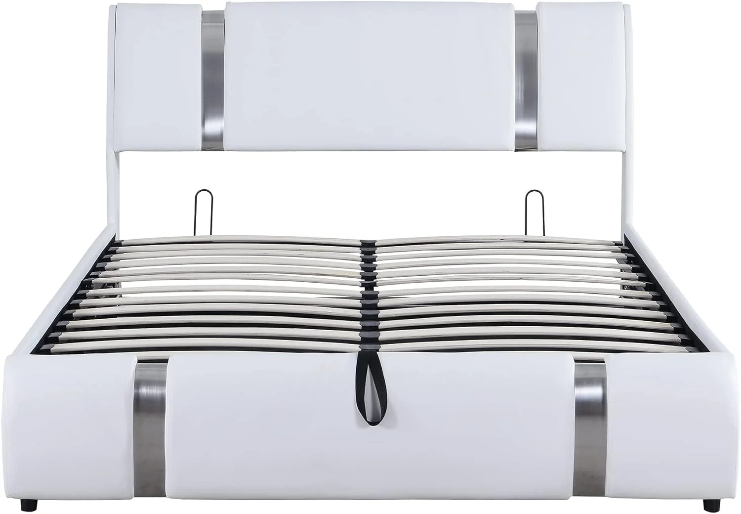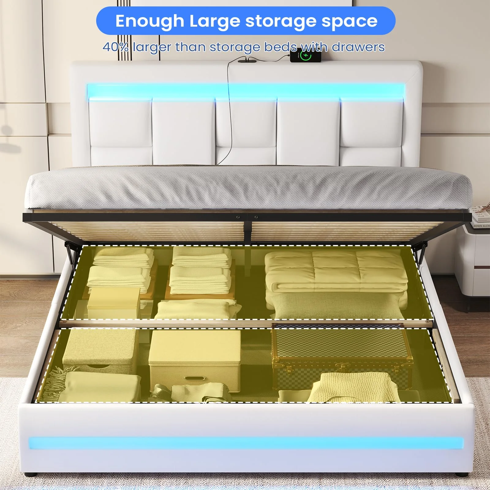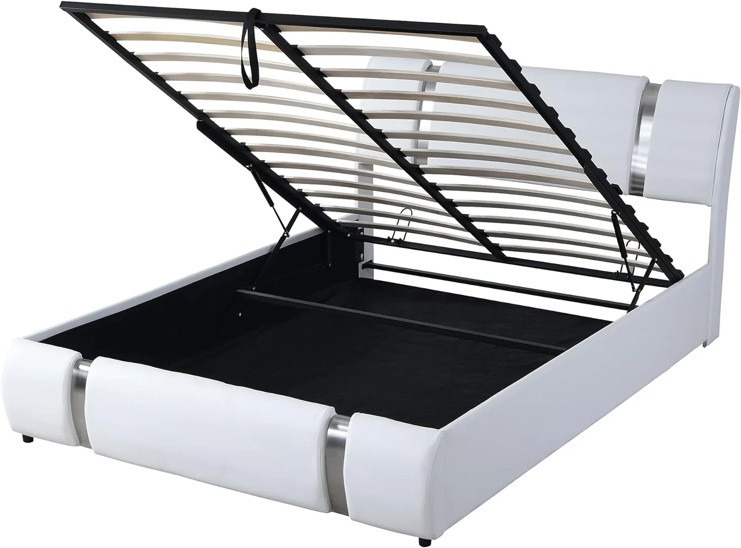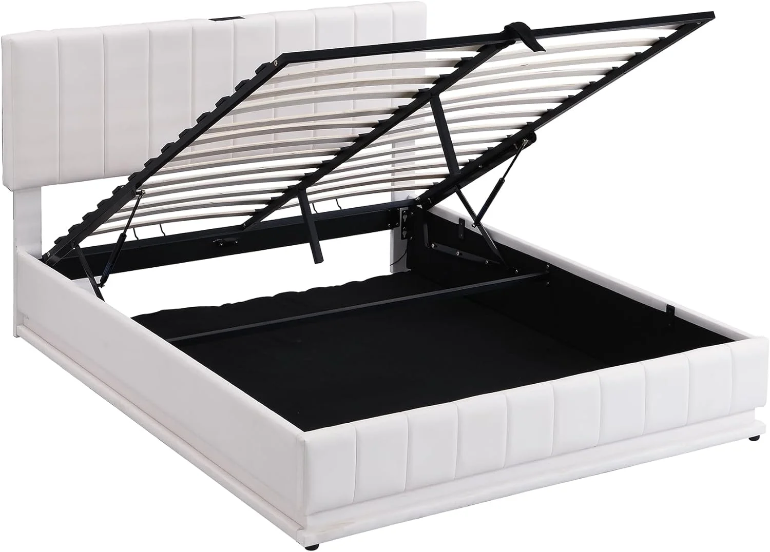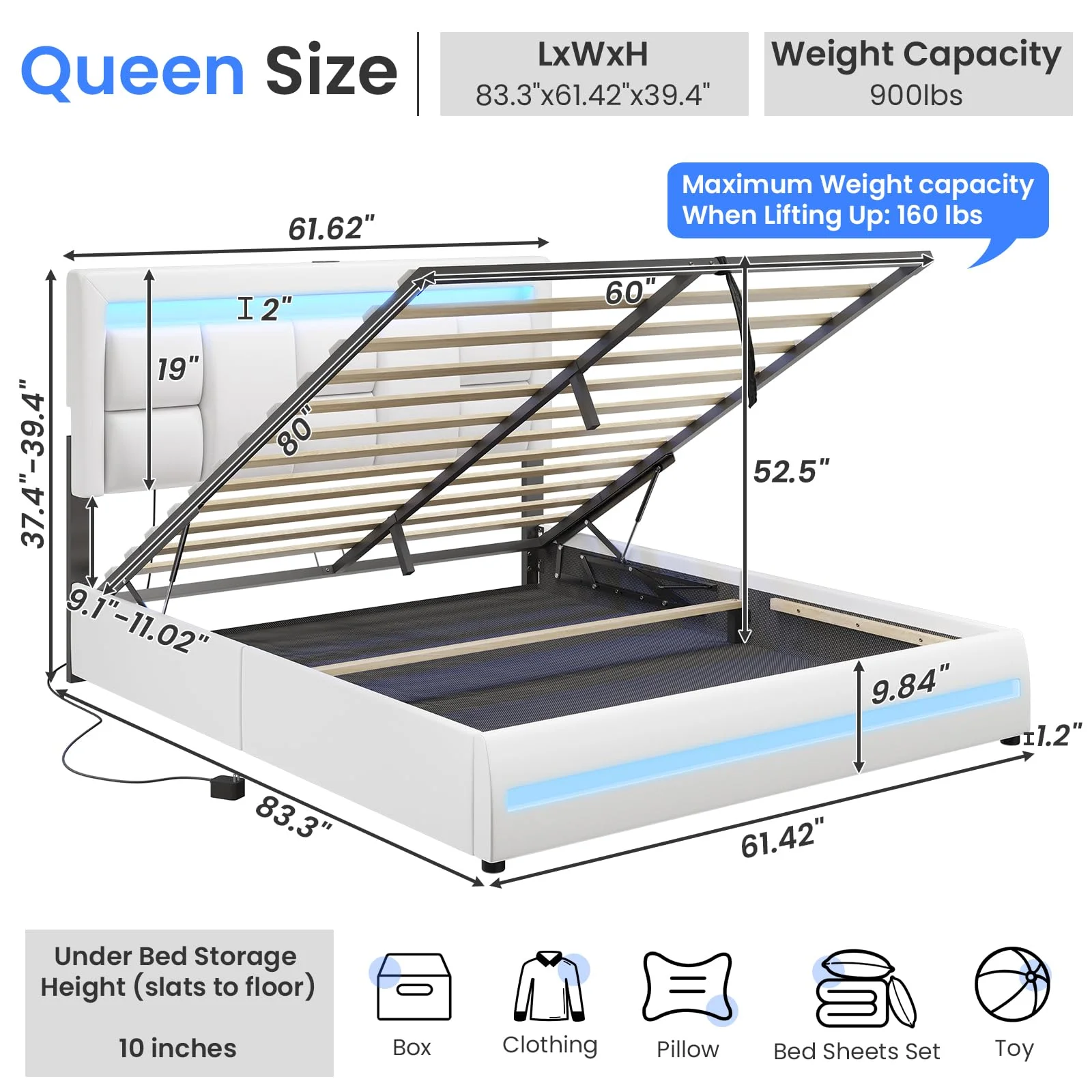 Euroco Upholstered Queen Bed, Platform Bed with Lift up Storage, LED Light Strip and USB Charging, Blue