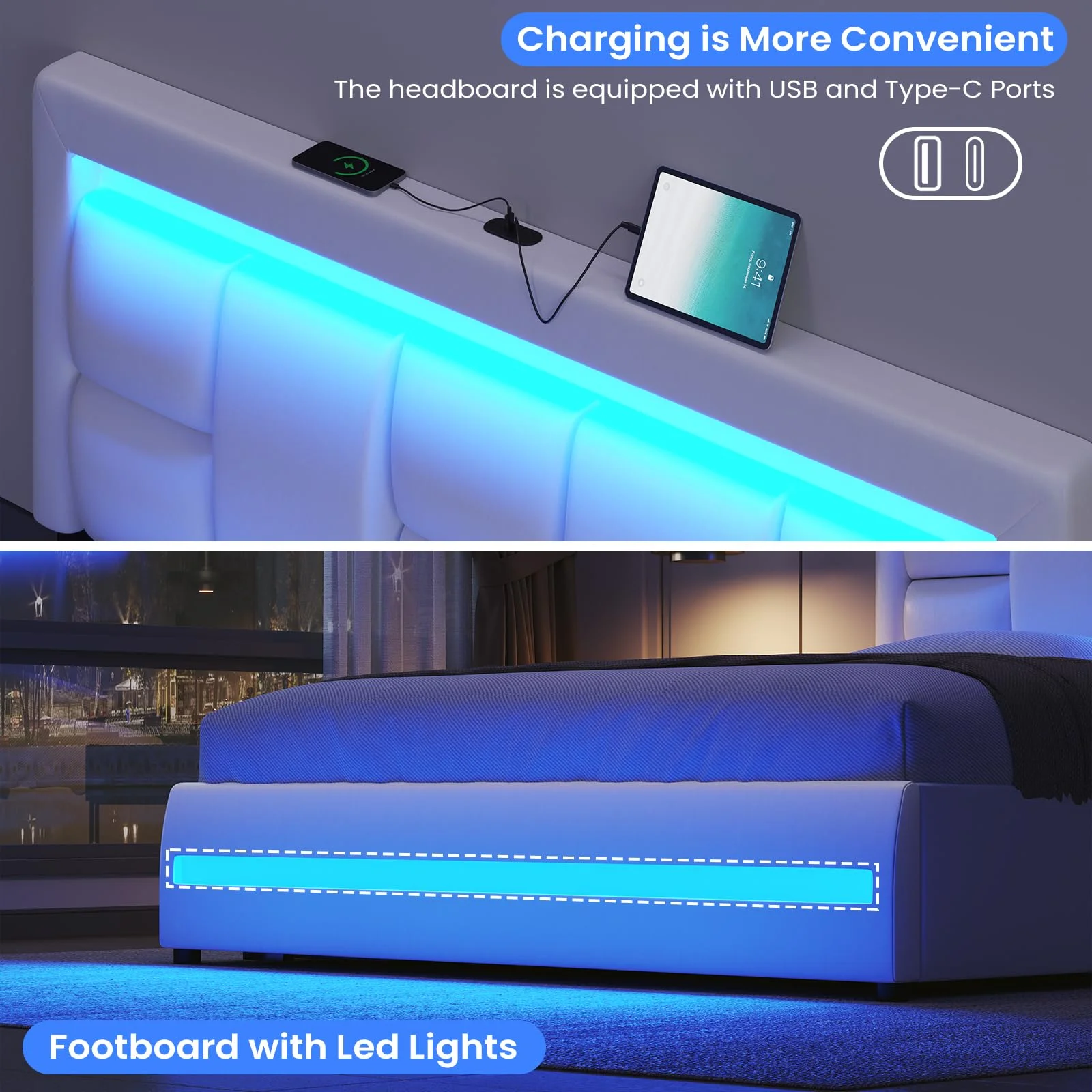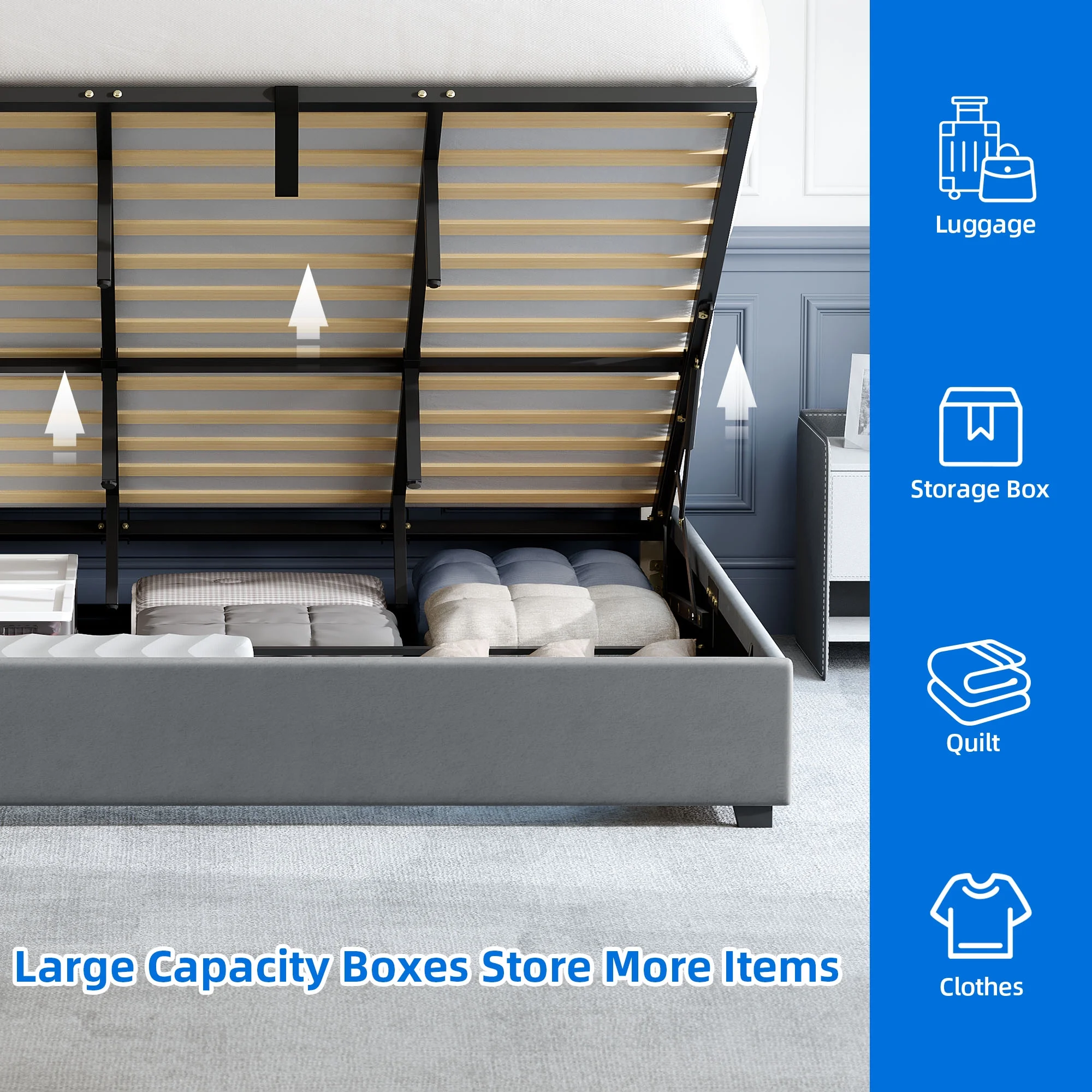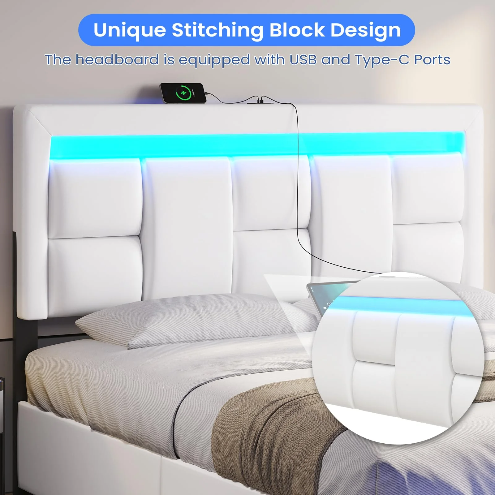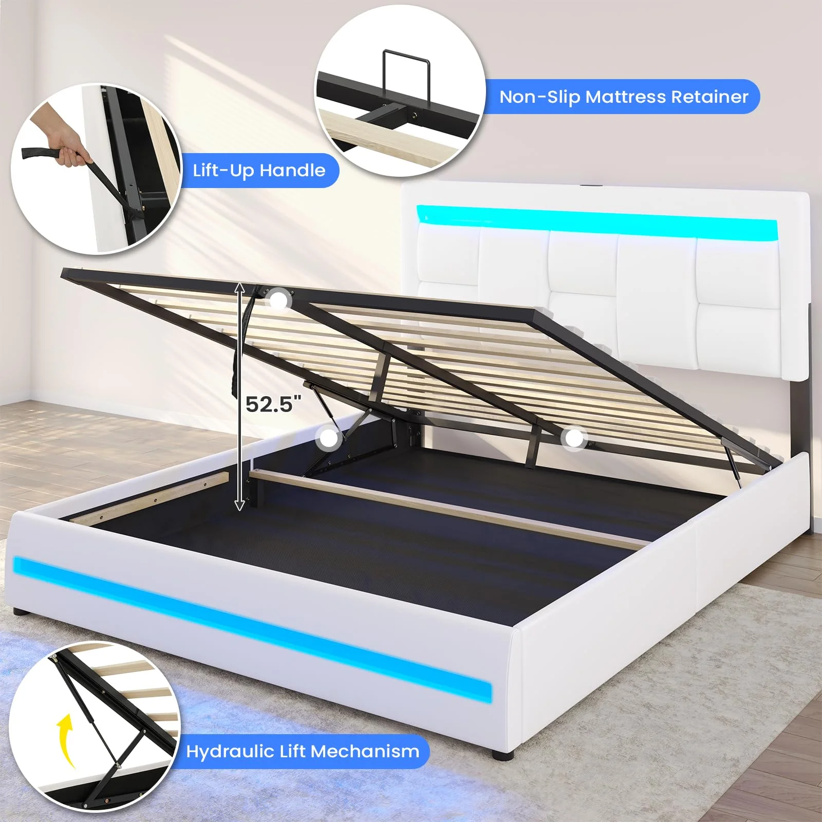 Euroco Upholstered Queen Bed, Platform Bed with Lift up Storage, LED Light Strip and USB Charging, Blue