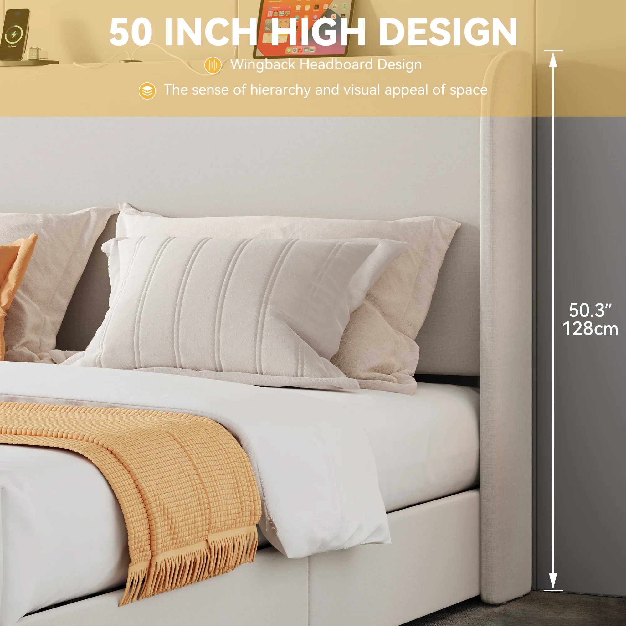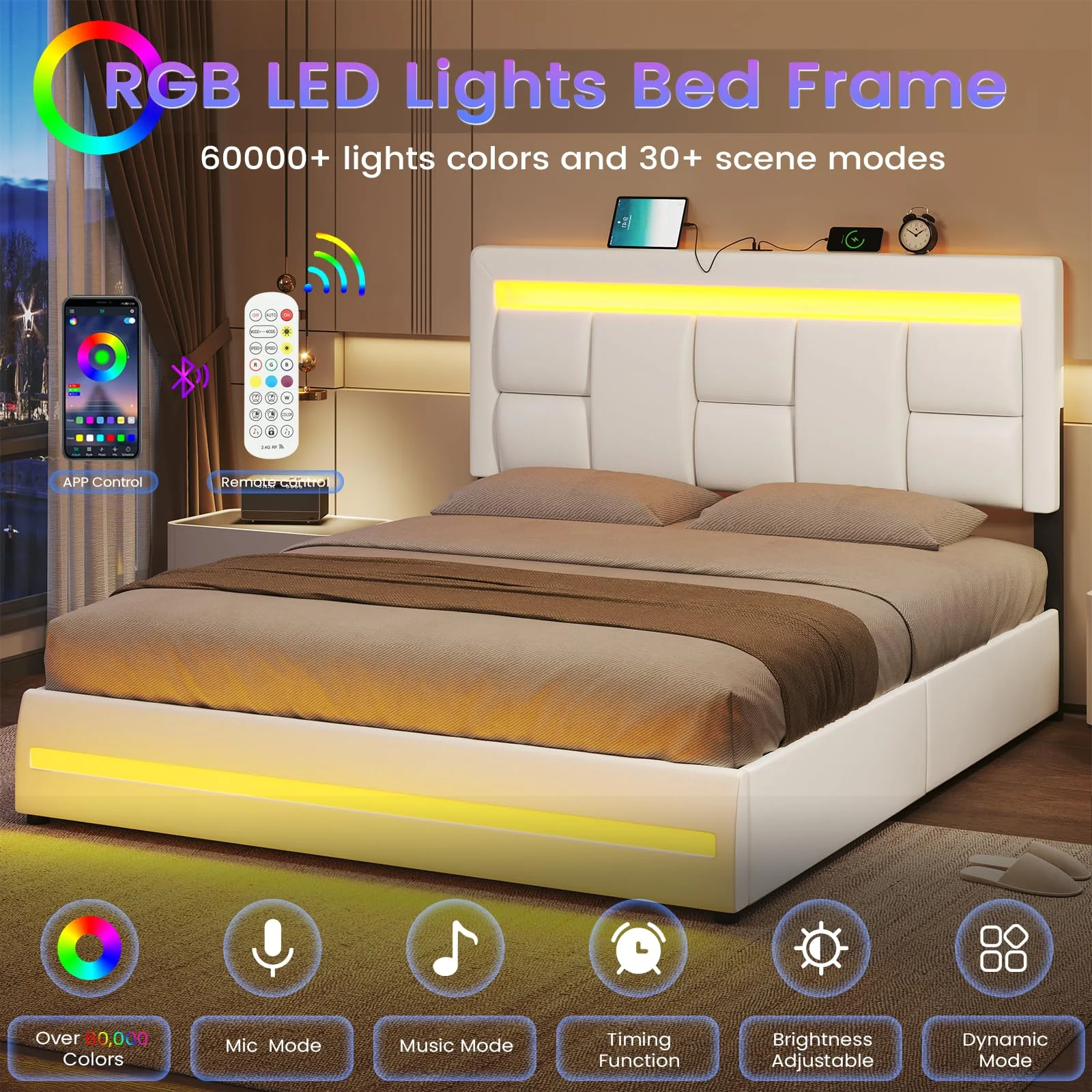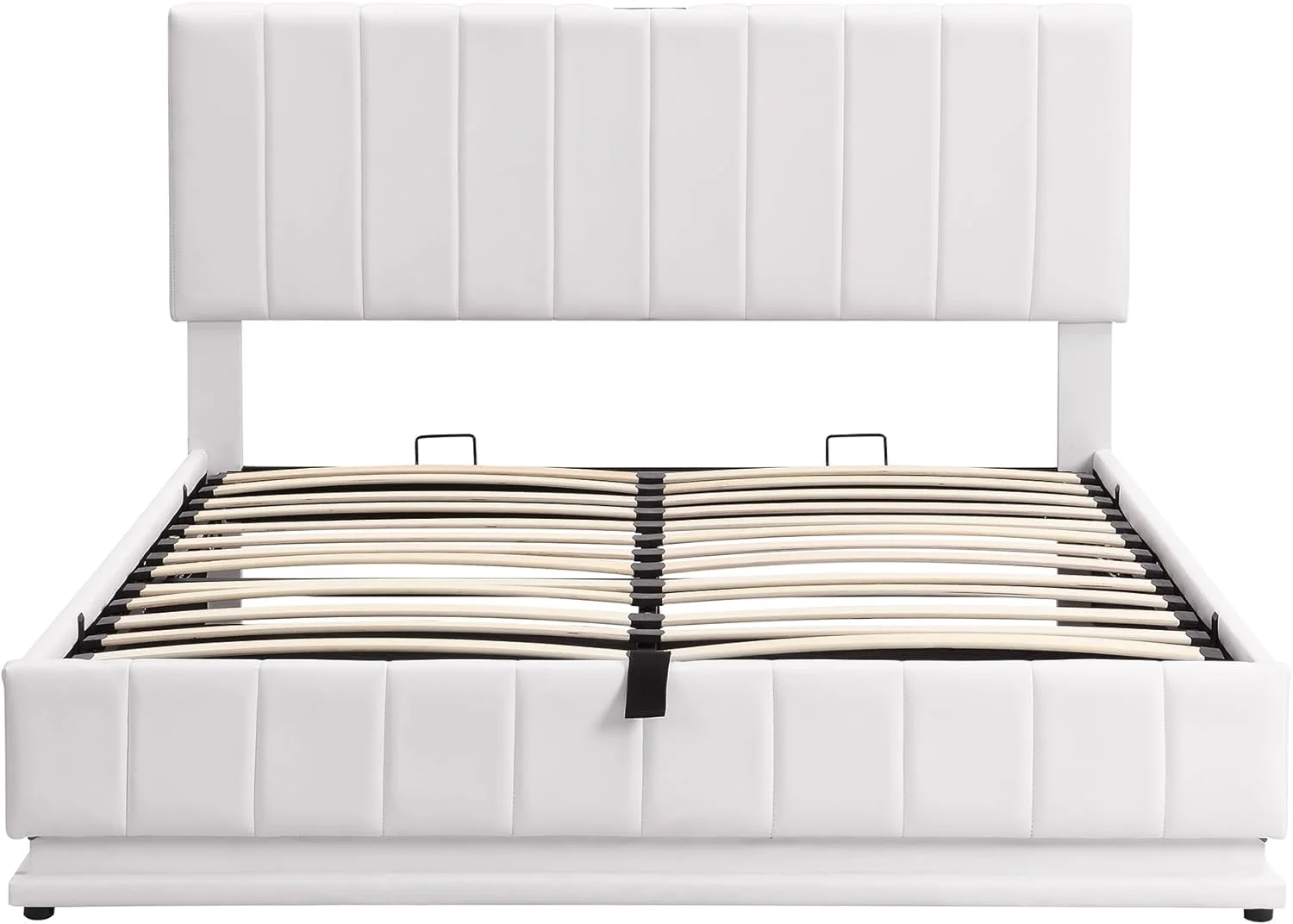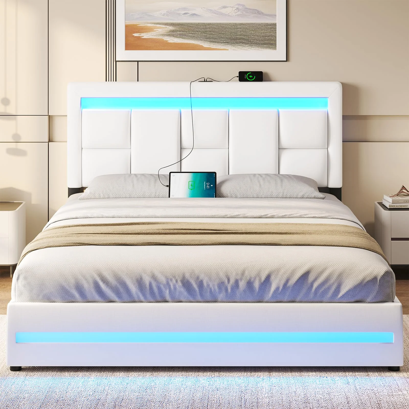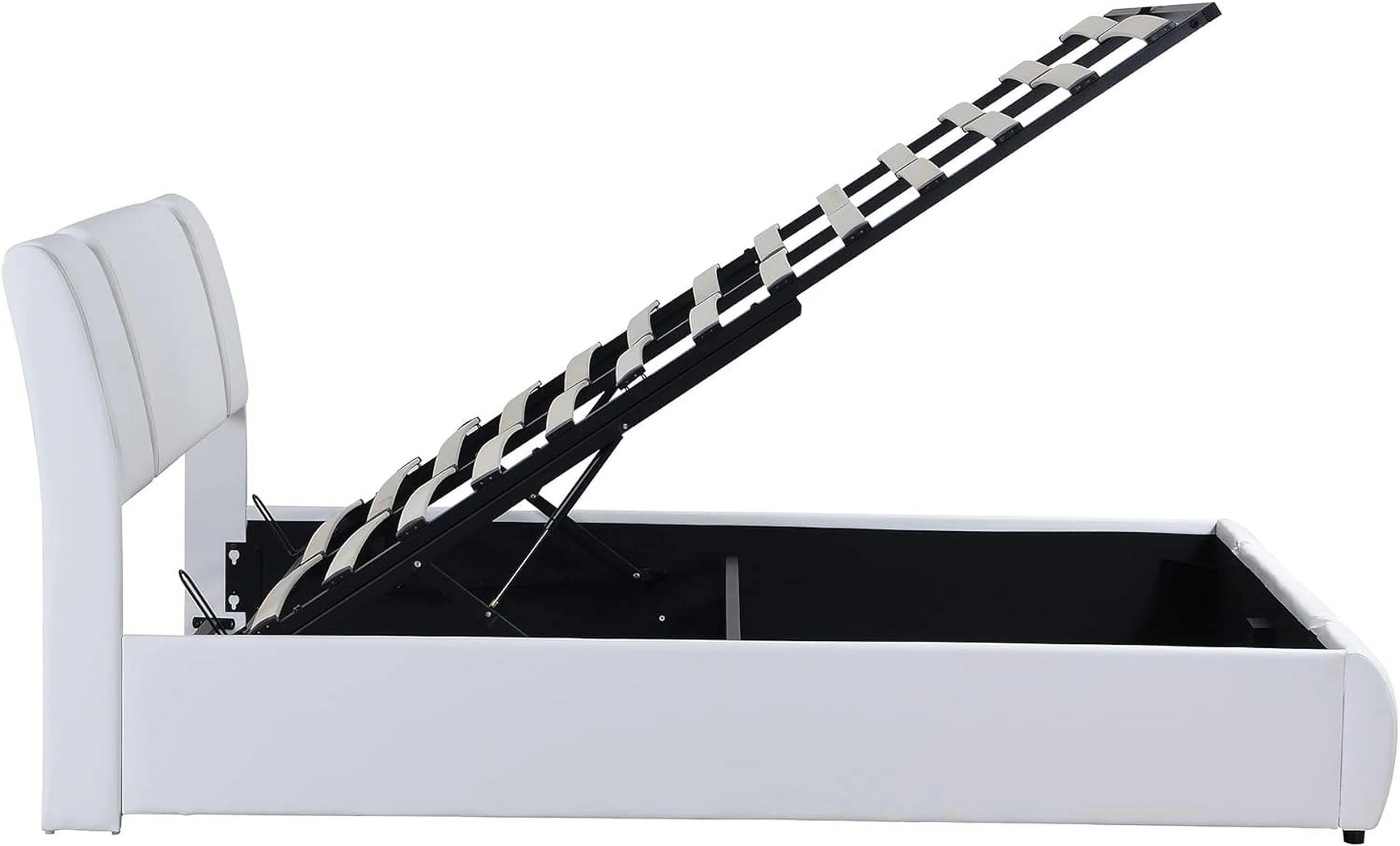 Euroco Upholstered Queen Bed, Platform Bed with Lift up Storage, LED Light Strip and USB Charging, Blue