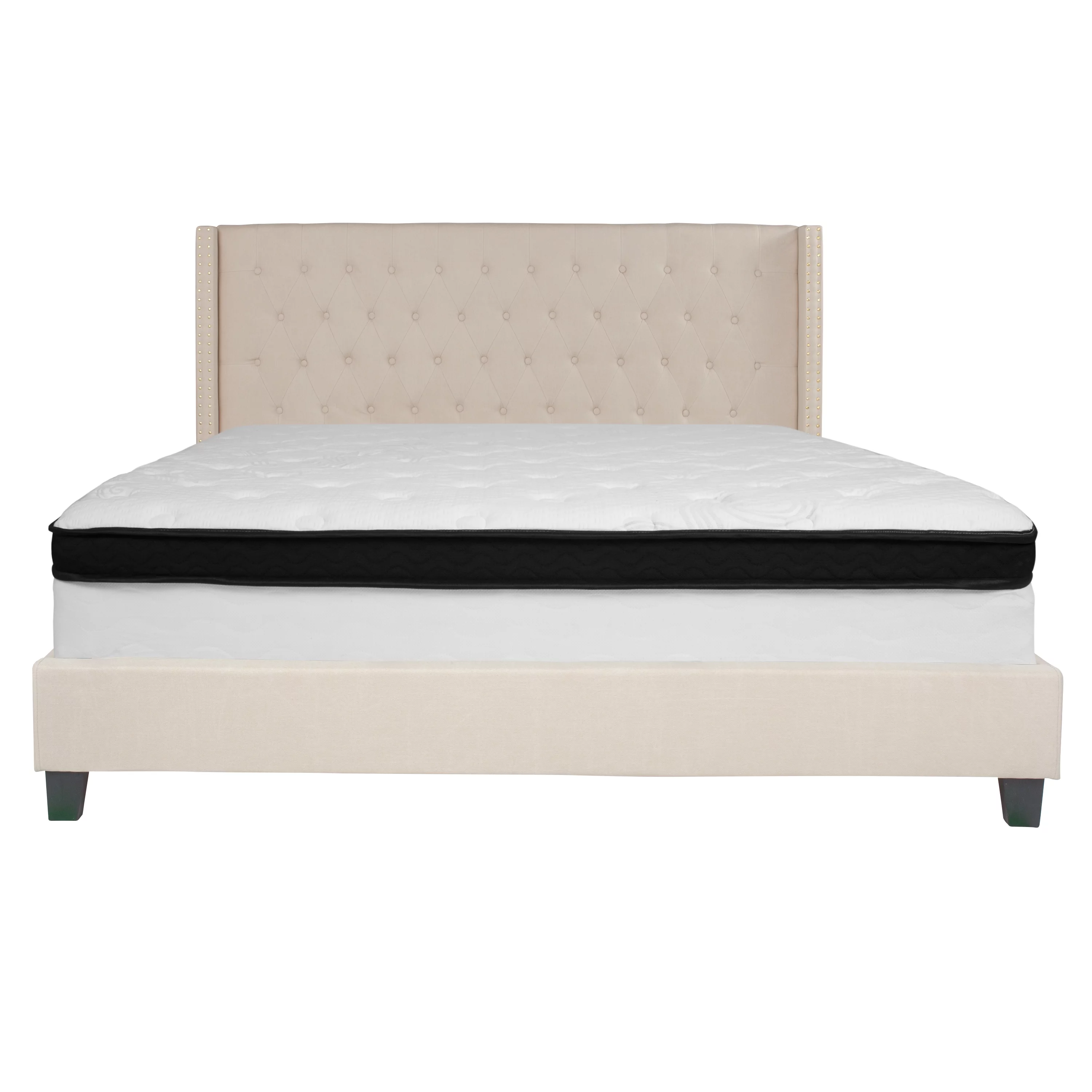 BizChair King Size Tufted Upholstered Platform Bed with Accent Nail Trimmed Extended Sides in Beige Fabric with Mattress
