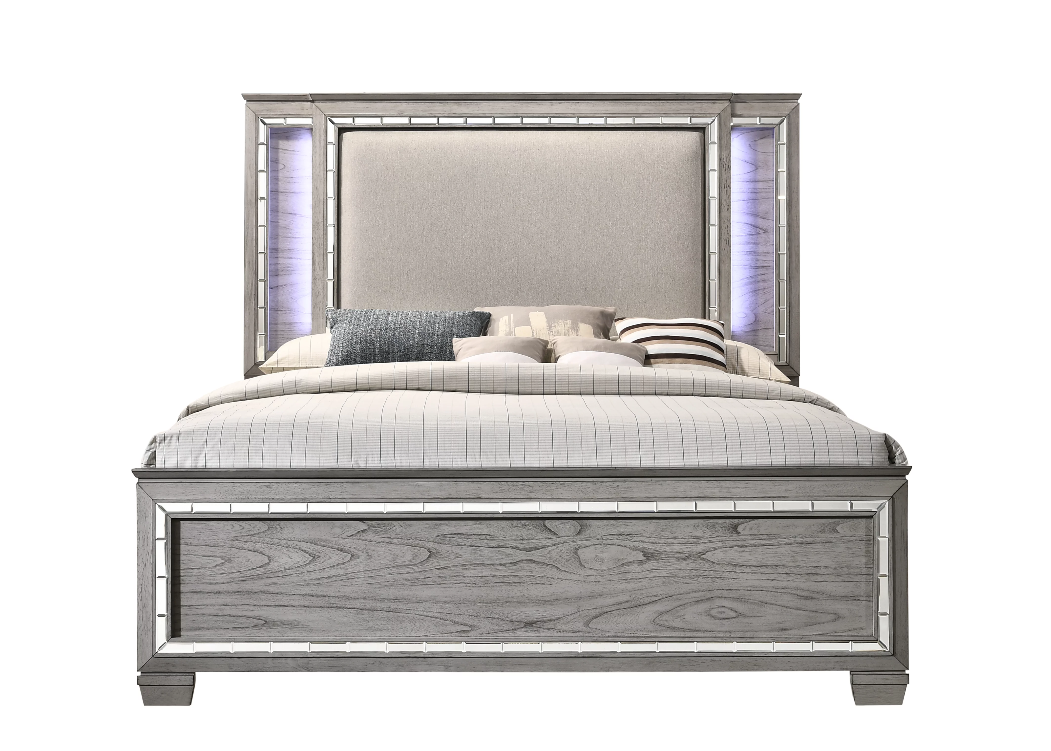 ACME Antares Queen Upholstered Wooden Panel Bed with LED in Gray Oak