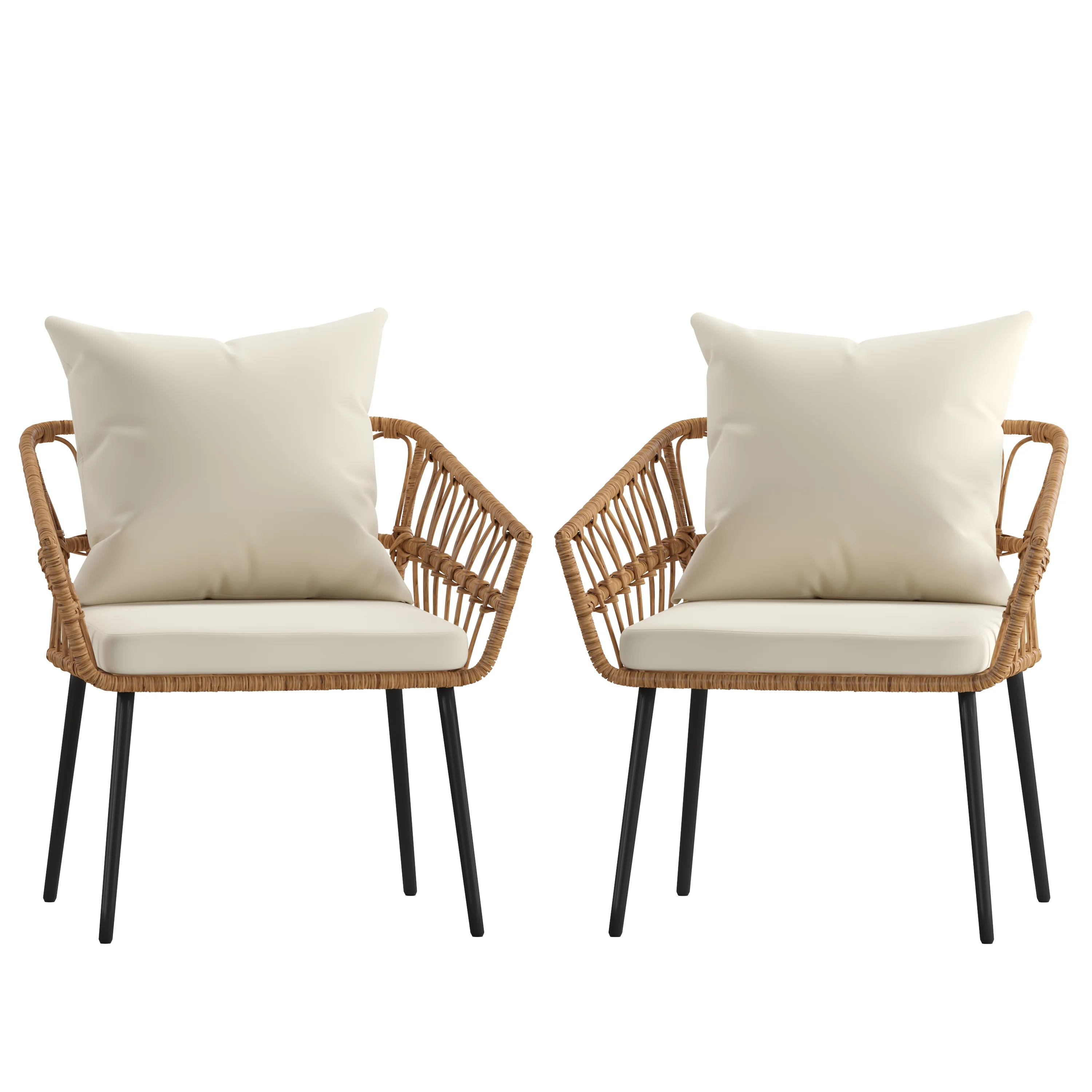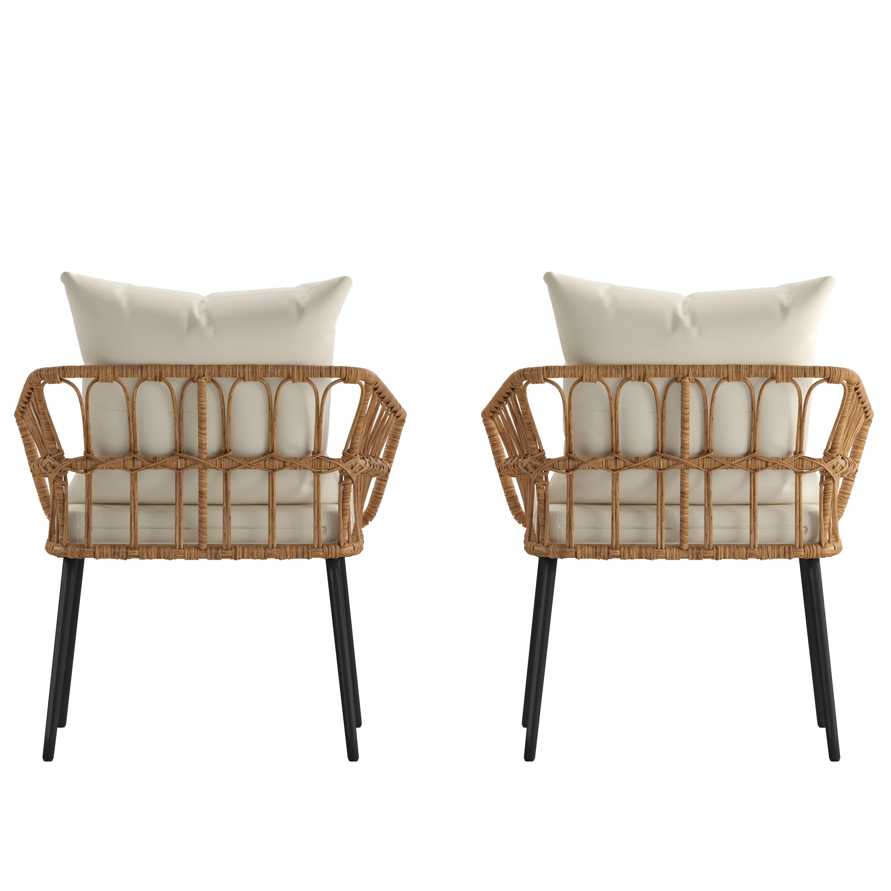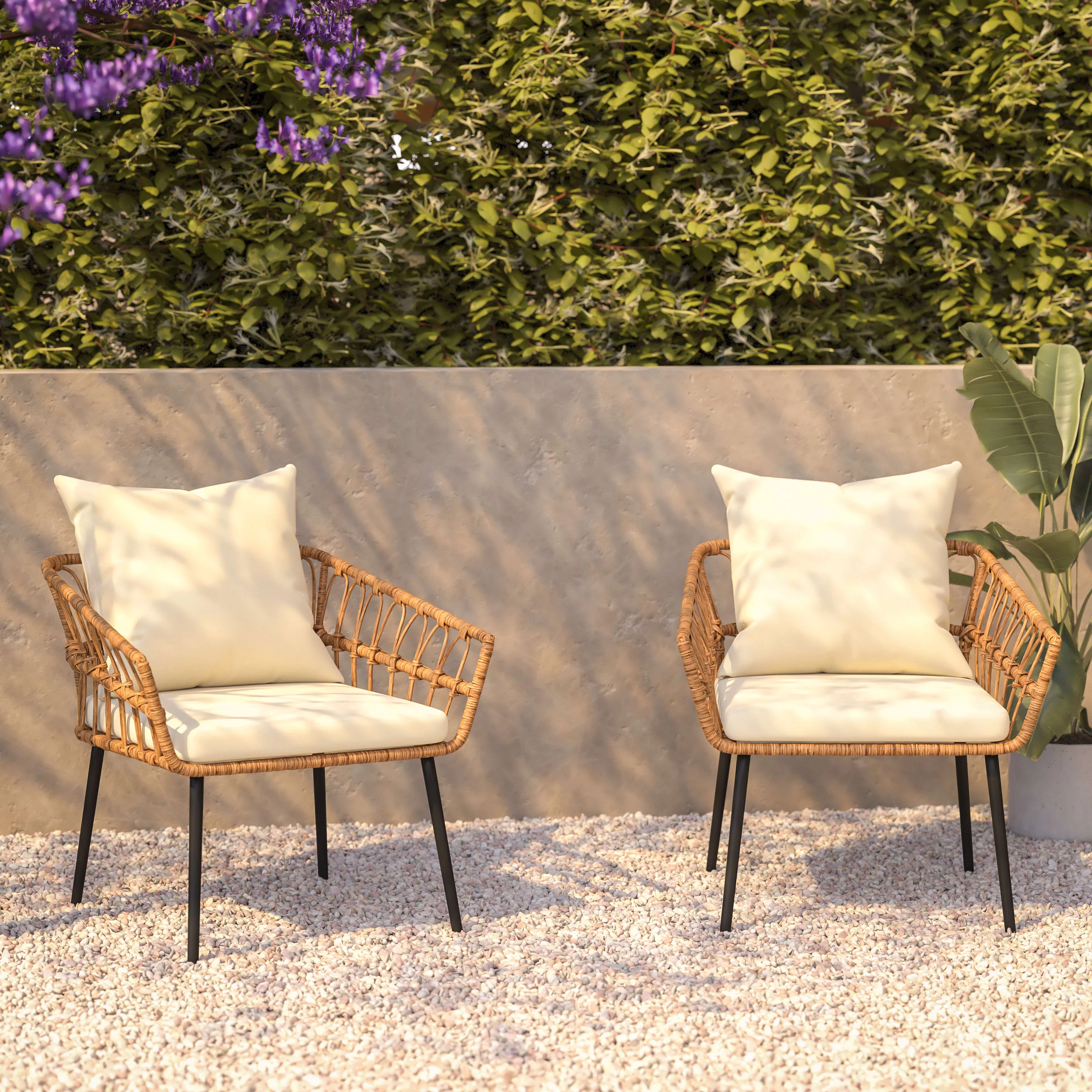 BizChair Evin Set of 2 Boho Indoor/Outdoor Rope Rattan Wicker Patio Chairs with Cream All-Weather Cushions, Natural