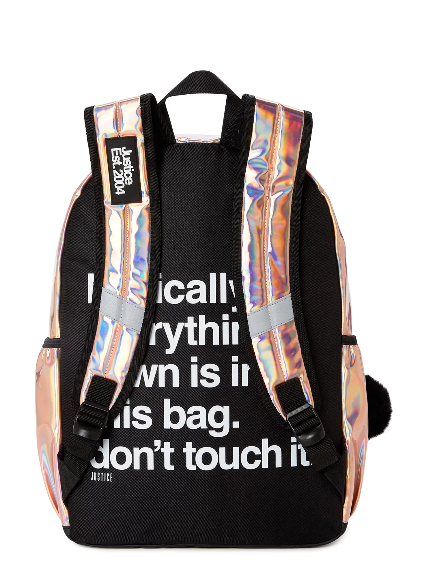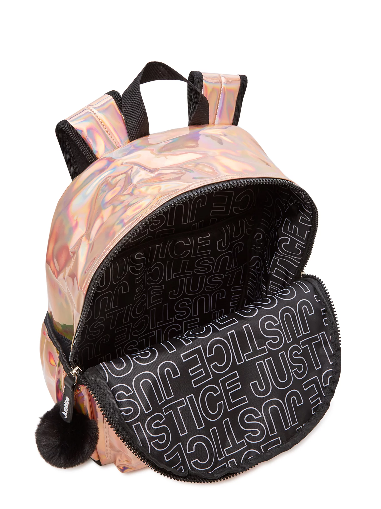 Justice Girls 17" Laptop Backpack with Pom Pom Dangle, Iridescent Rose Gold