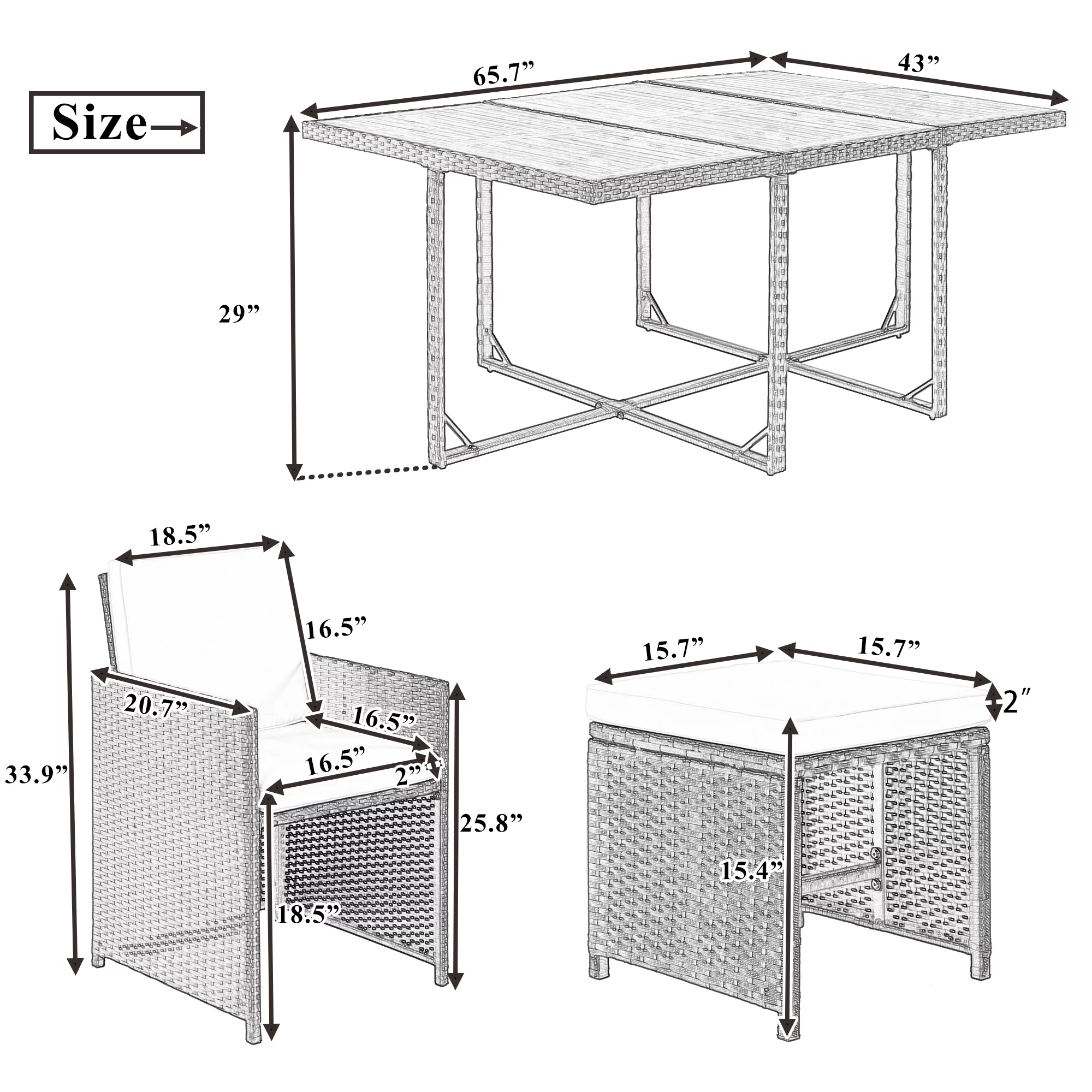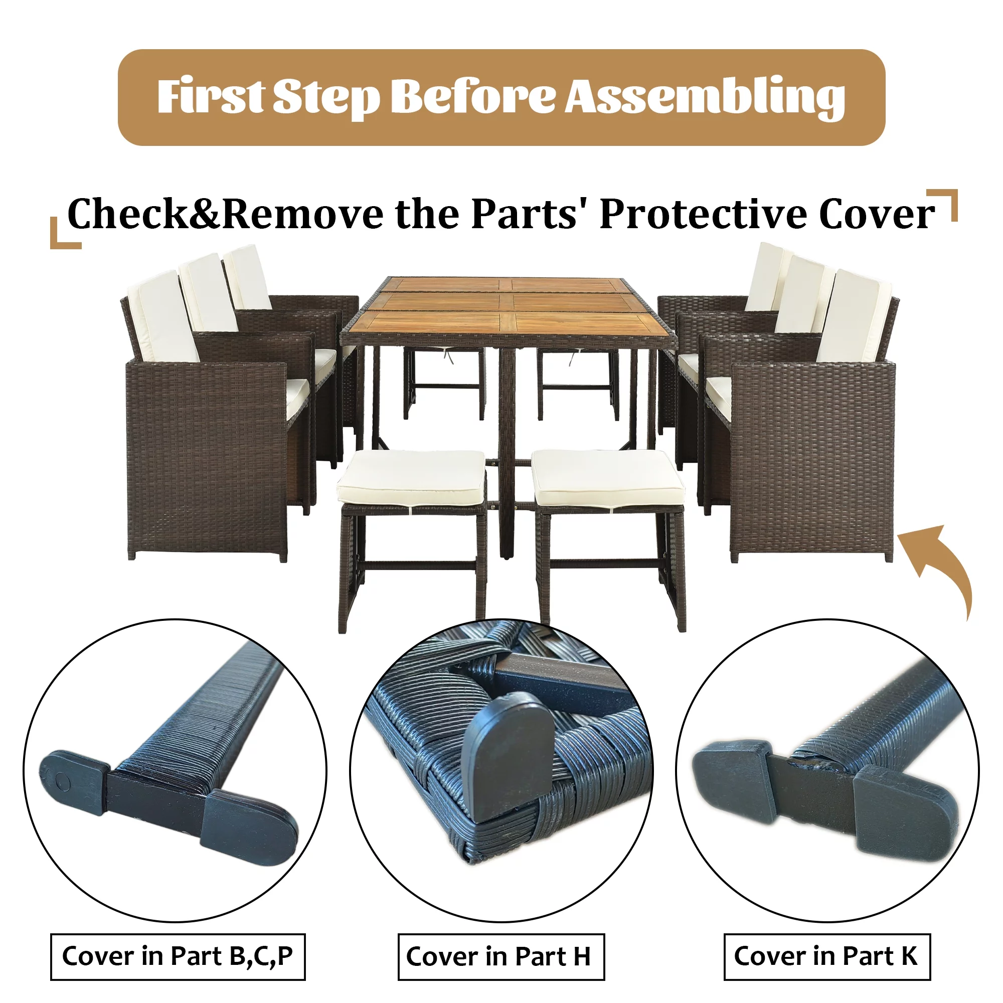 Euroco 11 Pieces Patio Dining Table Set All-Weather PE Wicker Table Set for 10 Persons, Brown Rattan & Beige Cushion