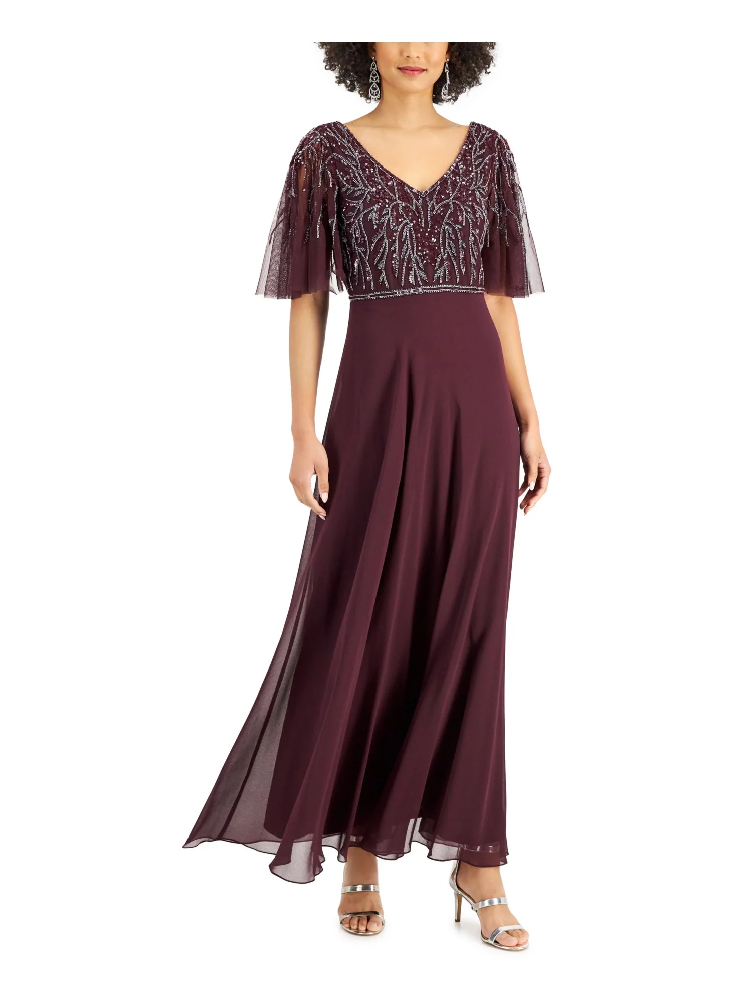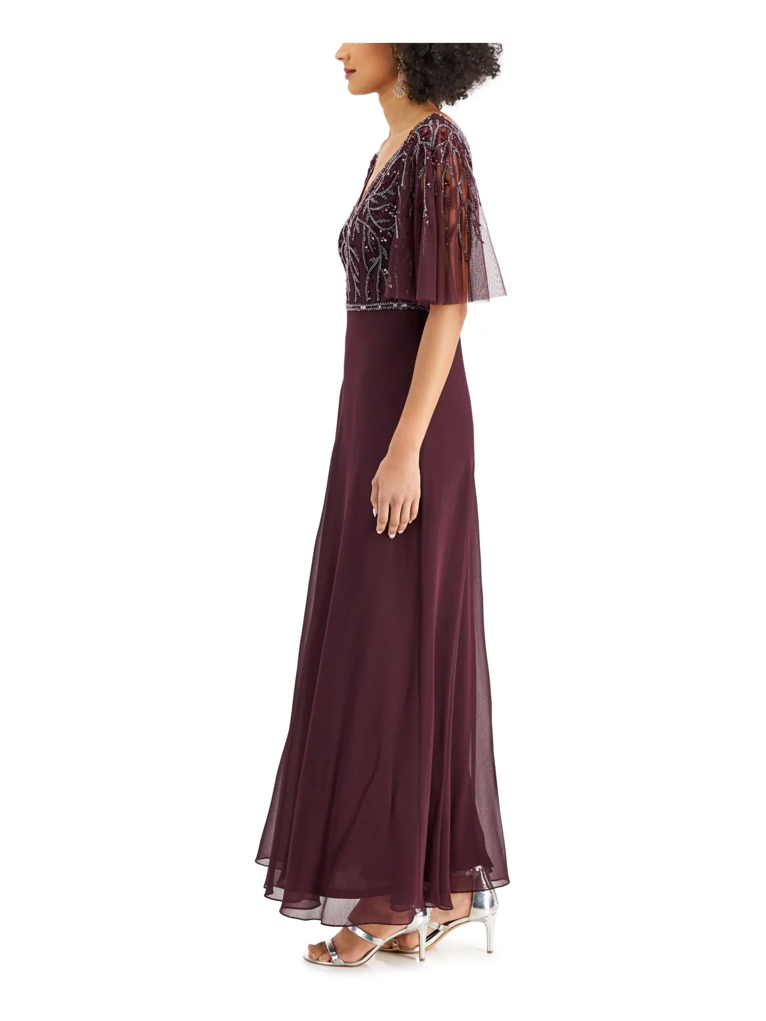JKARA Womens Burgundy Beaded Sequined Sheer Lined Flutter Sleeve V Neck Full-Length Evening Gown Dress 14