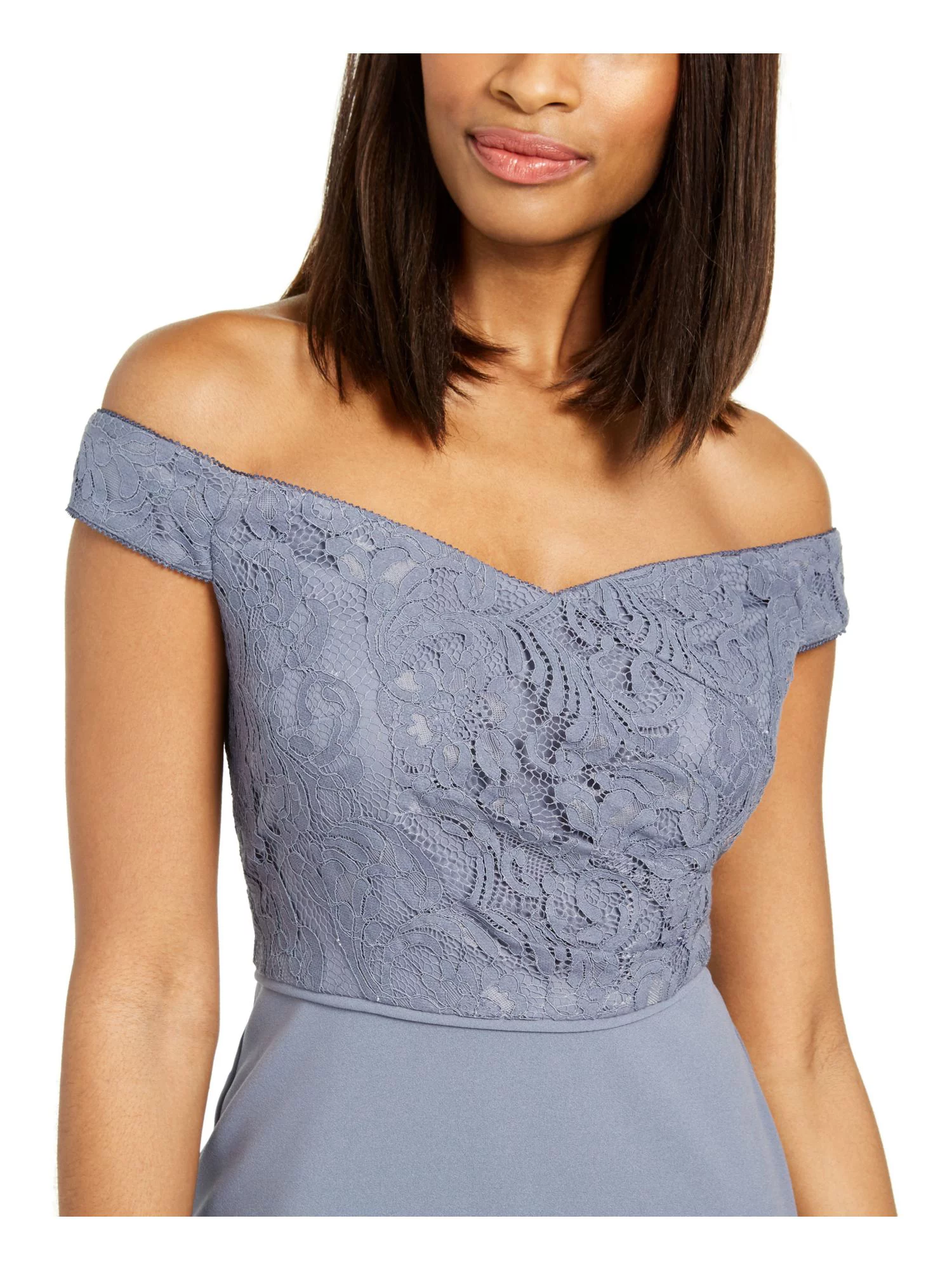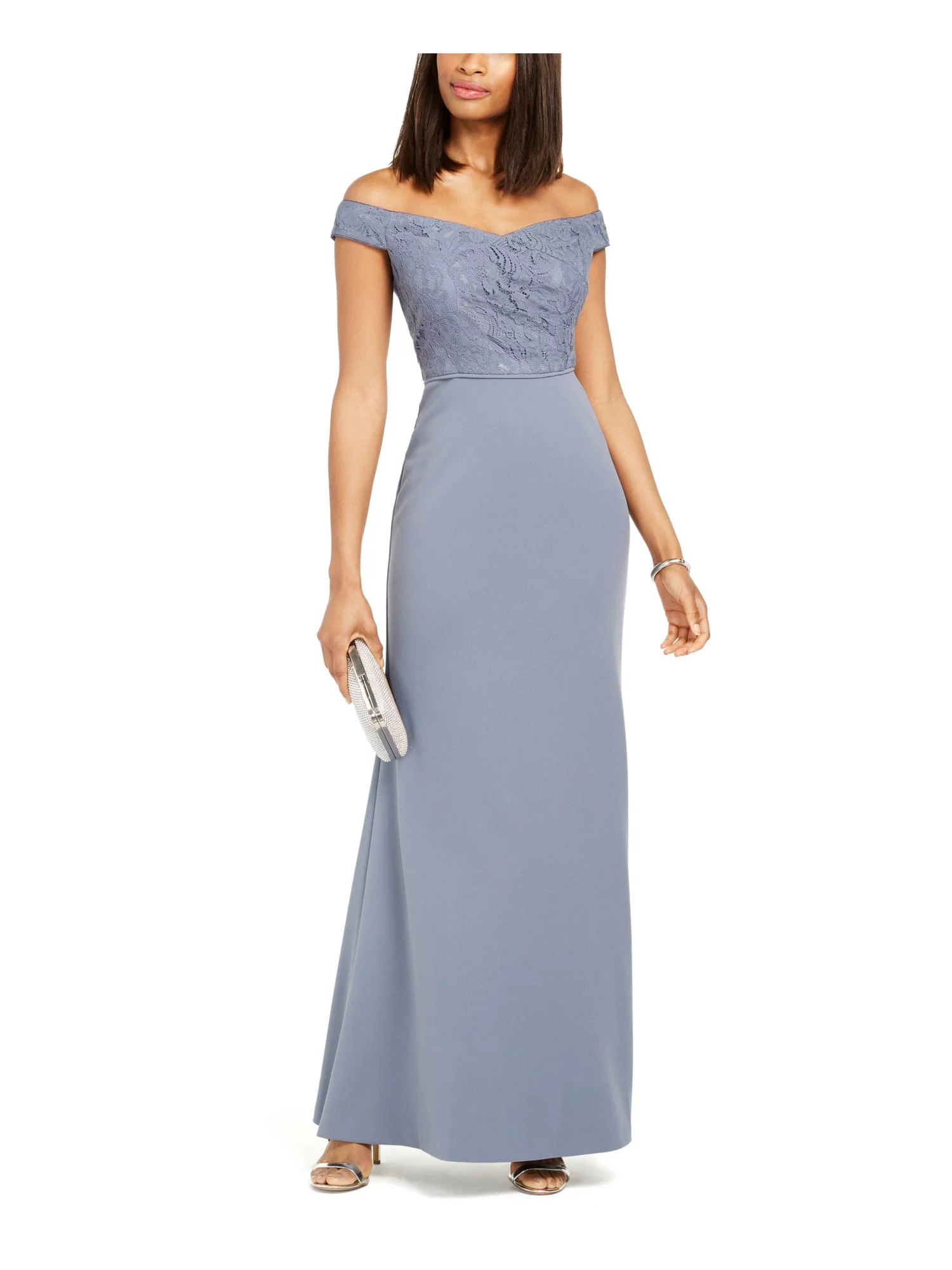 ADRIANNA PAPELL Womens Blue Lace Zippered Short Sleeve Off Shoulder Full-Length Formal Sheath Dress 8