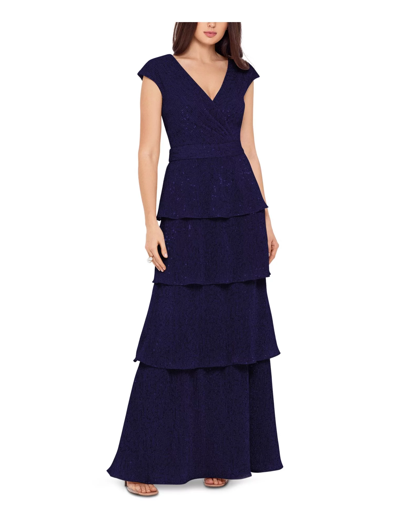 XSCAPE Womens Navy Sequined Zippered Tiered Cap Sleeve V Neck Full-Length Evening Dress 4