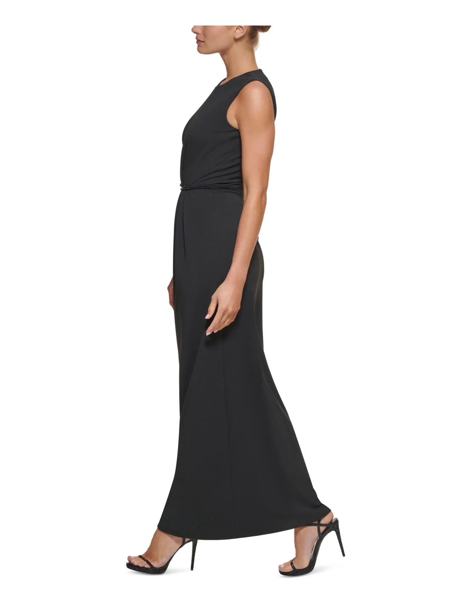 DKNY Womens Black Stretch Beaded Zippered Back Slit Lined Sleeveless Round Neck Full-Length Formal Gown Dress 16