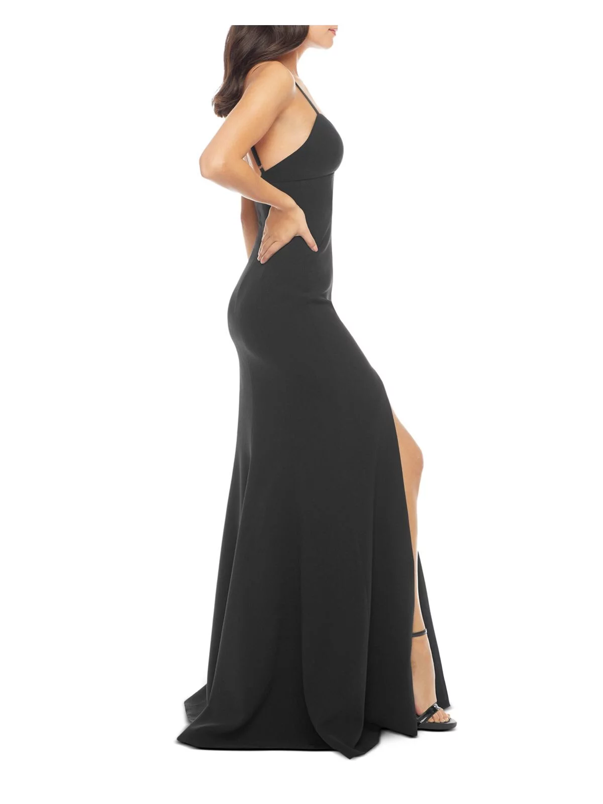 XSCAPE Womens Black Stretch Slitted Zippered Cascade Ruffle Lined Spaghetti Strap V Neck Full-Length Formal Gown Dress 2