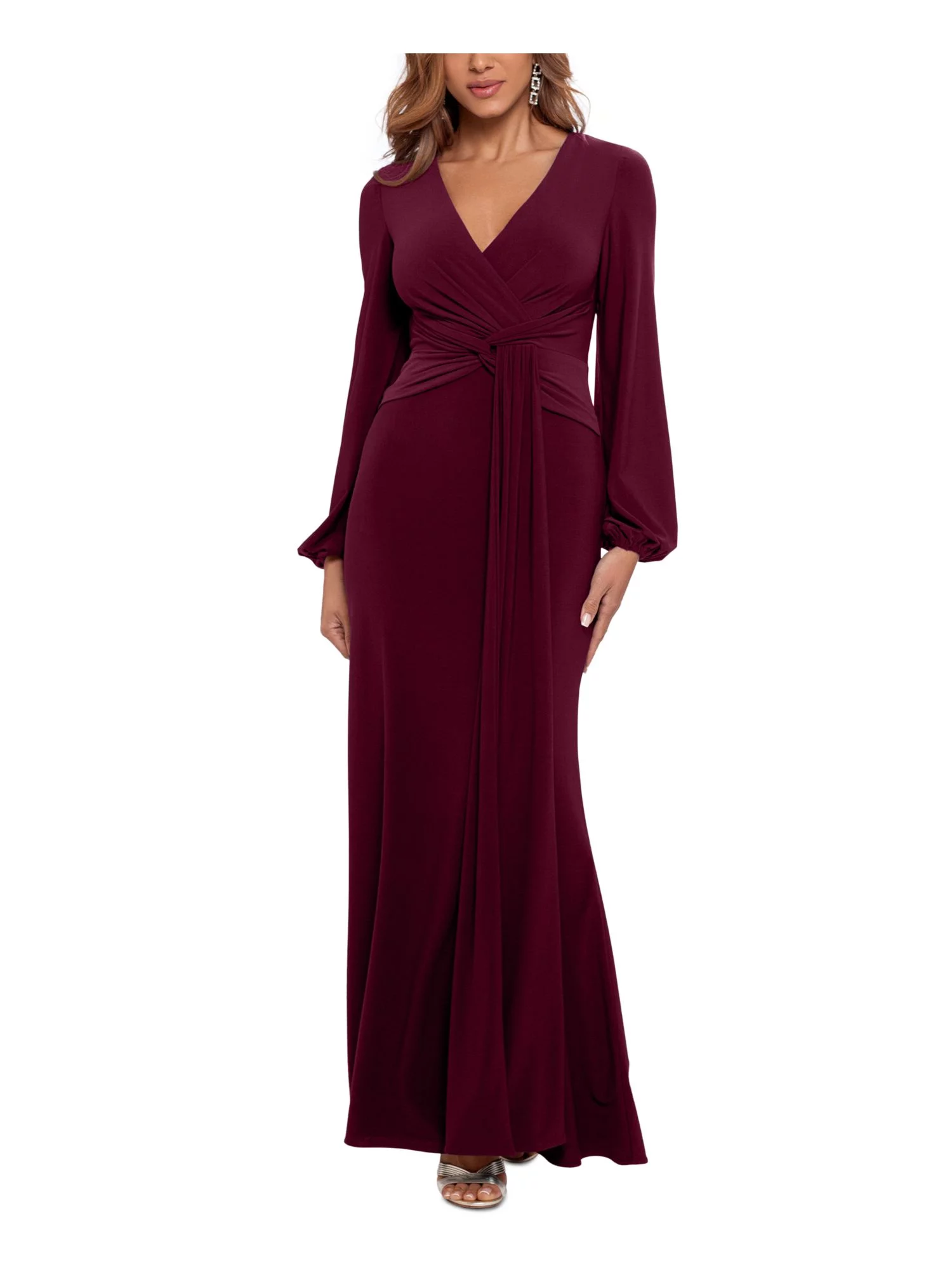 BETSY & ADAM Womens Maroon Stretch Zippered Draped Lined Long Sleeve V Neck Full-Length Evening Gown Dress 6