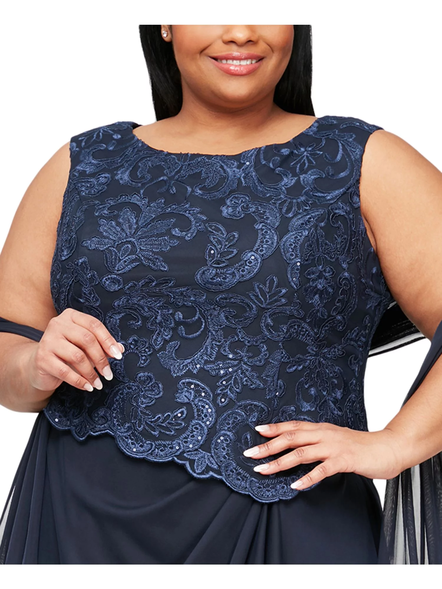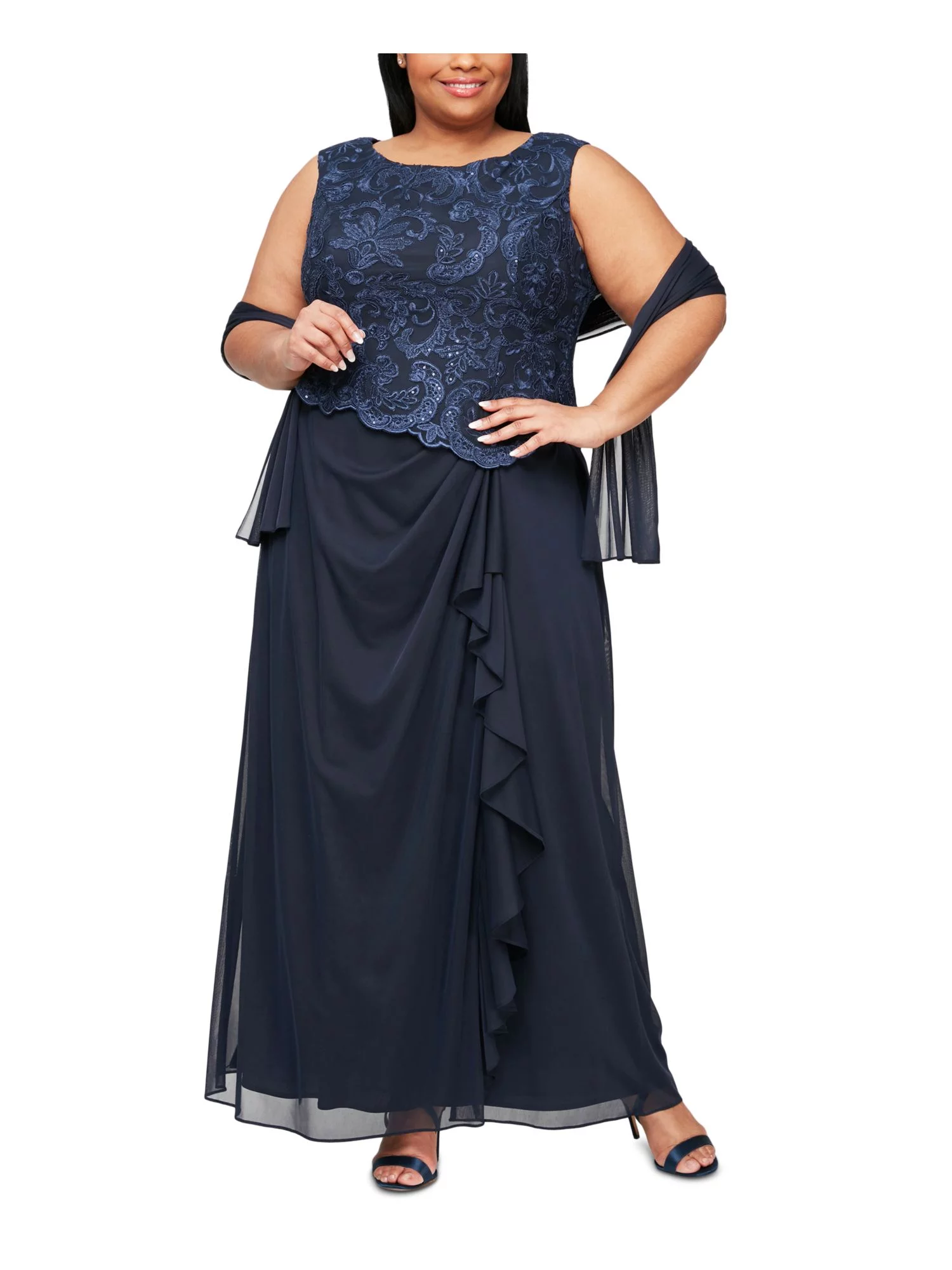 ALEX EVENINGS Womens Navy Zippered Ruffled Sheer Shawl Sleeveless Jewel Neck Full-Length Evening Dress Plus 22W