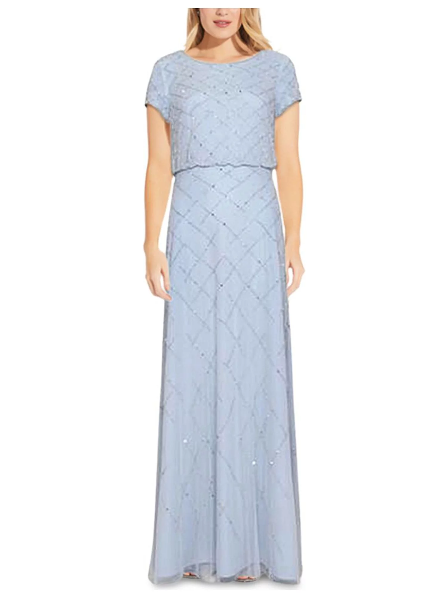 ADRIANNA PAPELL Womens Light Blue Beaded Sequined Zippered Short Sleeve Scoop Neck Full-Length Party Gown Dress 6