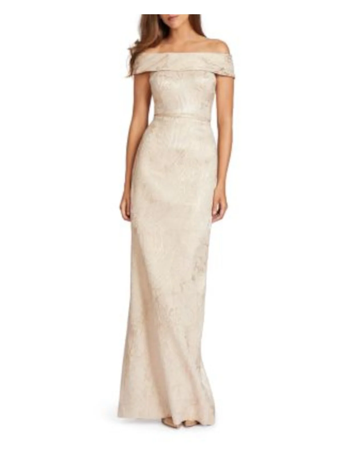 TERI JON Womens Gold Zippered Slitted Column Gown Lined Short Sleeve Off Shoulder Full-Length Evening Dress 12
