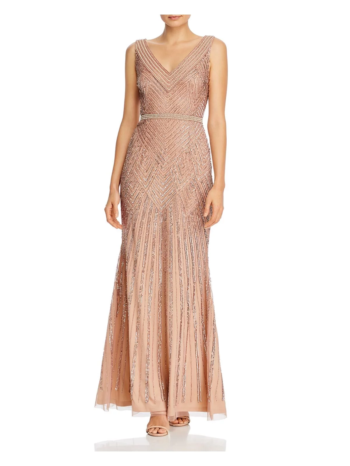 ADRIANNA PAPELL Womens Beige Beaded Sheer Zippered Sleeveless Halter Full-Length Formal Sheath Dress 6