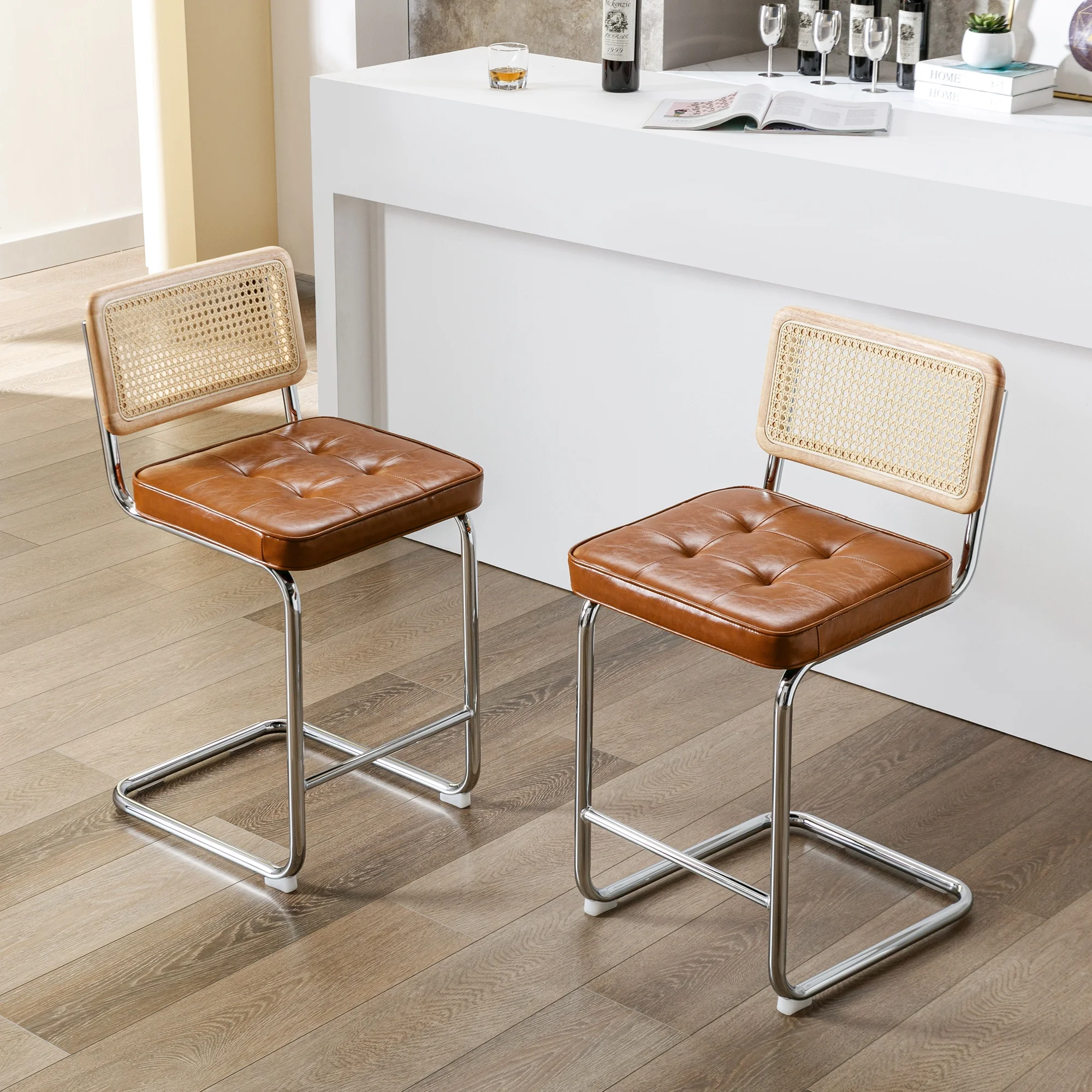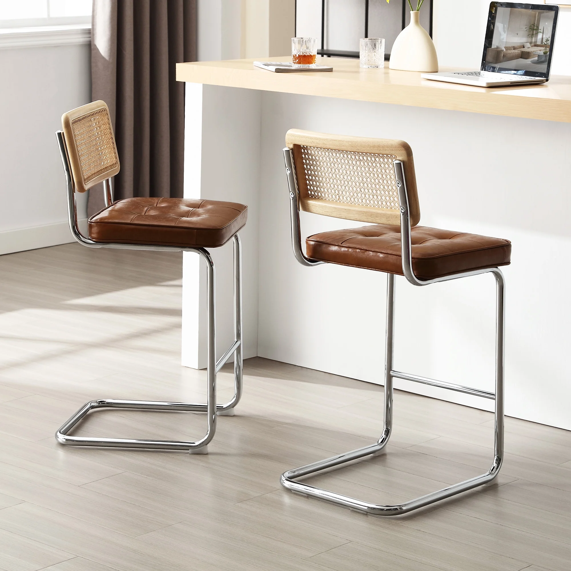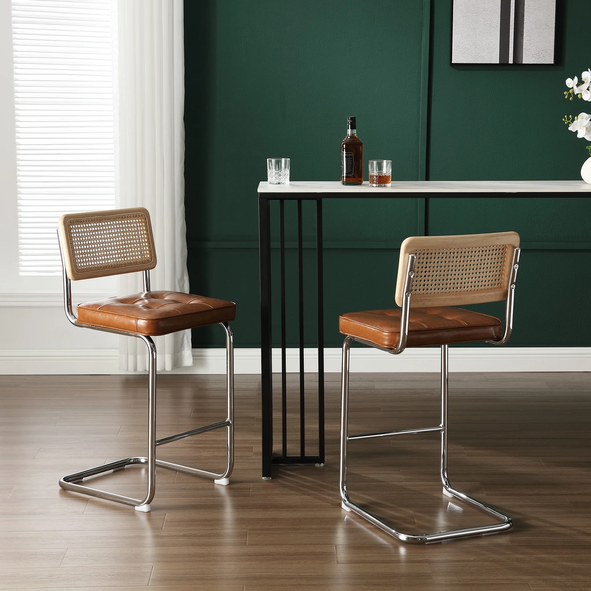 GDF Studio Oneida Rustic Fabric Upholstered Wood and Cane 30 inch Barstools, Set of 2, Charcoal and Natural