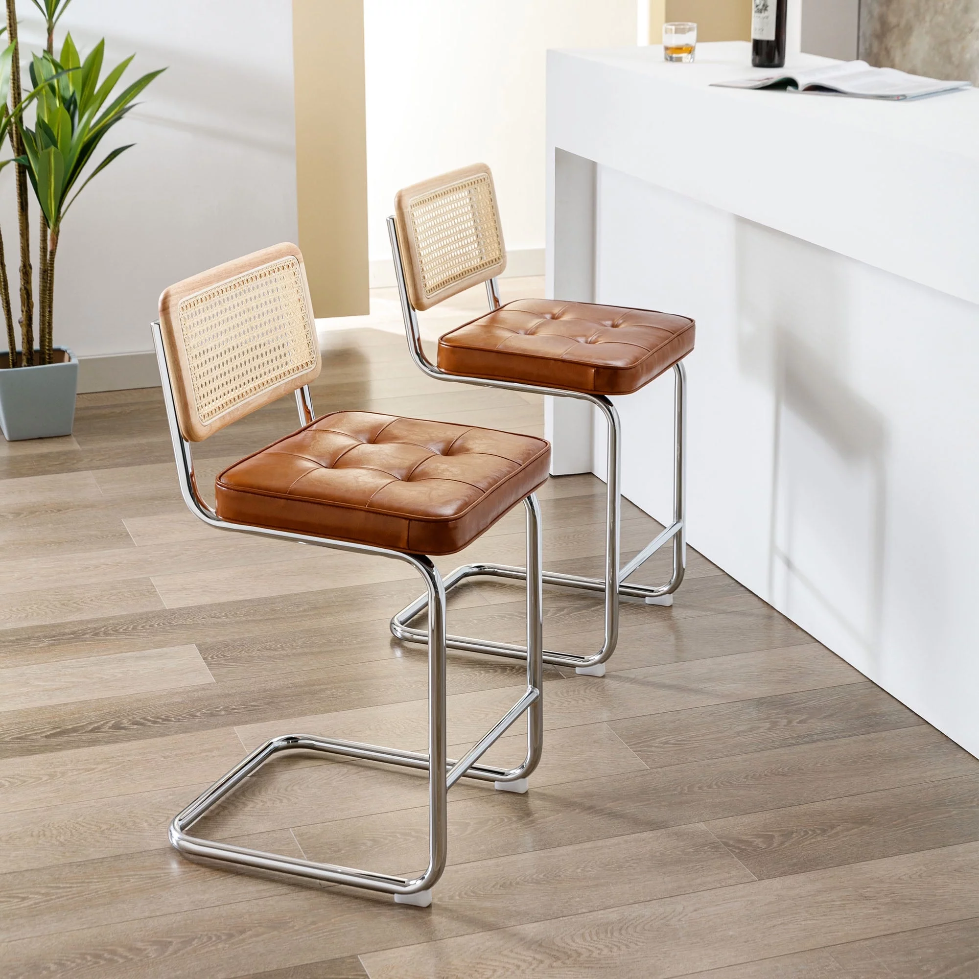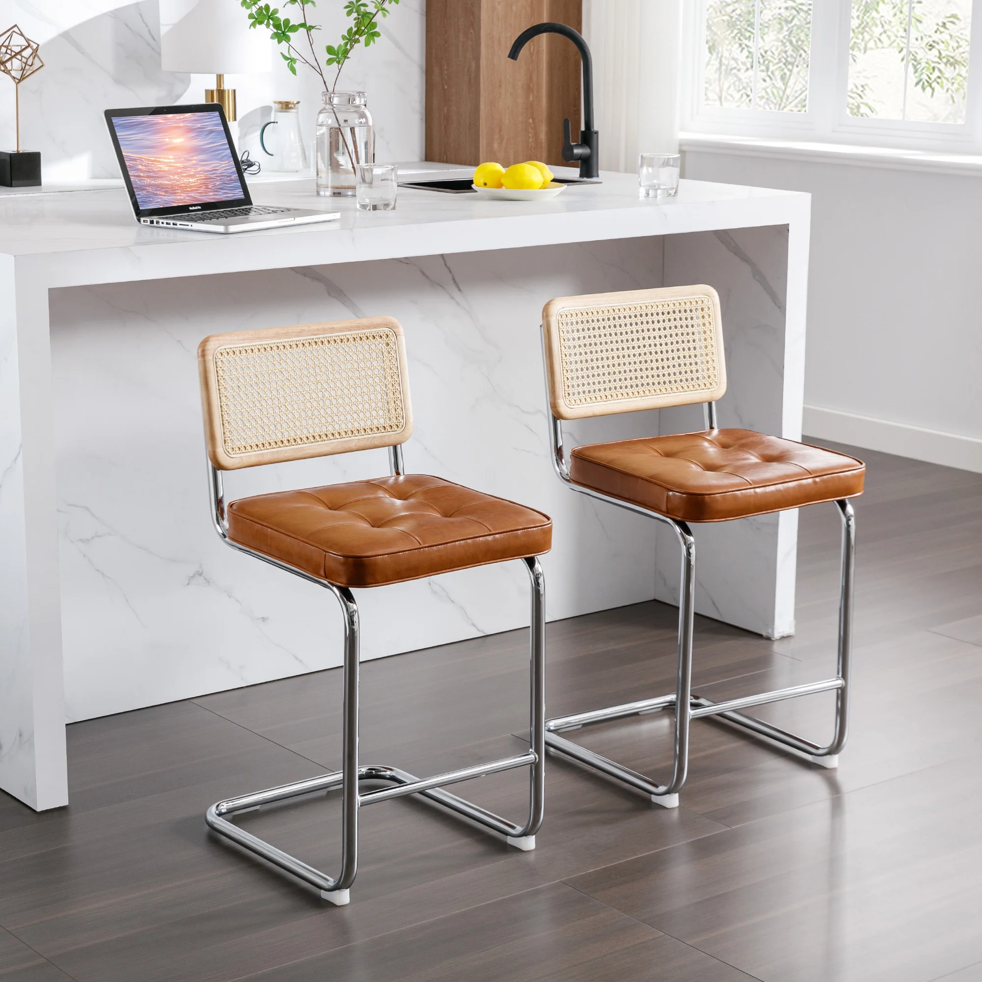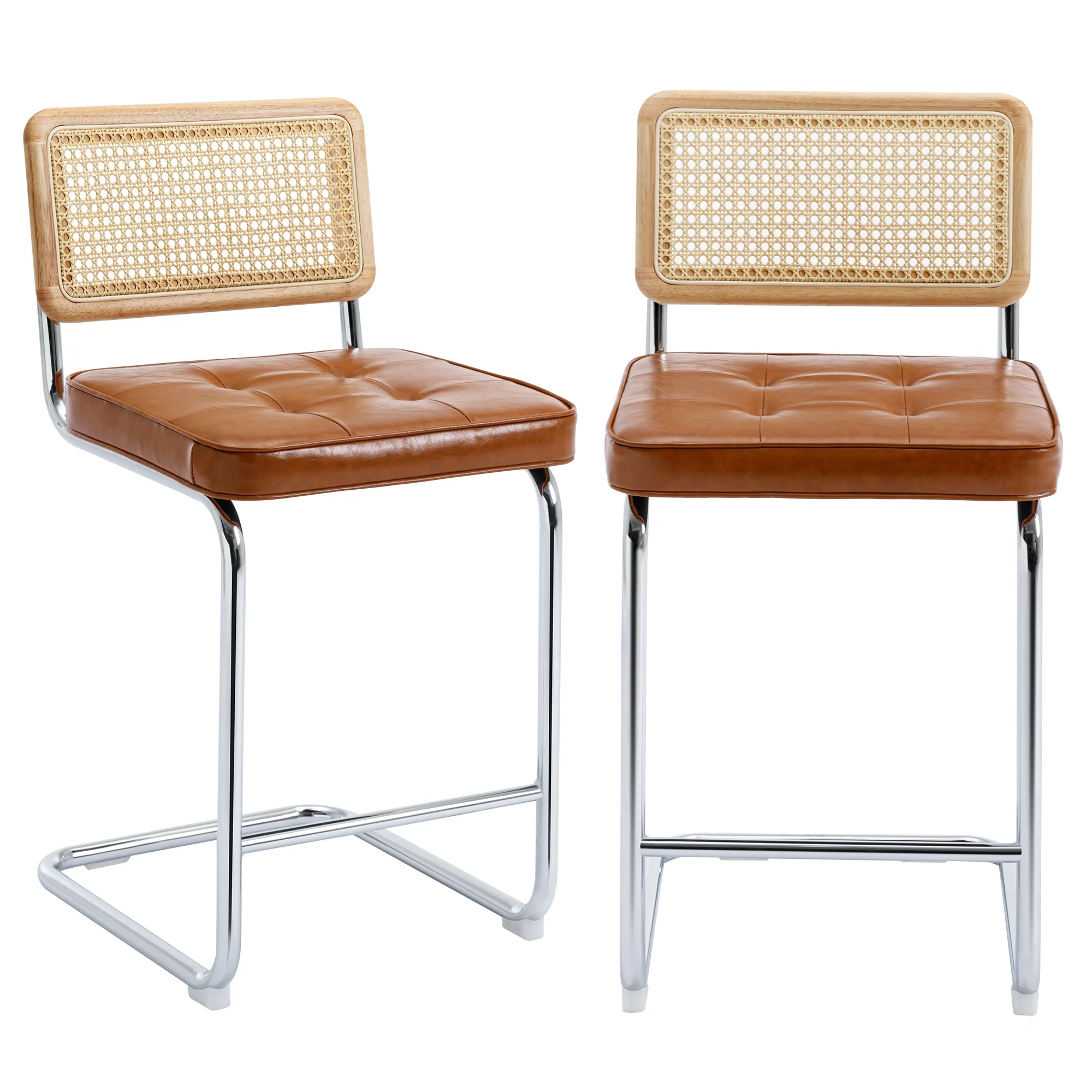 GDF Studio Oneida Rustic Fabric Upholstered Wood and Cane 30 inch Barstools, Set of 2, Charcoal and Natural