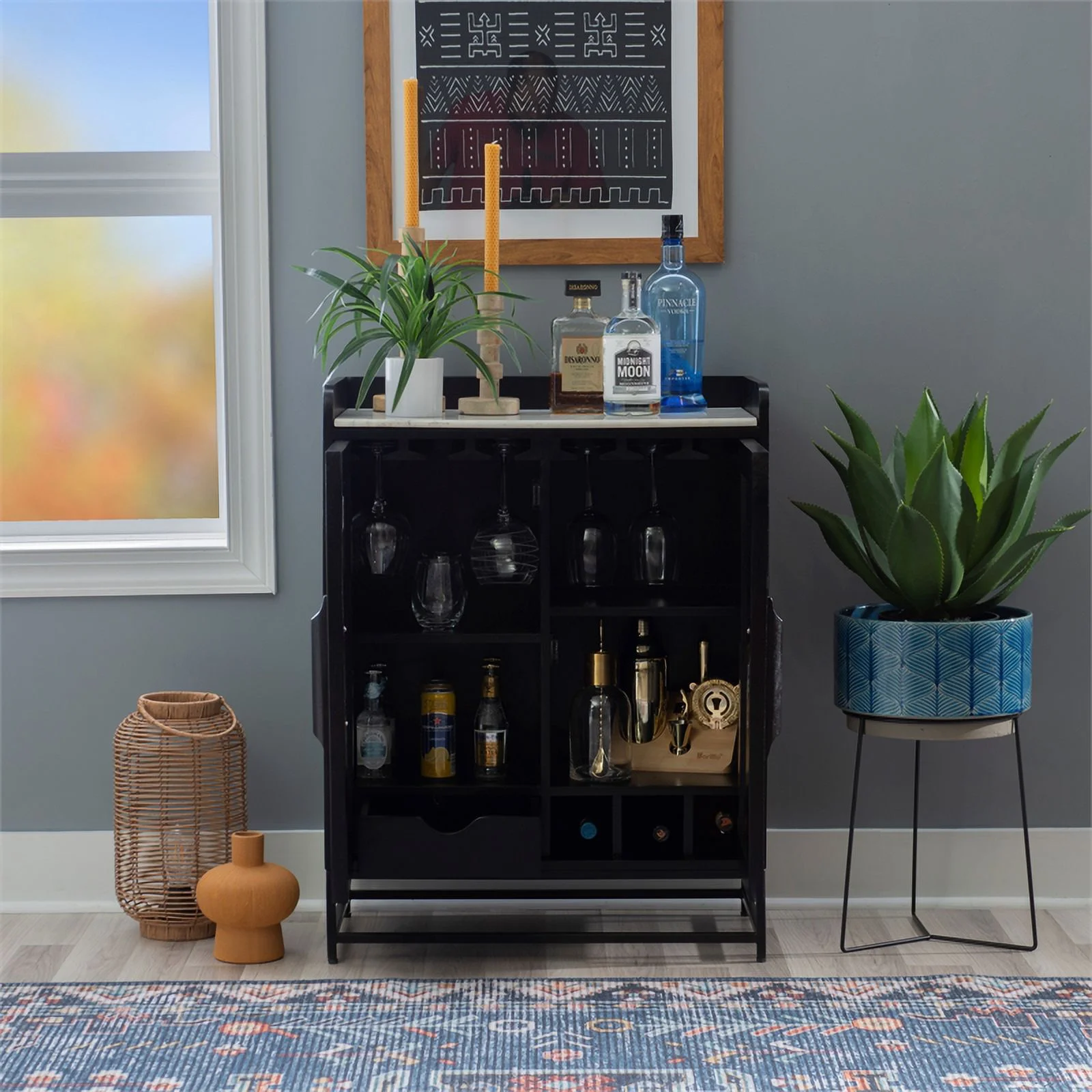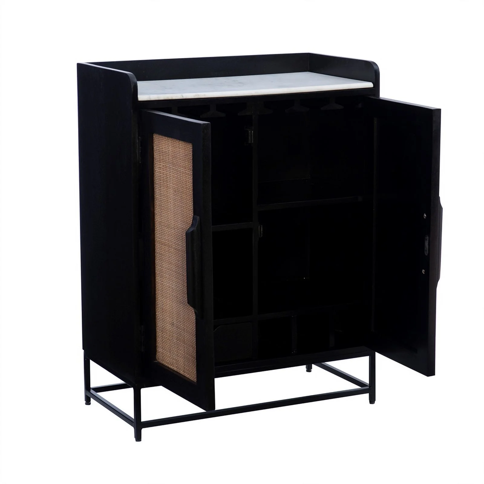 Linon Josie Wood Bar Storage Cabinet White Marble Top Cane Panel Doors in Black