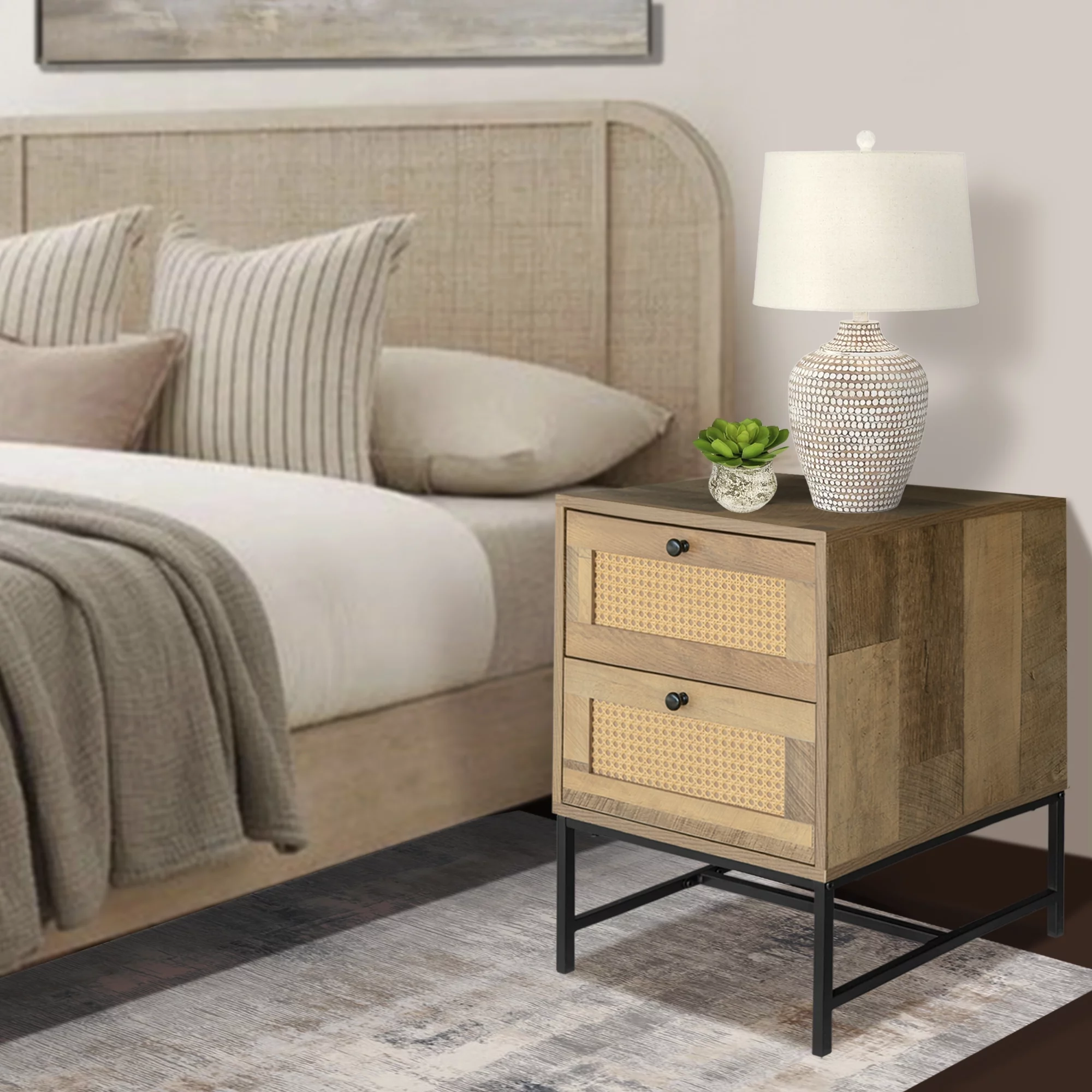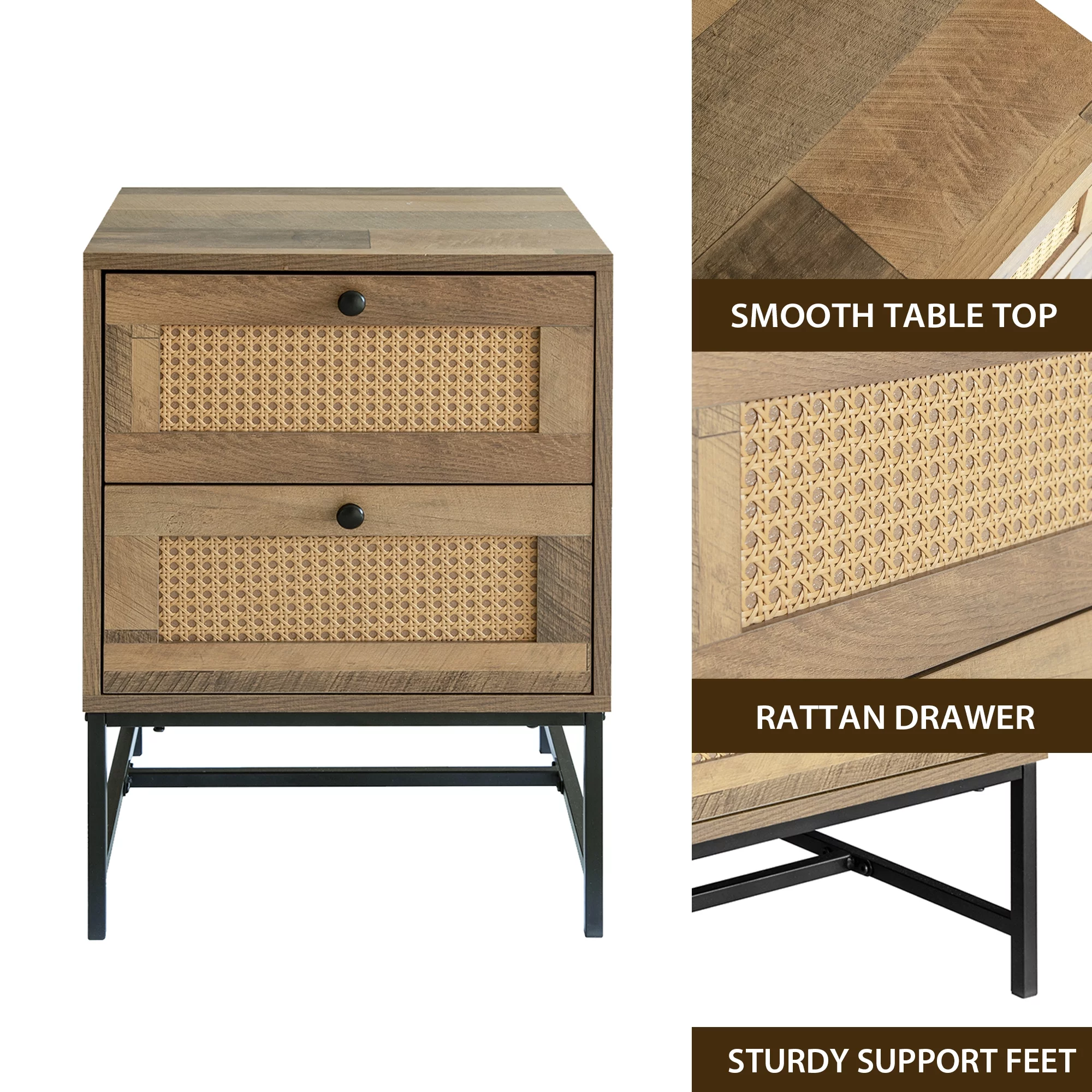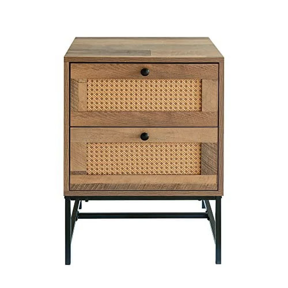GIA Design Group 25 Inch Rattan Nightstand with 2Drawer,End Table with Black Metal Base,Mix Oak