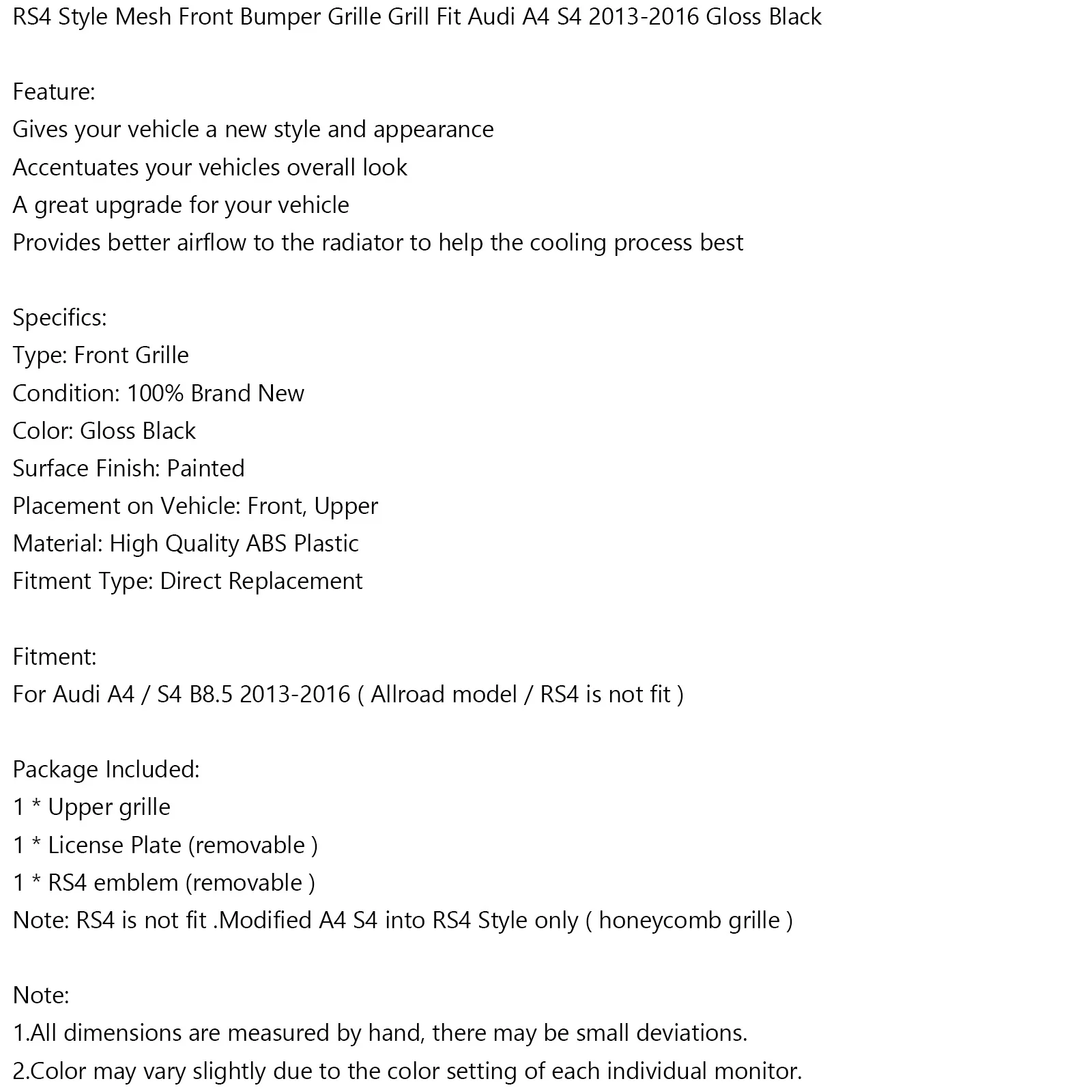 RS4 Style Mesh Front Bumper Grille Grill fit for Audi A4 S4 2013-2016 Gloss Black