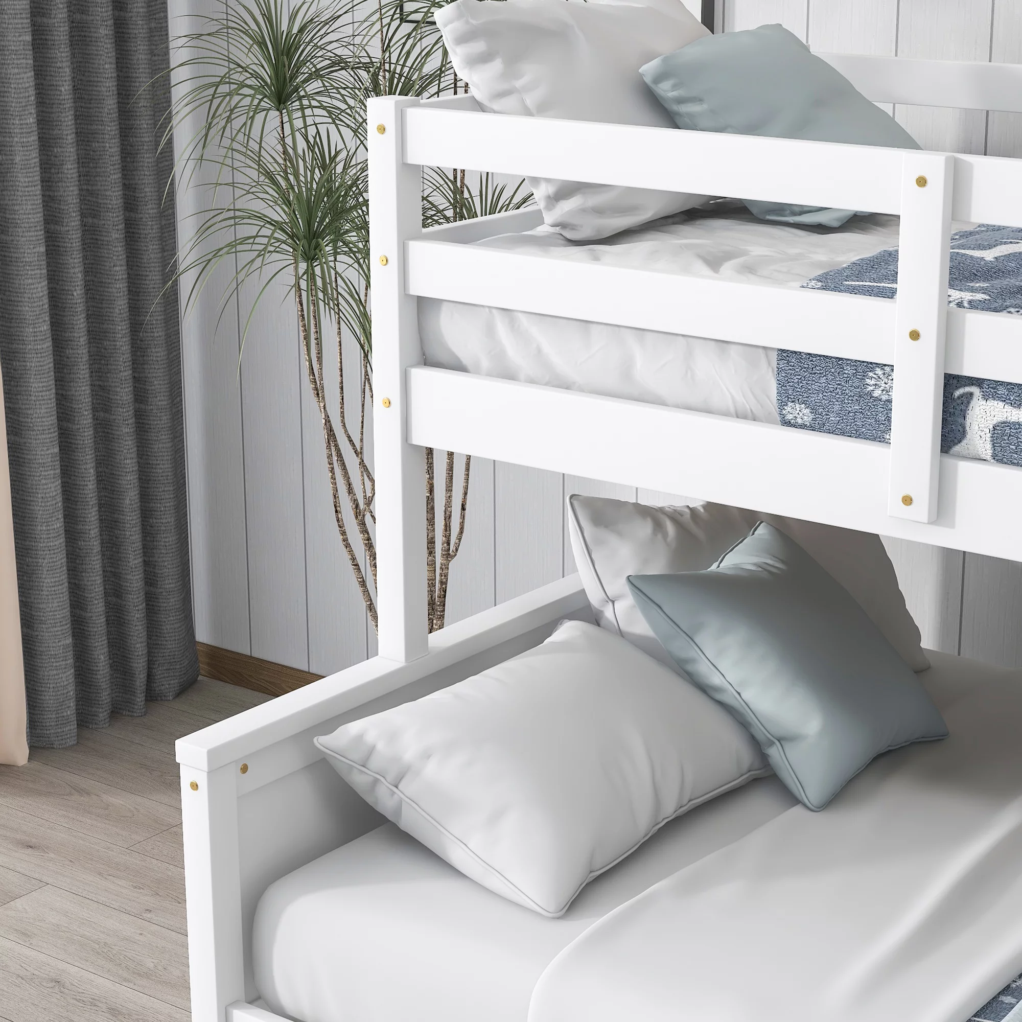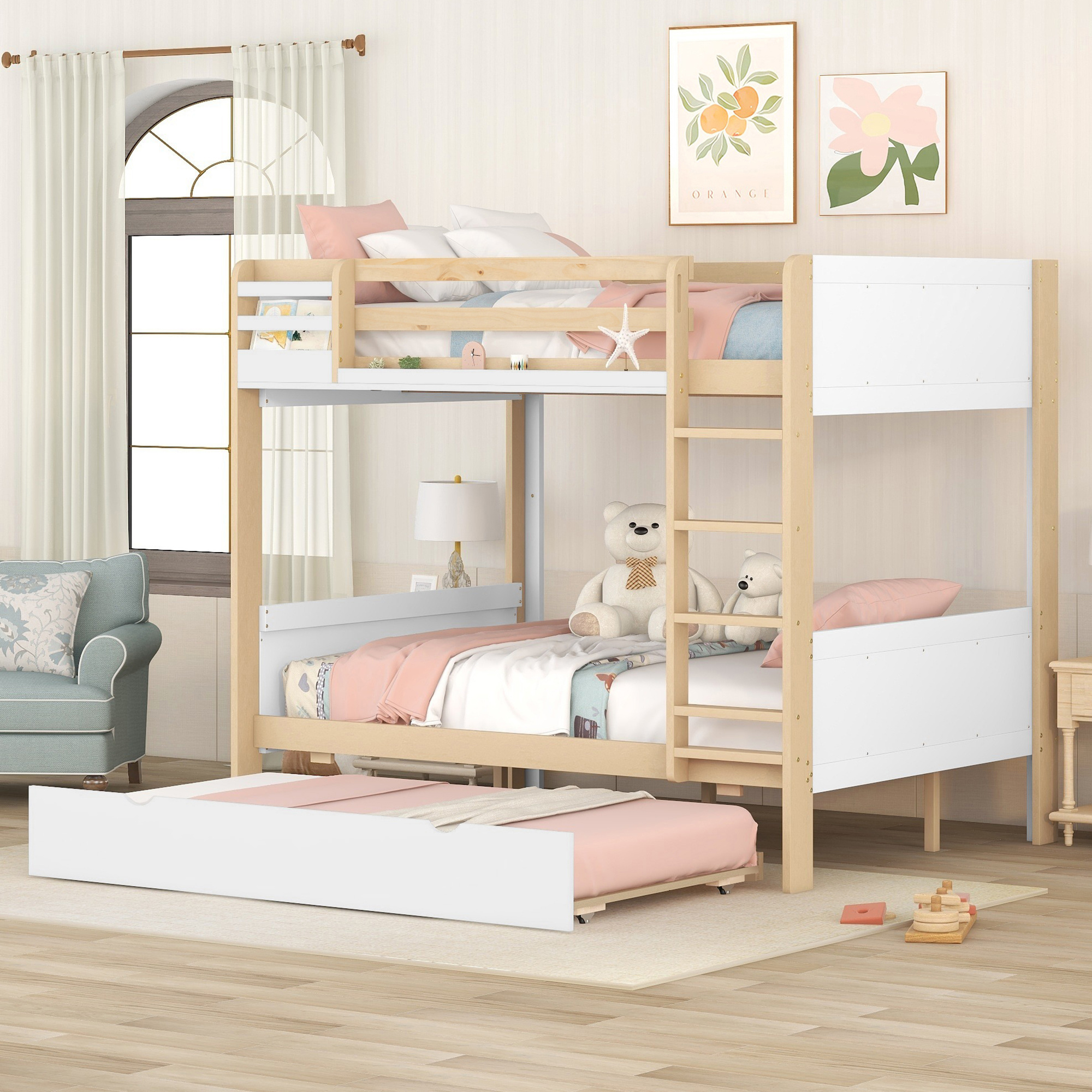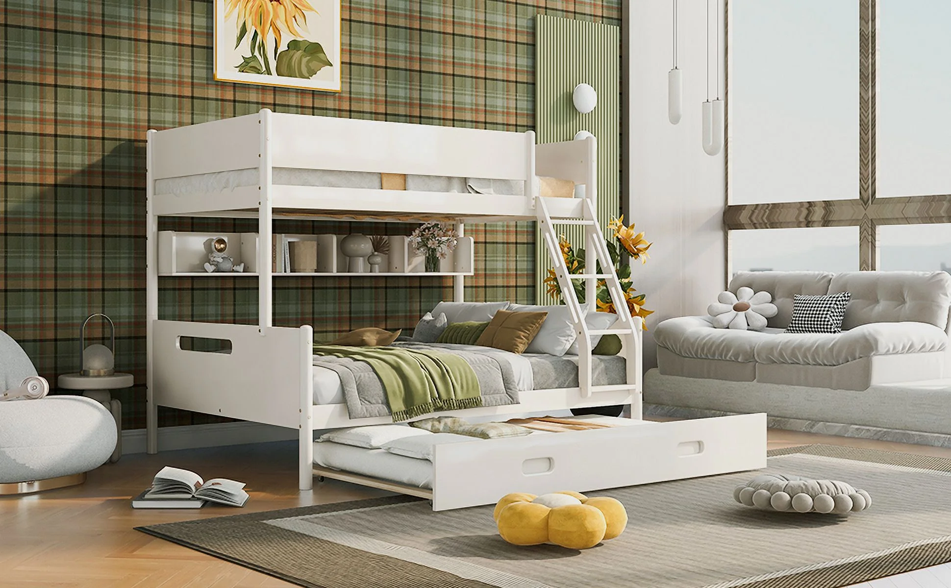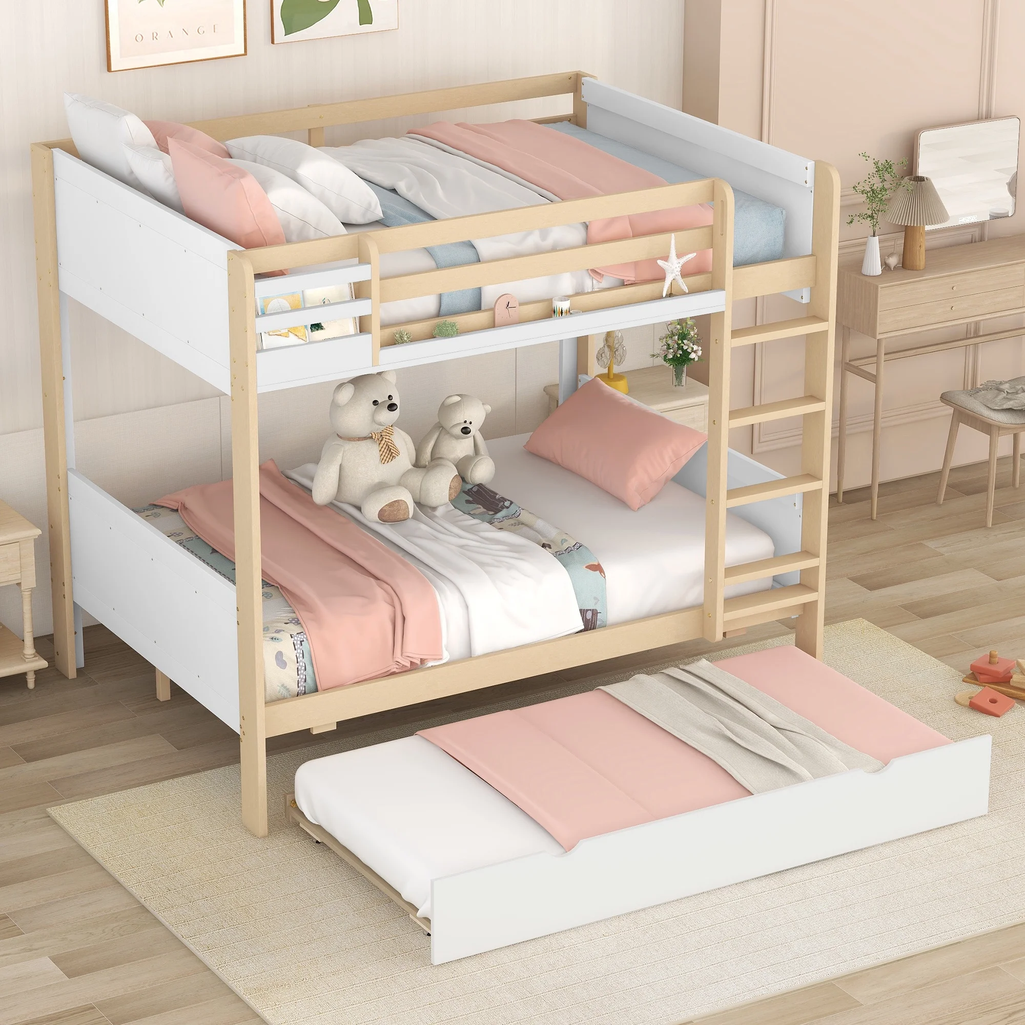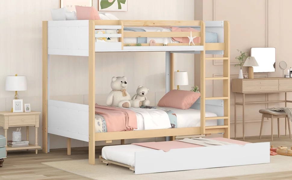 CoSoTower Wood Twin Over Full Bunk Bed with Storage Shelves and Twin Size Trundle, Cream