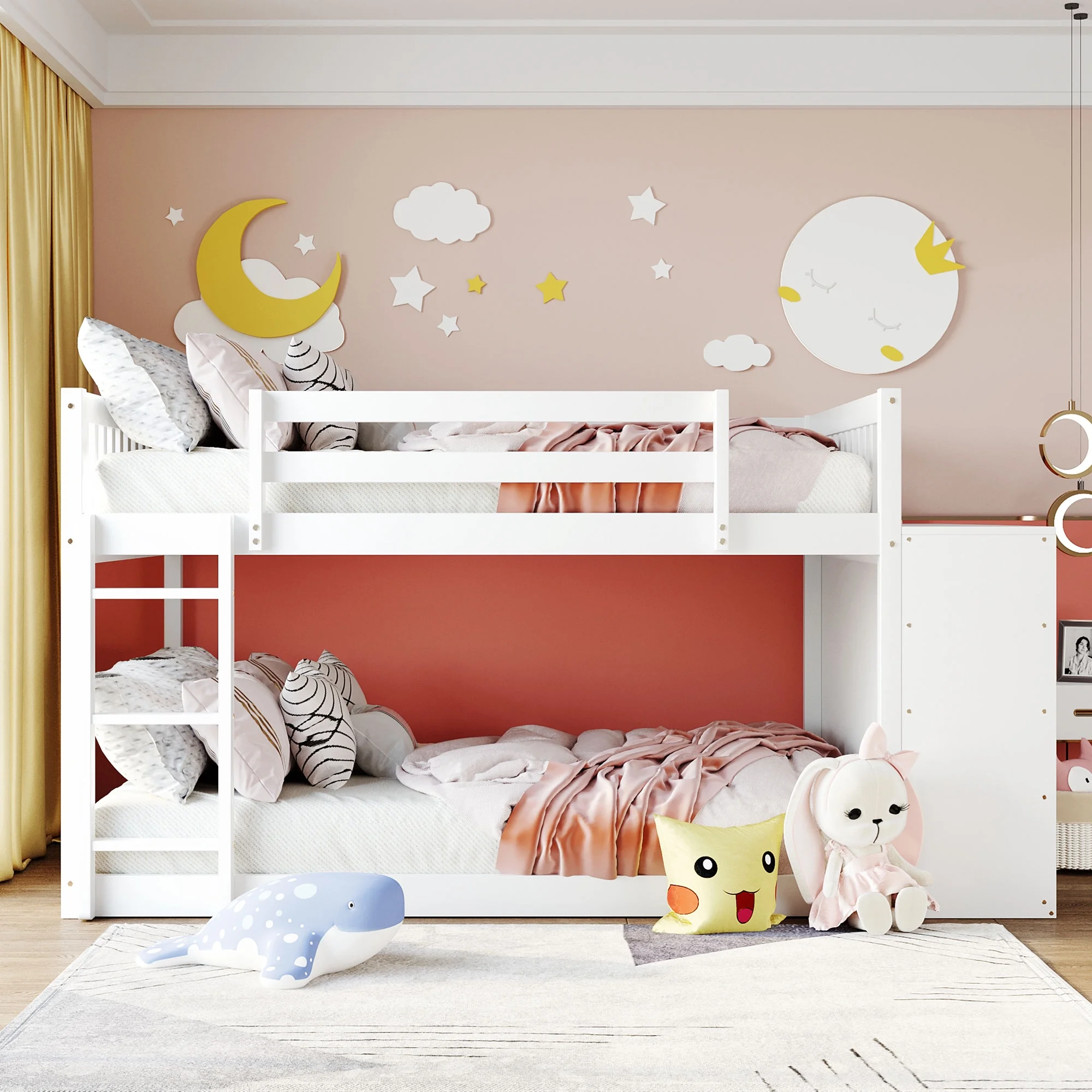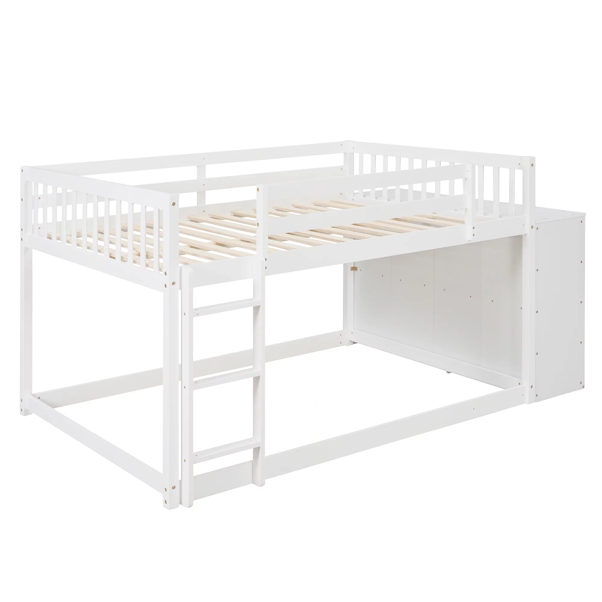 Twin over Twin Bunk Bed with Attached Cabinet and Shelves Storage,White